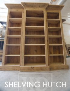 Specs: Custom Reclaimed Wood Shelving Hutch – Crown Molding – Barnwood Hemlock with Greytone Treatment to Preserve Tones of Unfinished – Polyurethane clearcoat finish – 1″ Grainery Board Construction