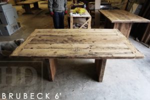 Description: 6 ft Reclaimed Wood Table for Guelph home – 42″ wide – Reclaimed Hemlock Threshing Floor Construction – Premium epoxy/polyurethane finish – Original barnwood edges & distressing maintained – 3″ reclaimed joists plank style base