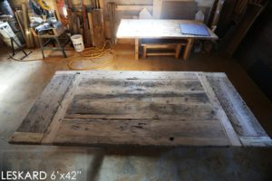 Details: 6 Foot Toronto Reclaimed Wood Table – 42 inches wide – 3′ Plank Post Style Base – Reclaimed Hemlock Threshing Floor Construction – Premium epoxy + satin polyurethane finish – Two 12′ Leaf Extensions – Original edges/barn wood distressing maintained – Two 6 ft [matching] Benches