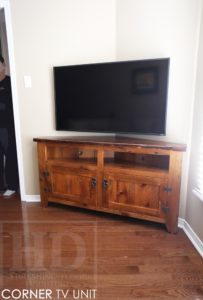 Description: 58″ Reclaimed Wood Corner TV Cabinet – 18″ deep – 30″ height – 135 Degree Custom Corner Shaped – 2 doors – 2 open upper shelves – Lee Valley Hardware – Reclaimed Hemlock Threshing Floor & Grainery Board Construction – Original barn floor board edges maintained – Premium epoxy/polyurethane finish