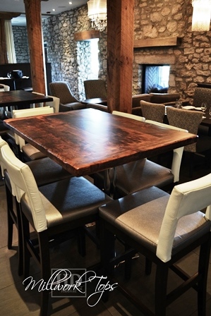 Details: Reclaimed Hemlock Restaurant Tops – 2″ thick – Original barnwood edges maintained – Premium Epoxy / Satin Polyurethane Finish – Original distressing maintained