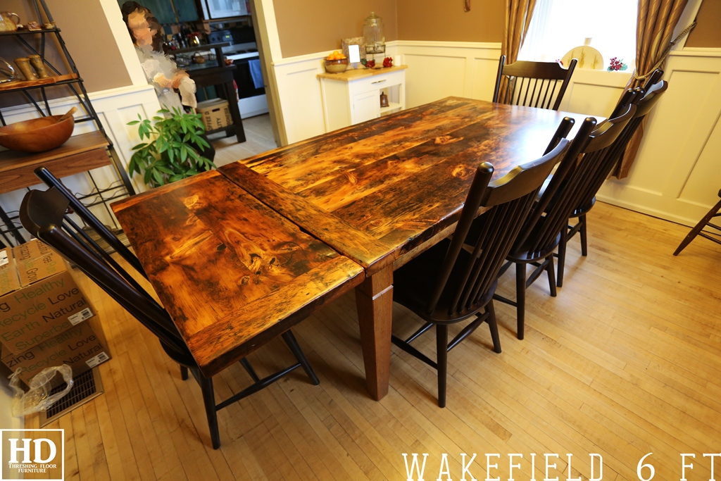 Details of order:Â 6 ft Harvest Table – 42″ wide – Premium epoxy/ matte polyurethane finish – Tapered with a notch legs – two 18″Â leaves making total length 9 ft when extended – Reclaimed Pine