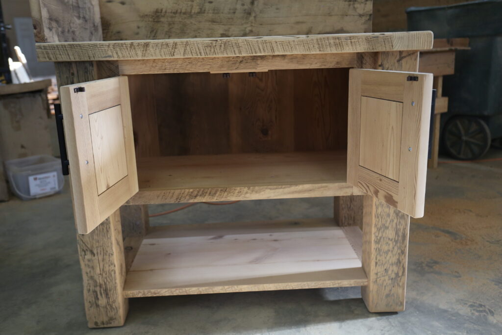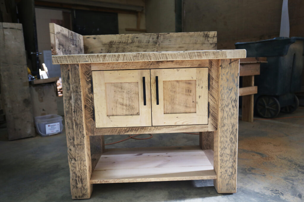 Project Summary: [2] 38″ Ontario Barnwood Vanities – 22″ deep – 31″ height – 6″ height backsplash – 2 Doors – Bottom 1″ Shelf – 4″x4″ Windbrace Beam Corners – Lee Valley Hardware – Lee Valley Hardware – Old Growth Reclaimed Hemlock Threshing Floor & Grainery Board Construction – Original eges & distressing maintained – Unfinished – www.table.ca
