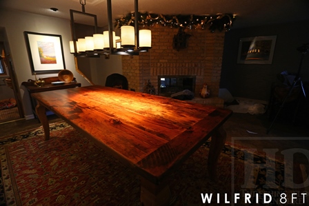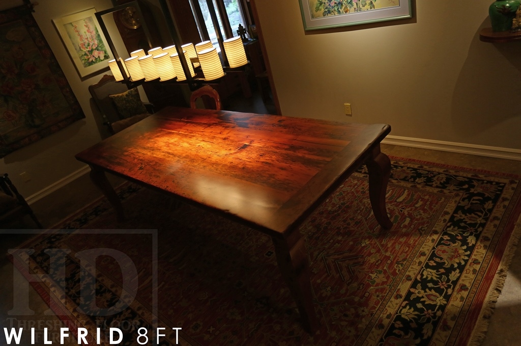 Description: 8 ft Kincardine Harvest Table – 42″ wide – Cabriole Legs – Reclaimed Hemlock Threshing Floor Construction – Premium epoxy/polyurethane finish – Original live barn floor board edges maintained