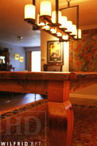 Description: 8 ft Kincardine Harvest Table – 42″ wide – Cabriole Legs – Reclaimed Hemlock Threshing Floor Construction – Premium epoxy/polyurethane finish – Original live barn floor board edges maintained