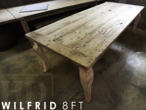 Description: 8 ft Kincardine Harvest Table – 42″ wide – Cabriole Legs – Reclaimed Hemlock Threshing Floor Construction – Premium epoxy/polyurethane finish – Original live barn floor board edges maintained