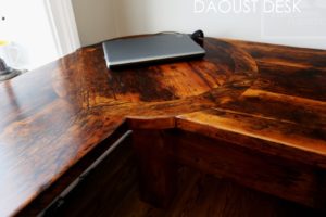 Details: L Shaped Custom Reclaimed Wood Desk – Threshing Floor Walls Base – 5 Drawers – Reclaimed Pine Threshing Floor – Corner Round Bread-edging – Original Barnwood Edges/Distressing Maintained – Lee Valley Hardware – Premium epoxy/polyurethane finishÂÂ