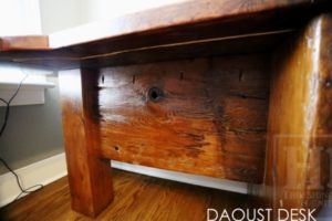 Details: L Shaped Custom Reclaimed Wood Desk – Threshing Floor Walls Base – 5 Drawers – Reclaimed Pine Threshing Floor – Corner Round Bread-edging – Original Barnwood Edges/Distressing Maintained – Lee Valley Hardware – Premium epoxy/polyurethane finishÂÂ