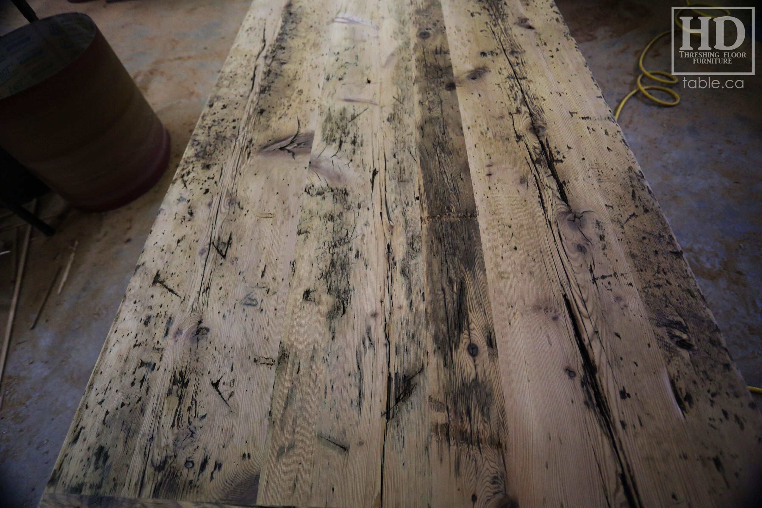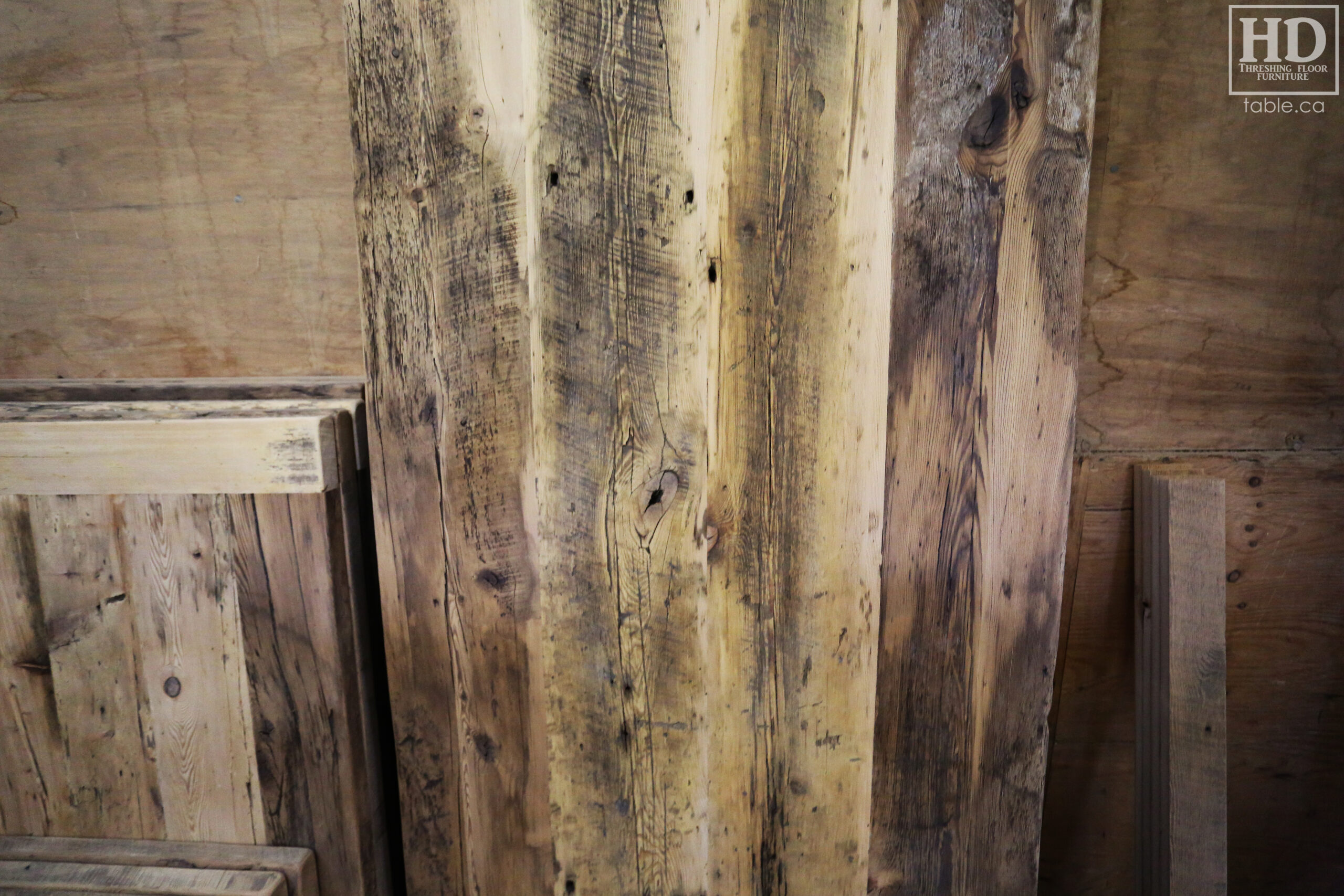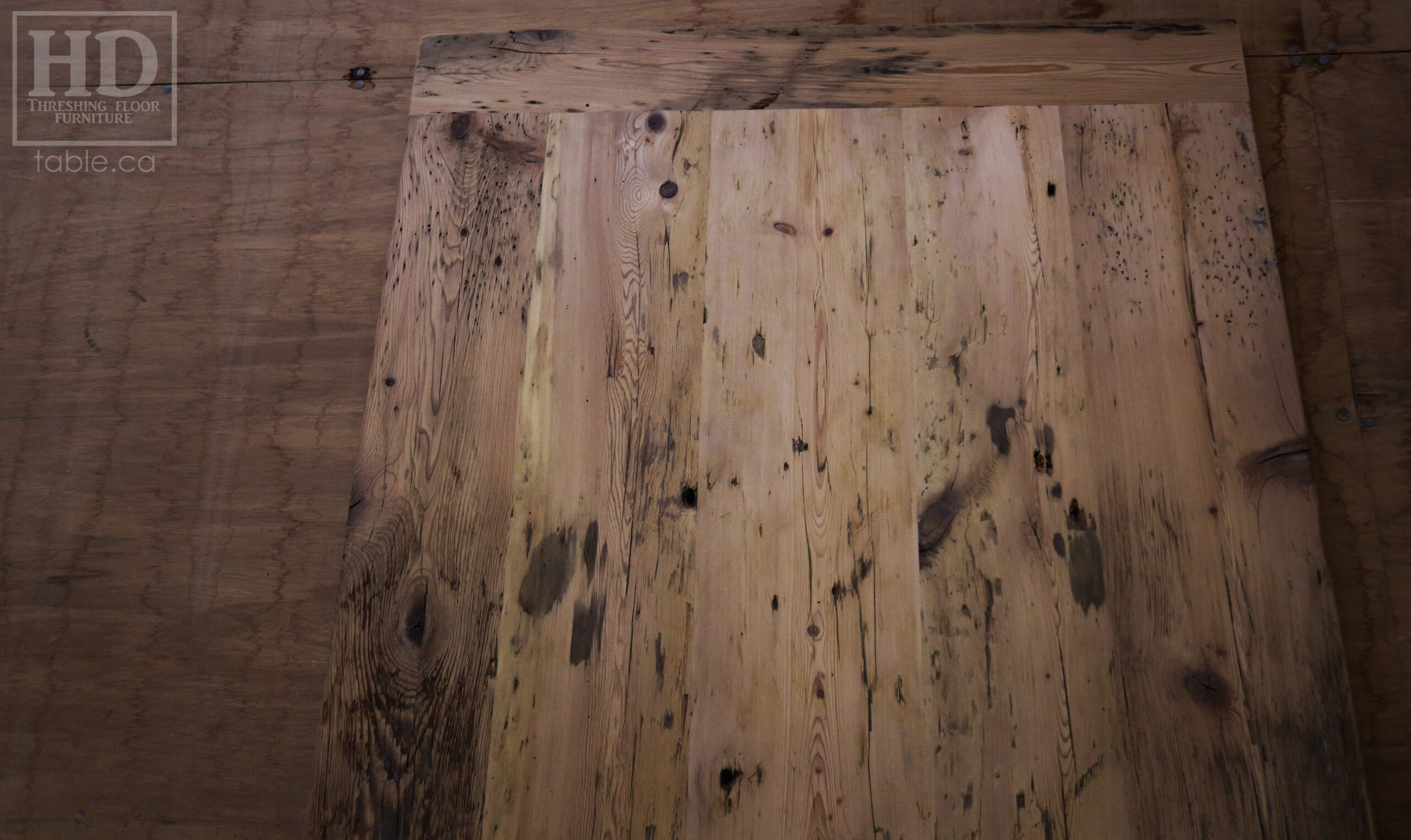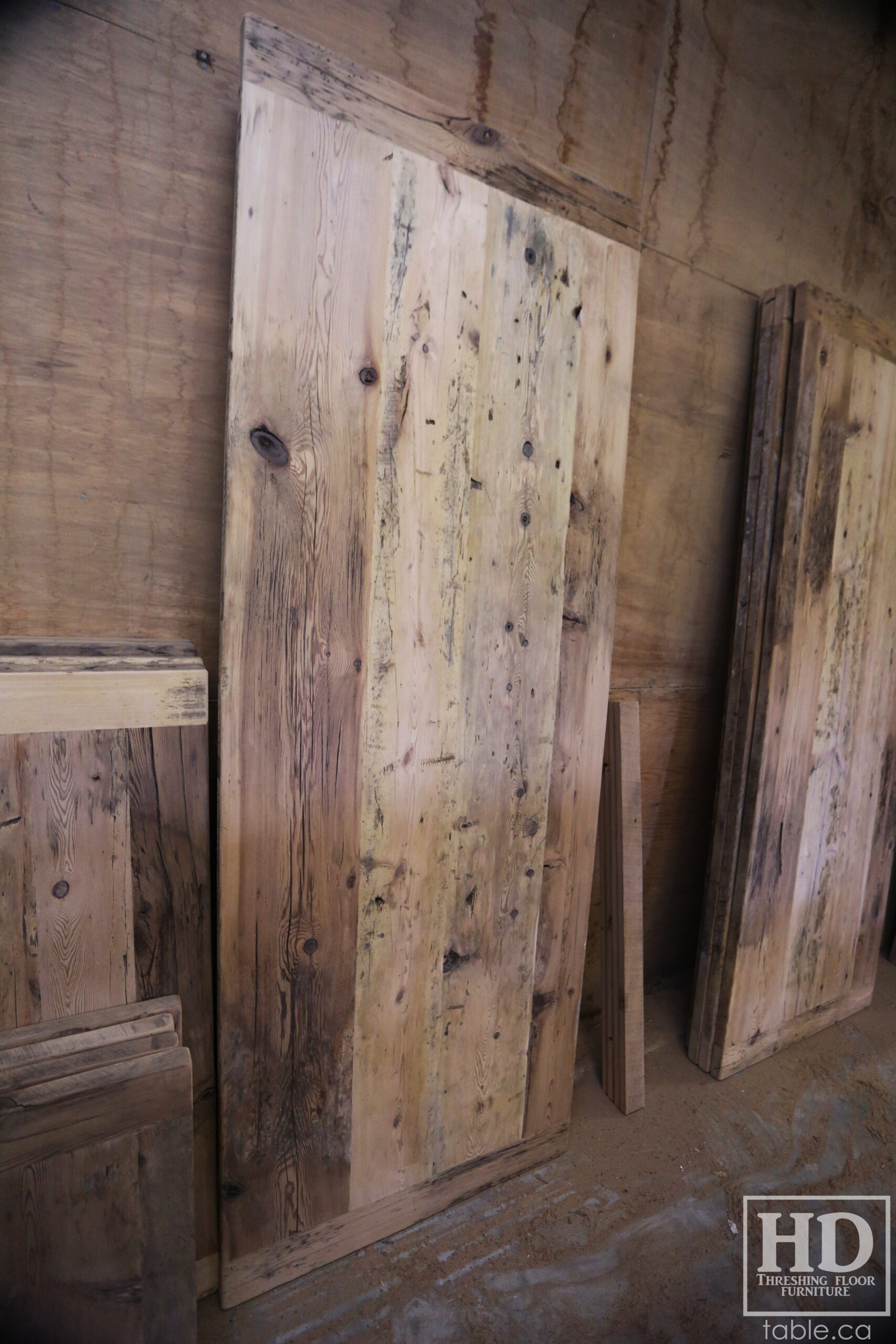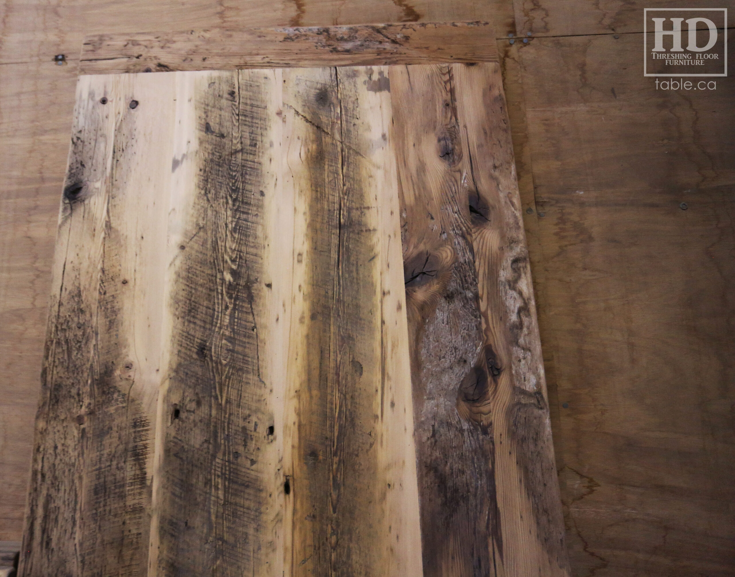 Details: 8′ x 36″ Custom Reclaimed Wood Table Tops – Hemlock Barnwood Threshing Floor 2″ thick Construction – Original edges & distressing kept – Premium clearcoat epoxy + satin polyurethane finish – www.table.ca