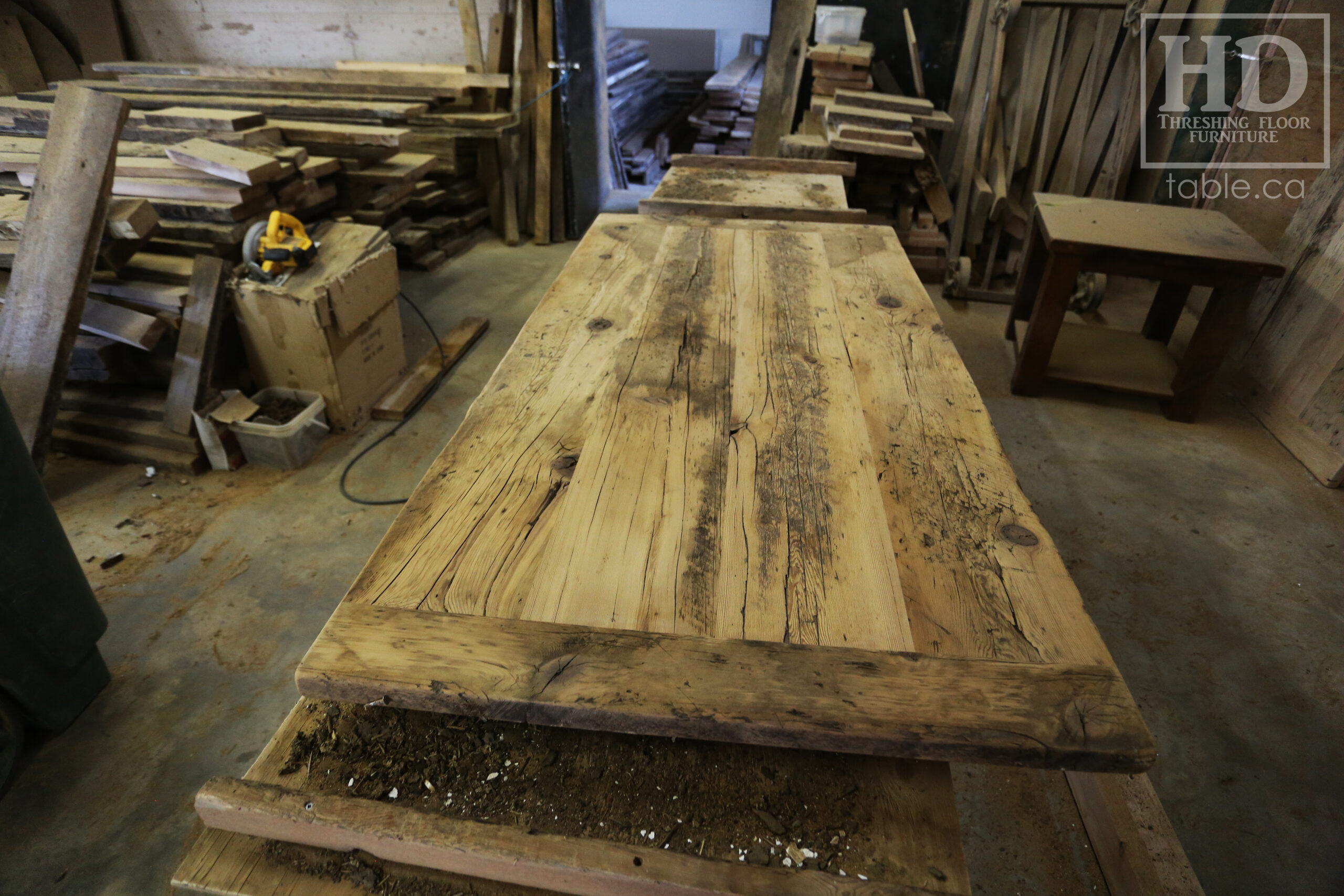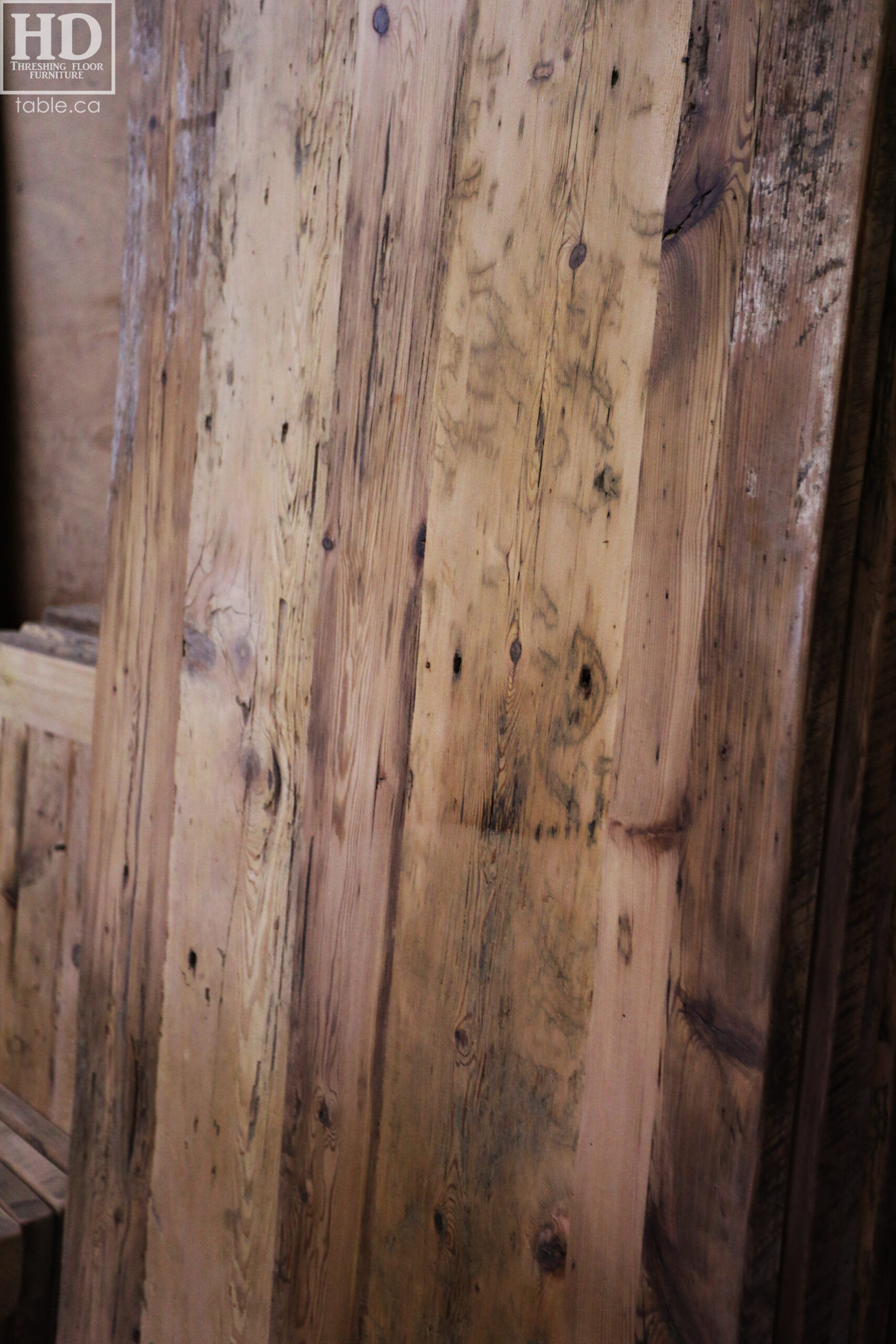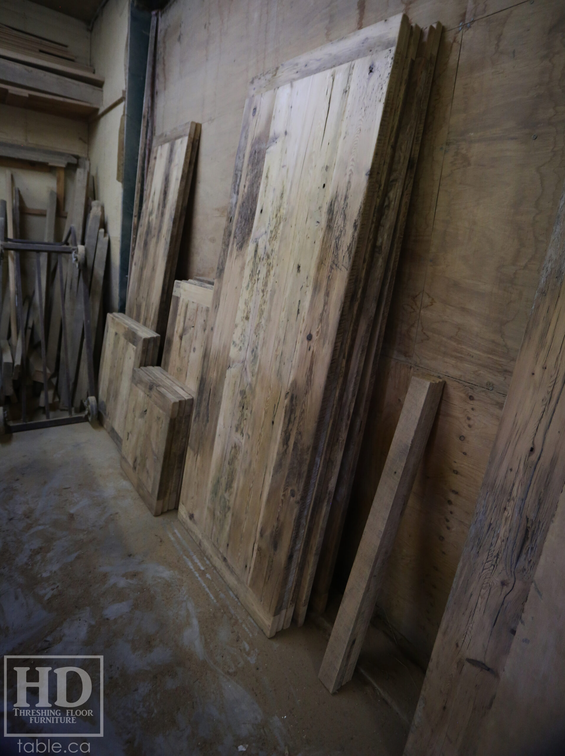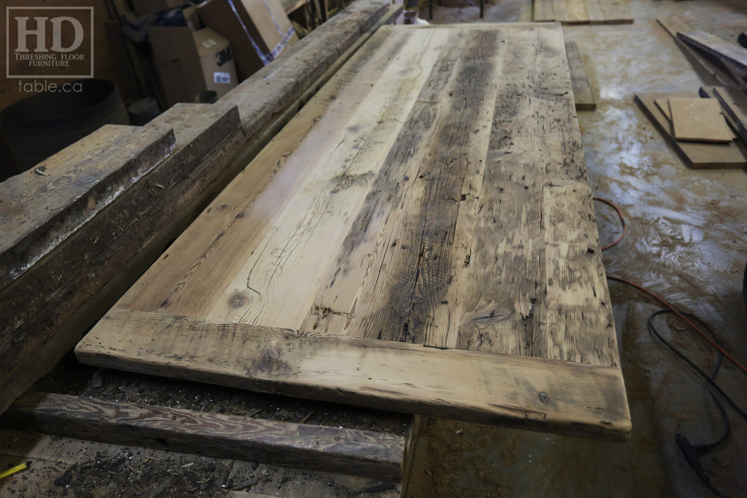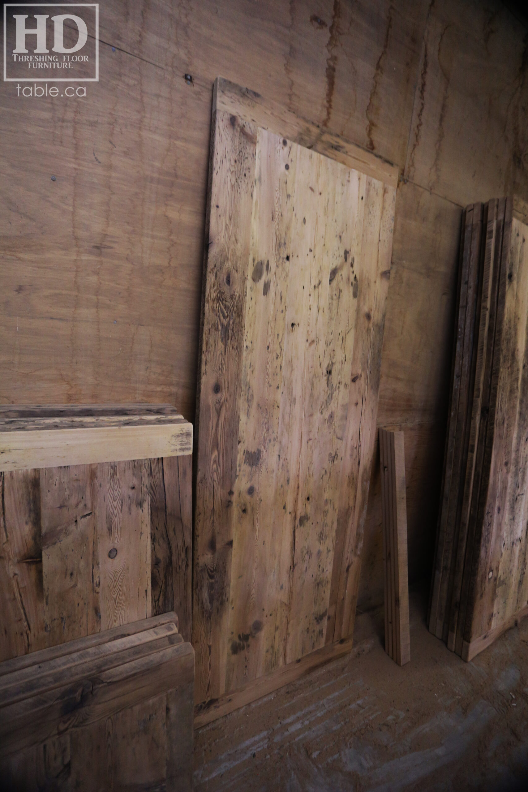 Details: 8′ x 36″ Custom Reclaimed Wood Table Tops – Hemlock Barnwood Threshing Floor 2″ thick Construction – Original edges & distressing kept – Premium clearcoat epoxy + satin polyurethane finish – www.table.ca