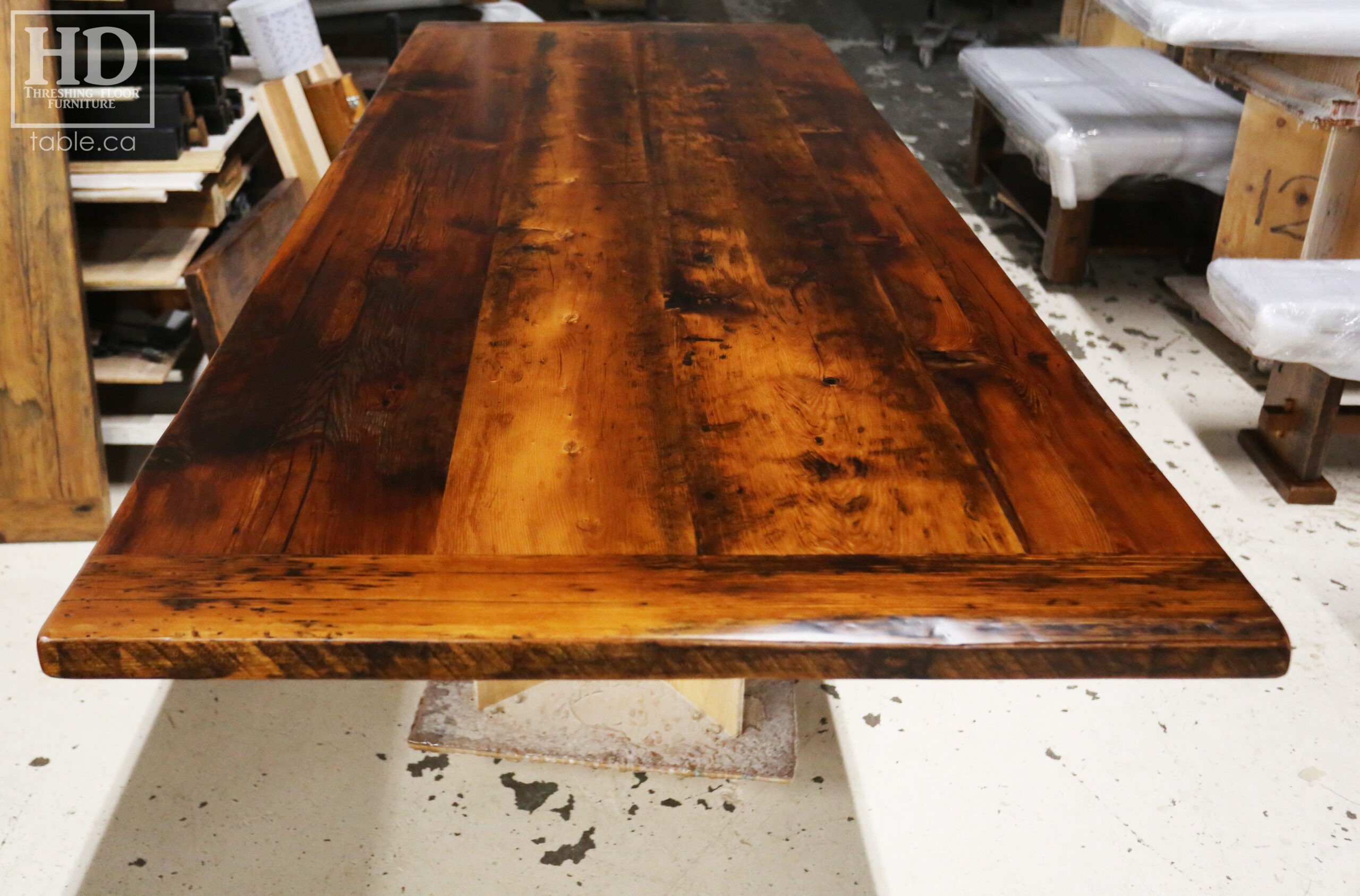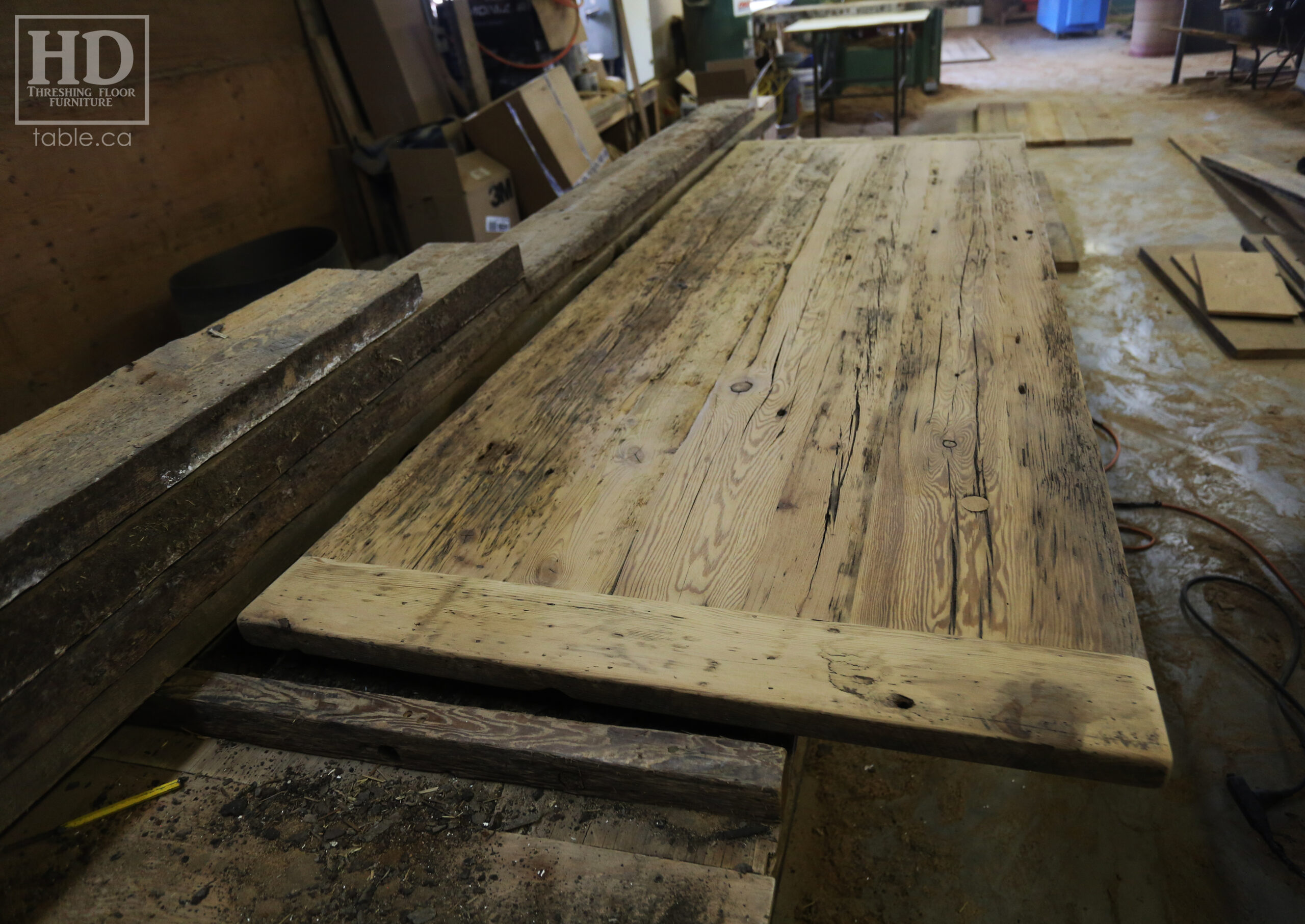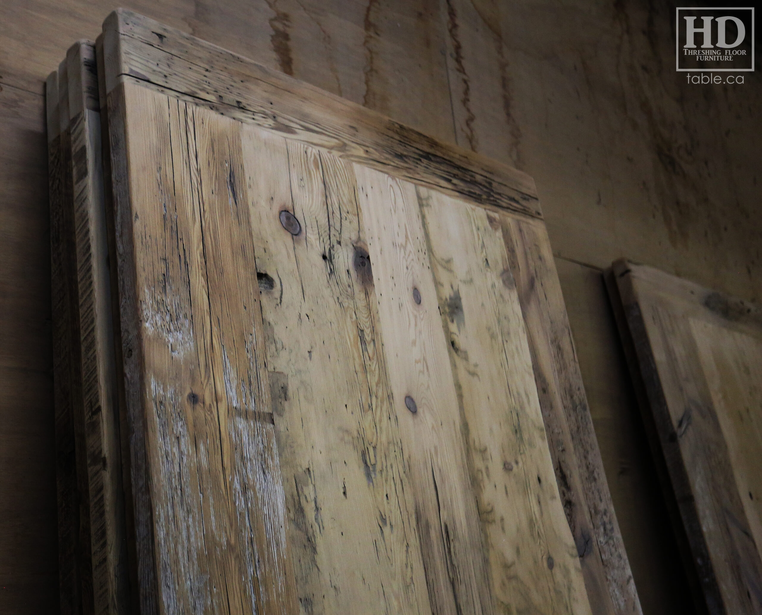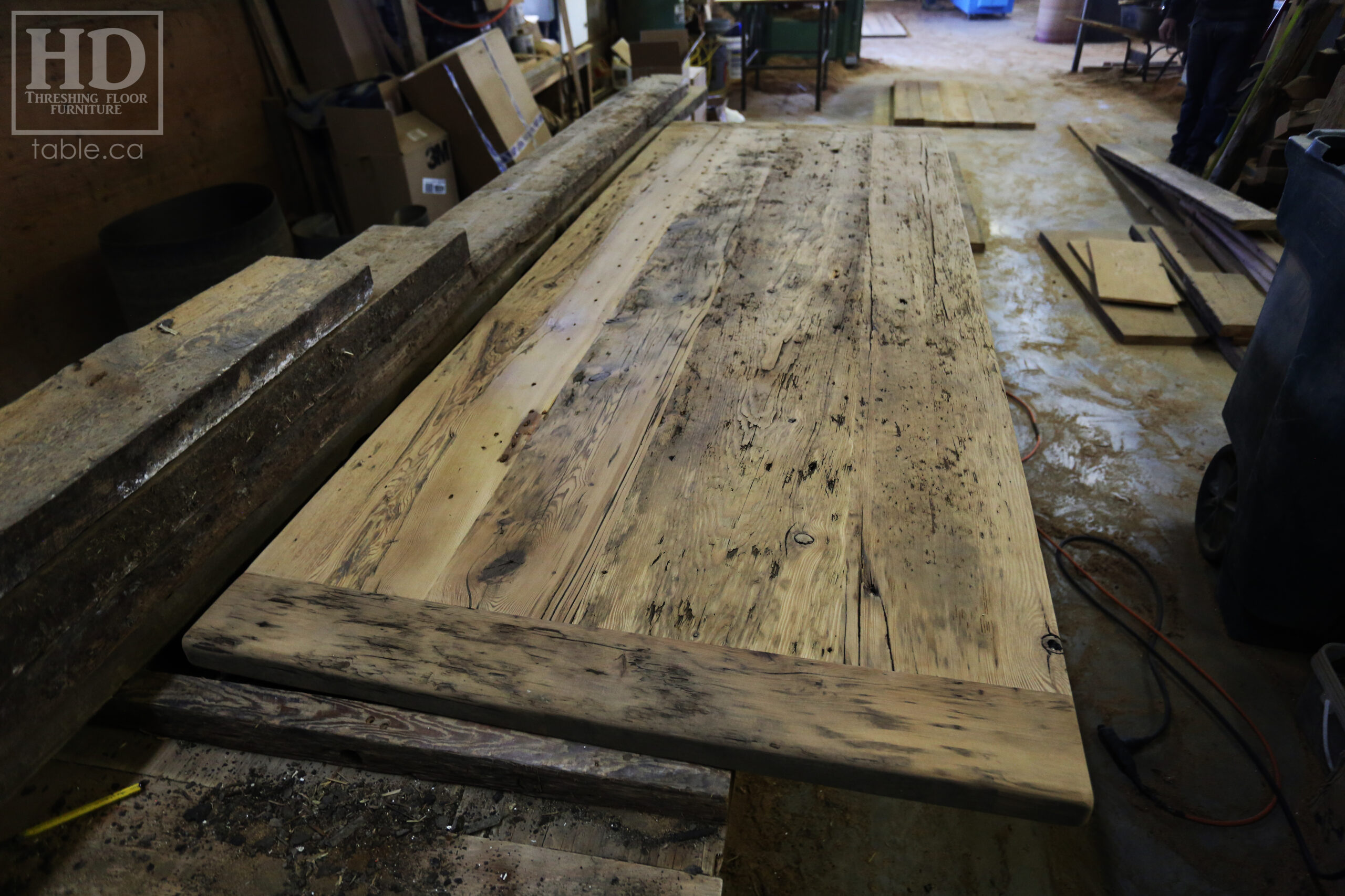 Details: 8′ x 36″ Custom Reclaimed Wood Table Tops – Hemlock Barnwood Threshing Floor 2″ thick Construction – Original edges & distressing kept – Premium clearcoat epoxy + satin polyurethane finish – www.table.ca