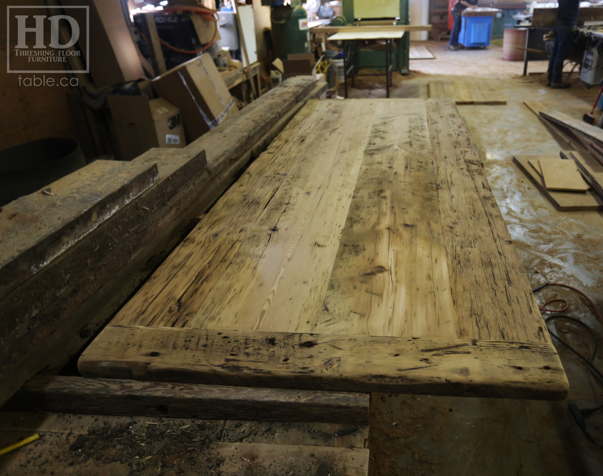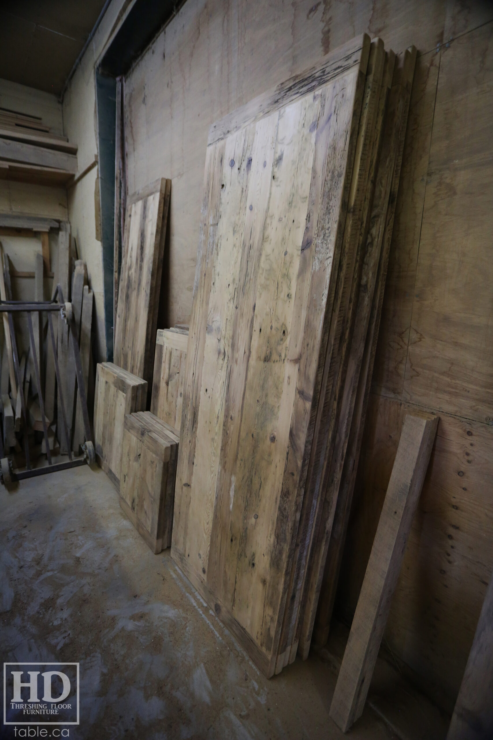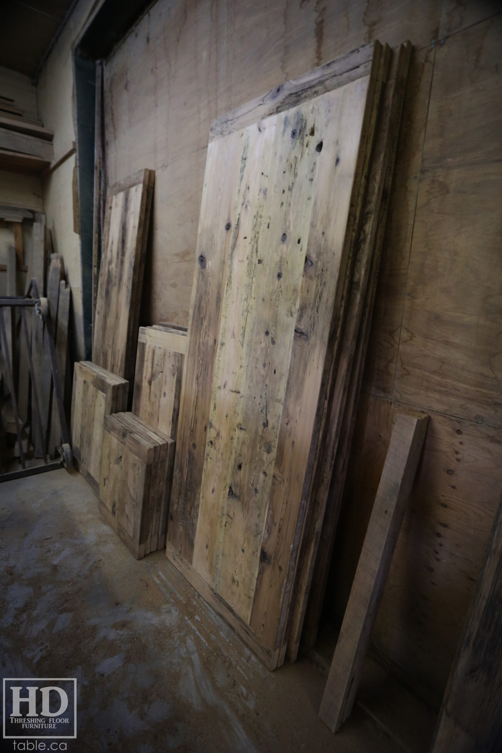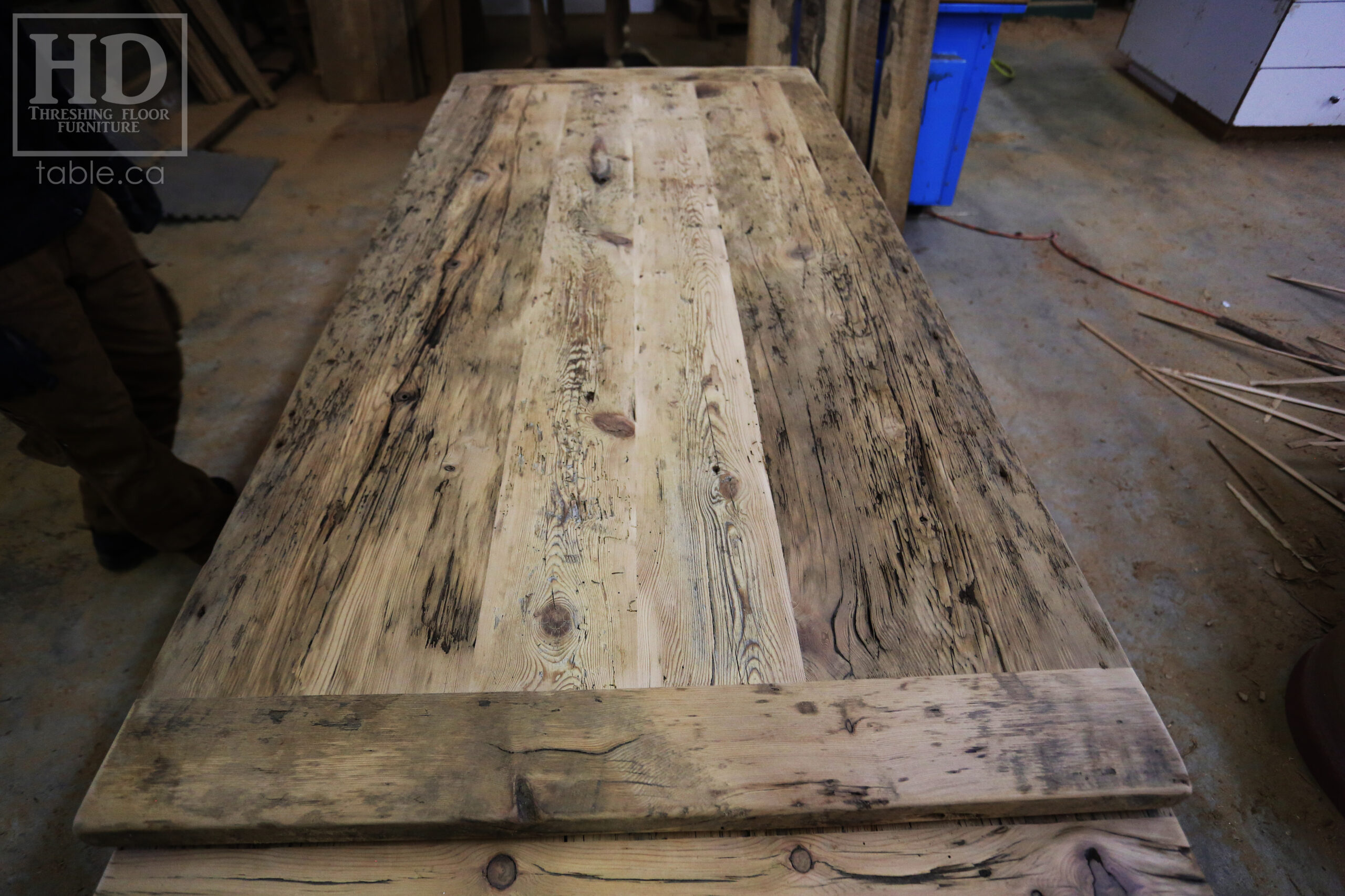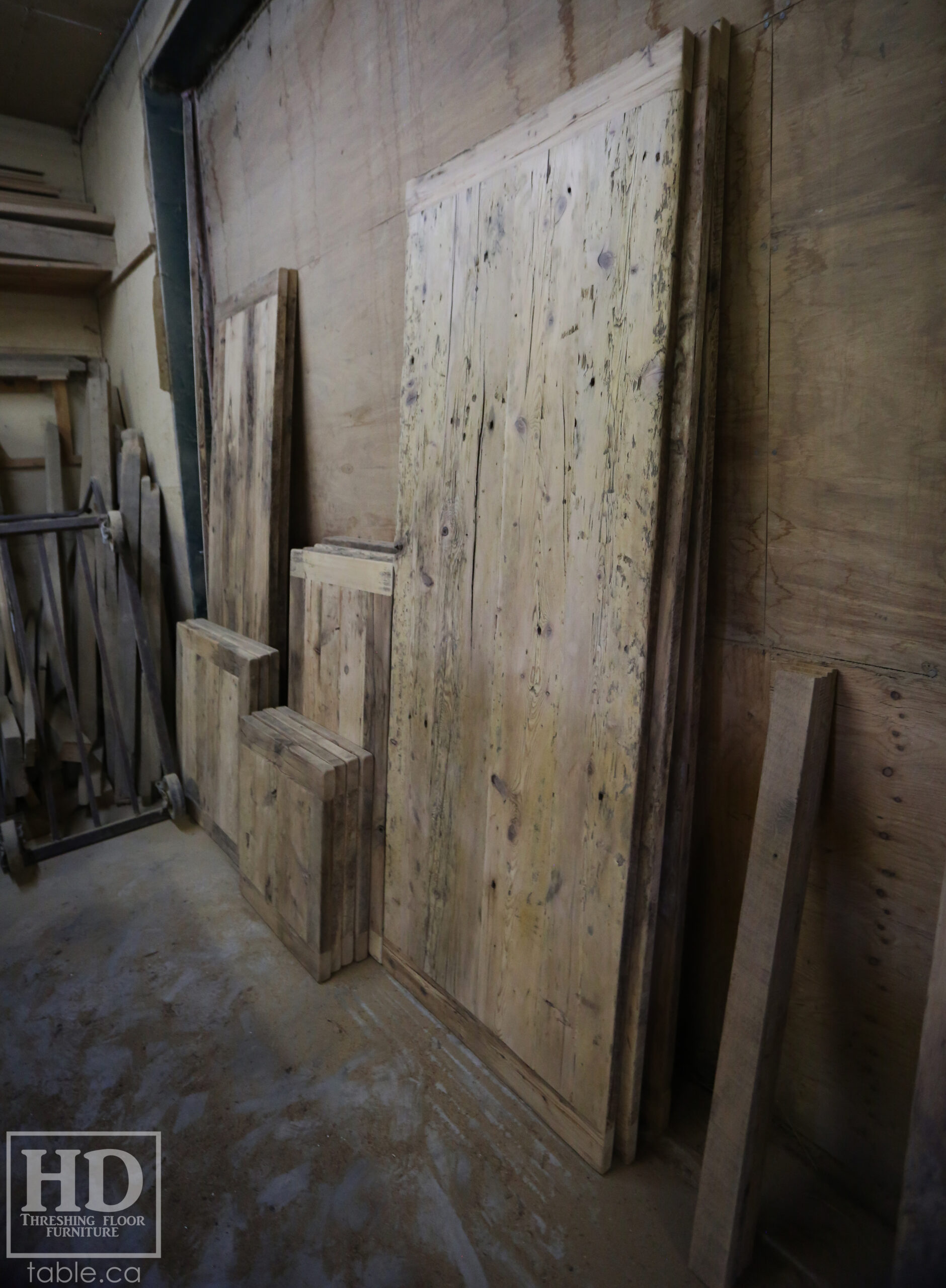 Details: 8′ x 36″ Custom Reclaimed Wood Table Tops – Hemlock Barnwood Threshing Floor 2″ thick Construction – Original edges & distressing kept – Premium clearcoat epoxy + satin polyurethane finish – www.table.ca