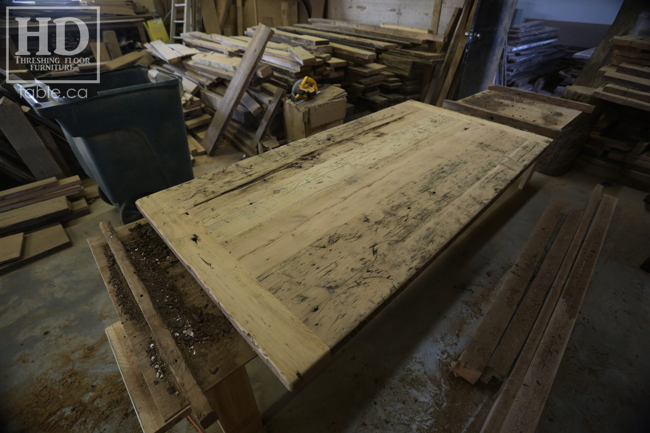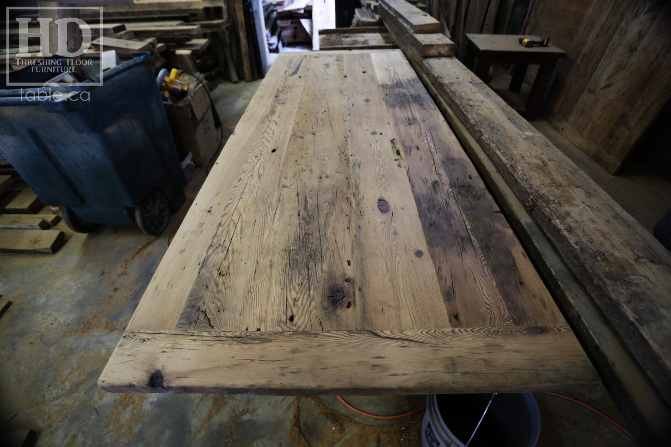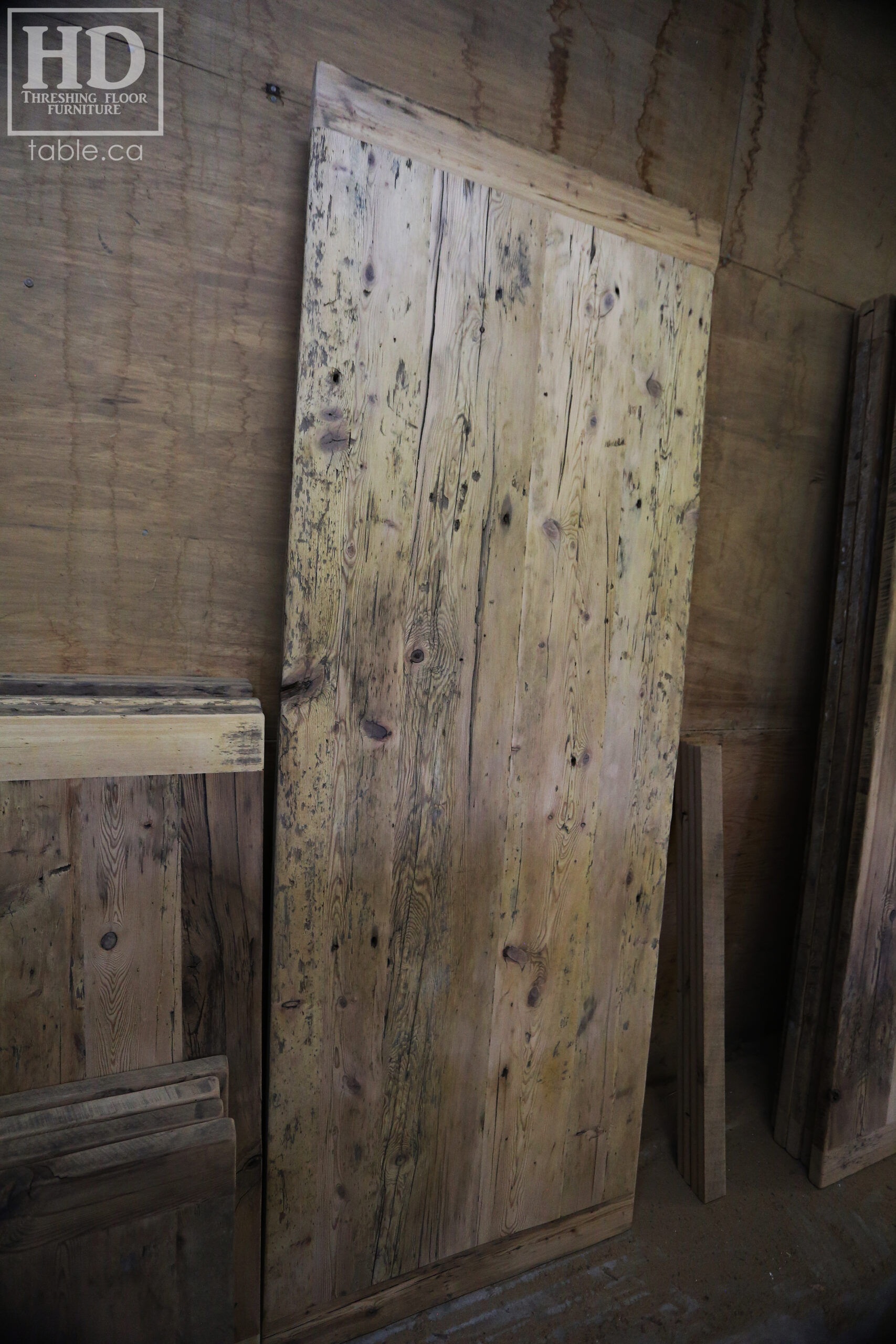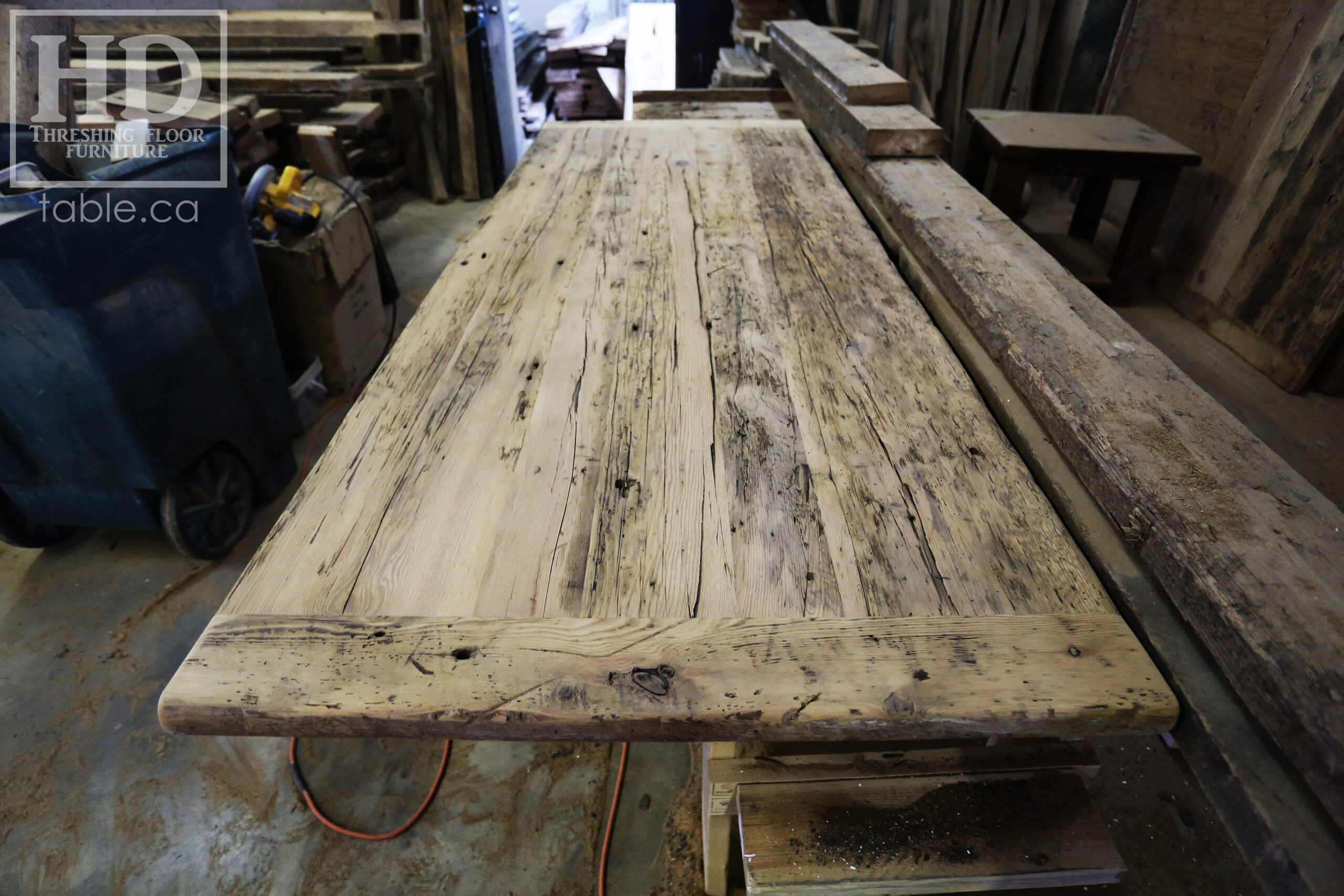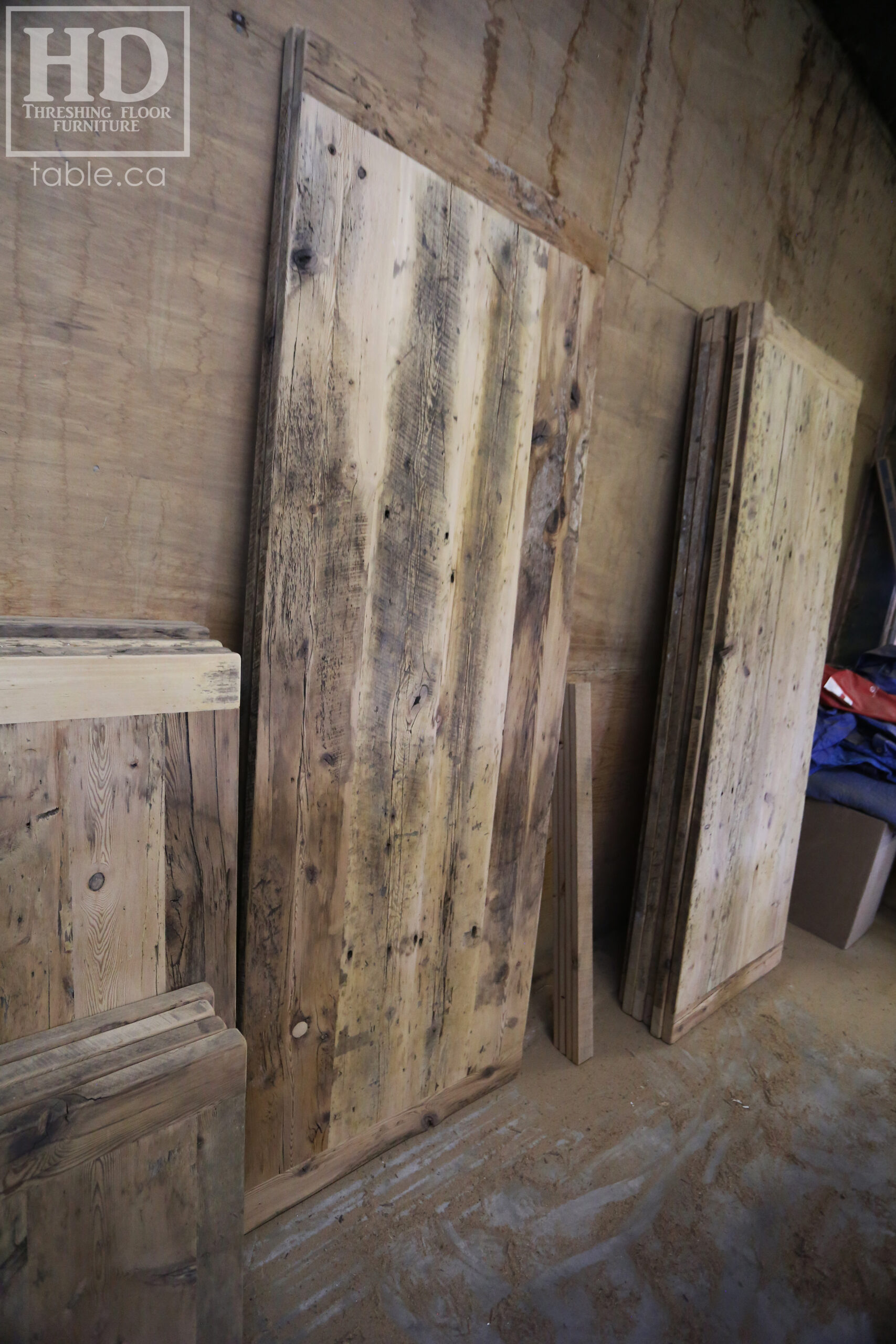 Details: 8′ x 36″ Custom Reclaimed Wood Table Tops – Hemlock Barnwood Threshing Floor 2″ thick Construction – Original edges & distressing kept – Premium clearcoat epoxy + satin polyurethane finish – www.table.ca