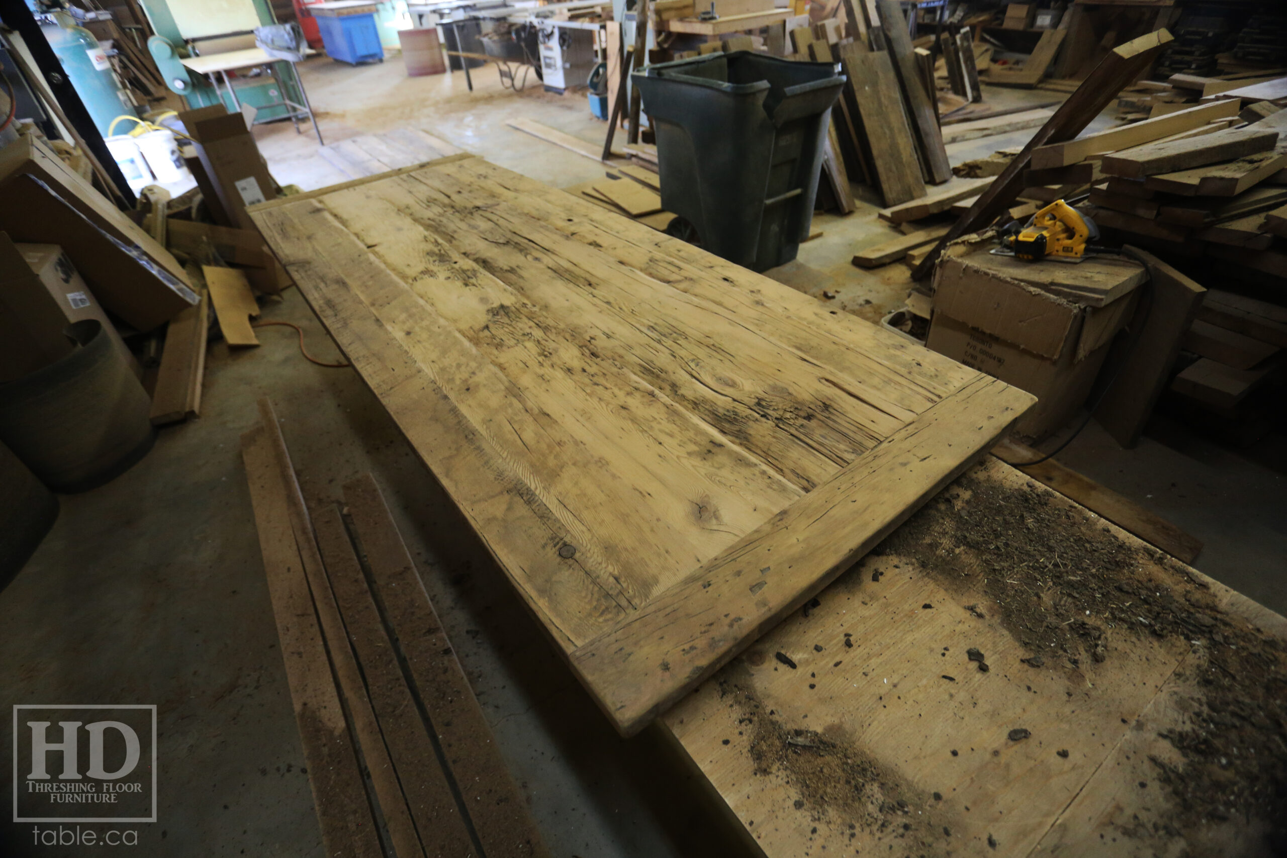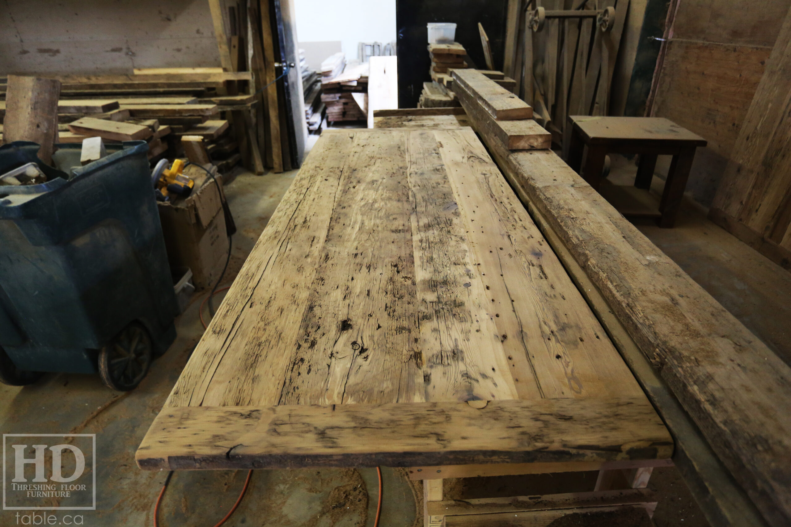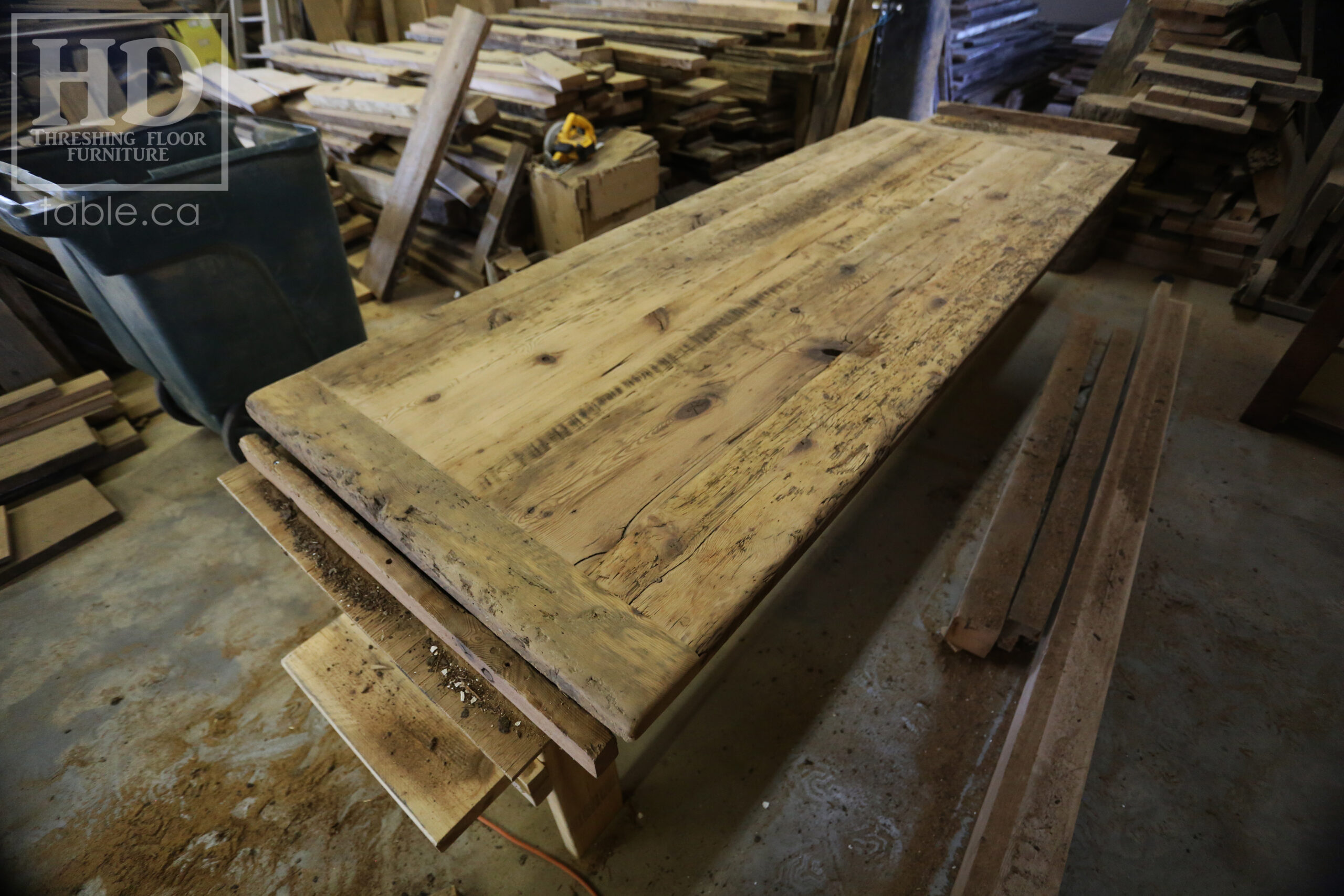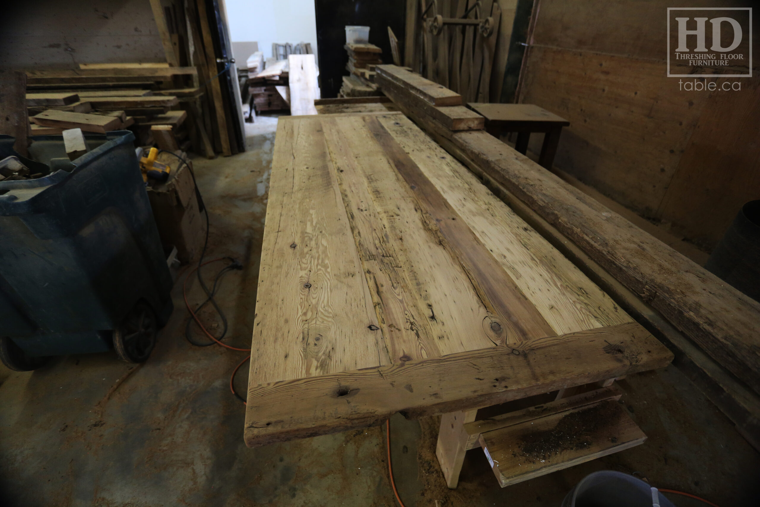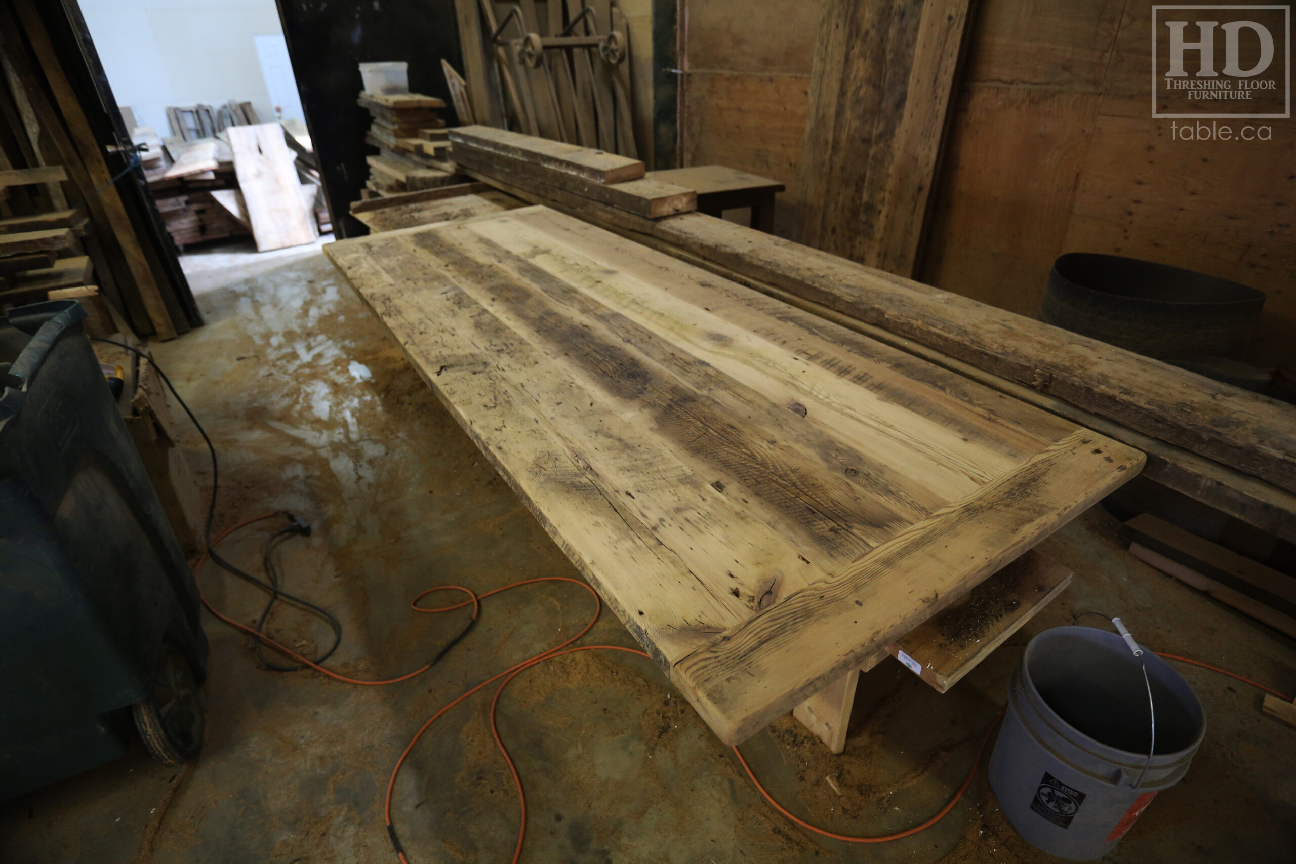 Details: 8′ x 36″ Custom Reclaimed Wood Table Tops – Hemlock Barnwood Threshing Floor 2″ thick Construction – Original edges & distressing kept – Premium clearcoat epoxy + satin polyurethane finish – www.table.ca