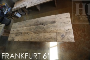 Details: 6 ft Sawbuck Table – 37″ wide – no bread-edge ends – skirting underneath – leaf boards parallel with table boards – Lighter epoxy coating/matte polyurethane finish – drawer on side – two 18″ leaves – Reclaimed Hemlock Threshing Floor board construction