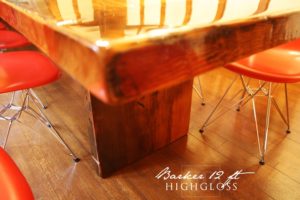 Details: 12 foot Reclaimed Wood Table – 40″ wide – Modern 3″ Plank Post Construction – Premium epoxy/high gloss polyurethane finish – Reclaimed Threshing Floor Hemlock Construction