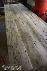 Details: 12 foot Reclaimed Wood Table – 40″ wide – Modern 3″ Plank Post Construction – Premium epoxy/high gloss polyurethane finish – Reclaimed Threshing Floor Hemlock Construction