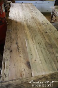Details: 12 foot Reclaimed Wood Table – 40″ wide – Modern 3″ Plank Post Construction – Premium epoxy/high gloss polyurethane finish – Reclaimed Threshing Floor Hemlock Construction