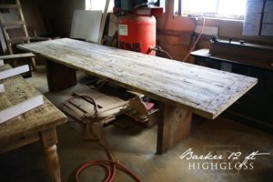 Details: 12 foot Reclaimed Wood Table – 40″ wide – Modern 3″ Plank Post Construction – Premium epoxy/high gloss polyurethane finish – Reclaimed Threshing Floor Hemlock Construction