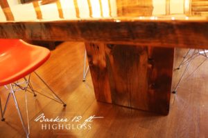 Details: 12 foot Reclaimed Wood Table – 40″ wide – Modern 3″ Plank Post Construction – Premium epoxy/high gloss polyurethane finish – Reclaimed Threshing Floor Hemlock Construction