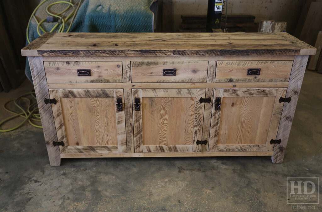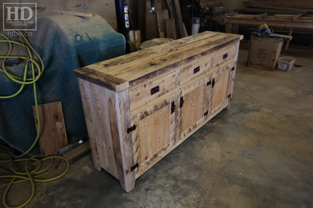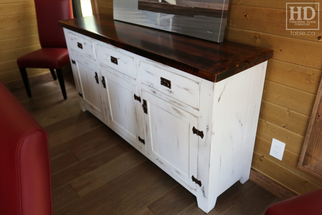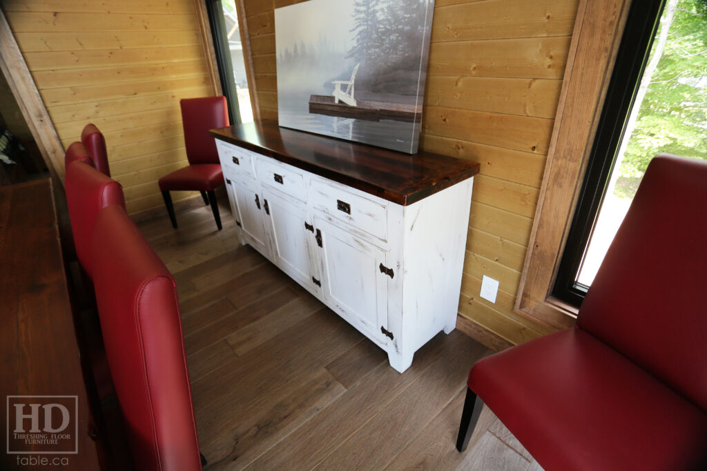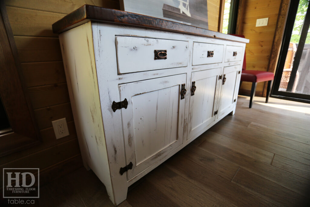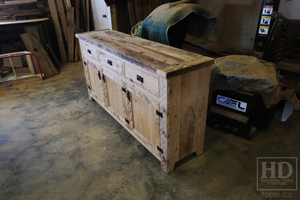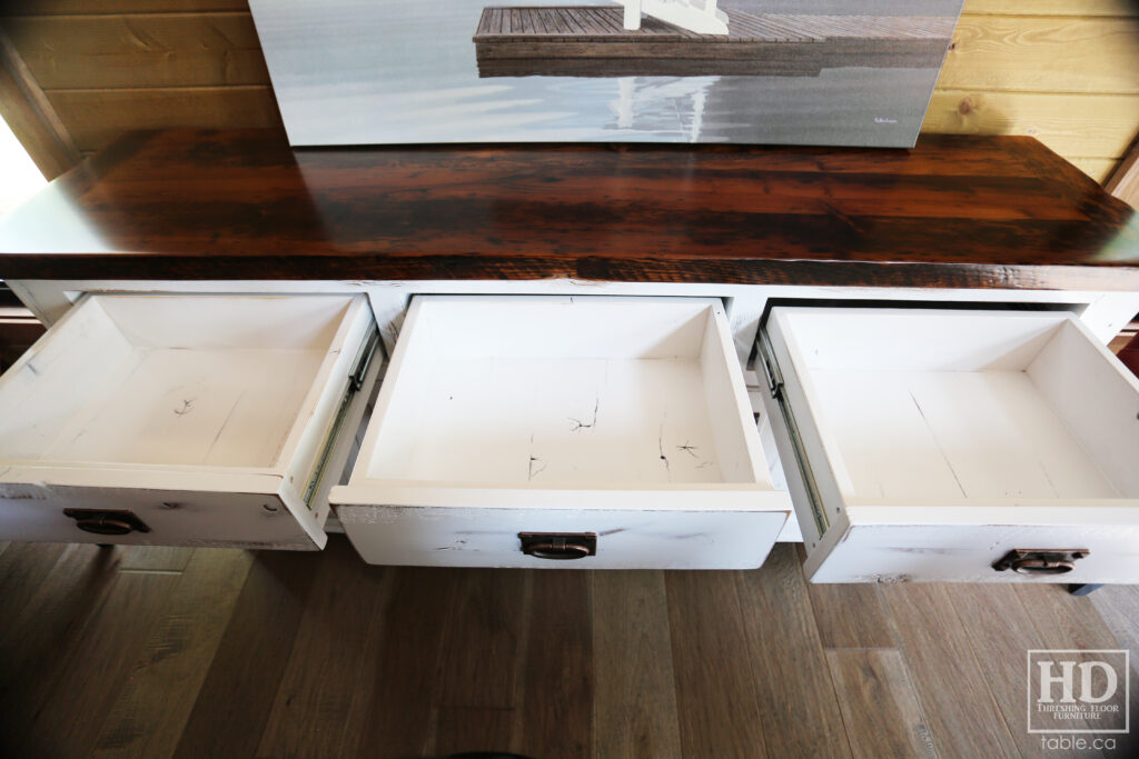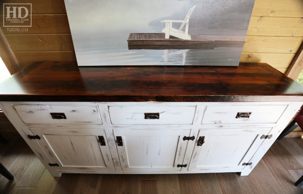 Project Summary: 6′ Ontario Barnwood Buffet we made for a Muskoka Cottage – 36″ height – 18″ deep – 3 Drawers / 3 Doors – Adjustable Shelving Inside – Reclaimed Old Growth Hemlock Threshing Floor + Grainery Board Construction – Original edges + distressing kept – White Painted with Sandthroughs Option Base – Mission Cast Brass Lee Valley Hardware – Premium epoxy + satin polyurethane finish – www.table.ca