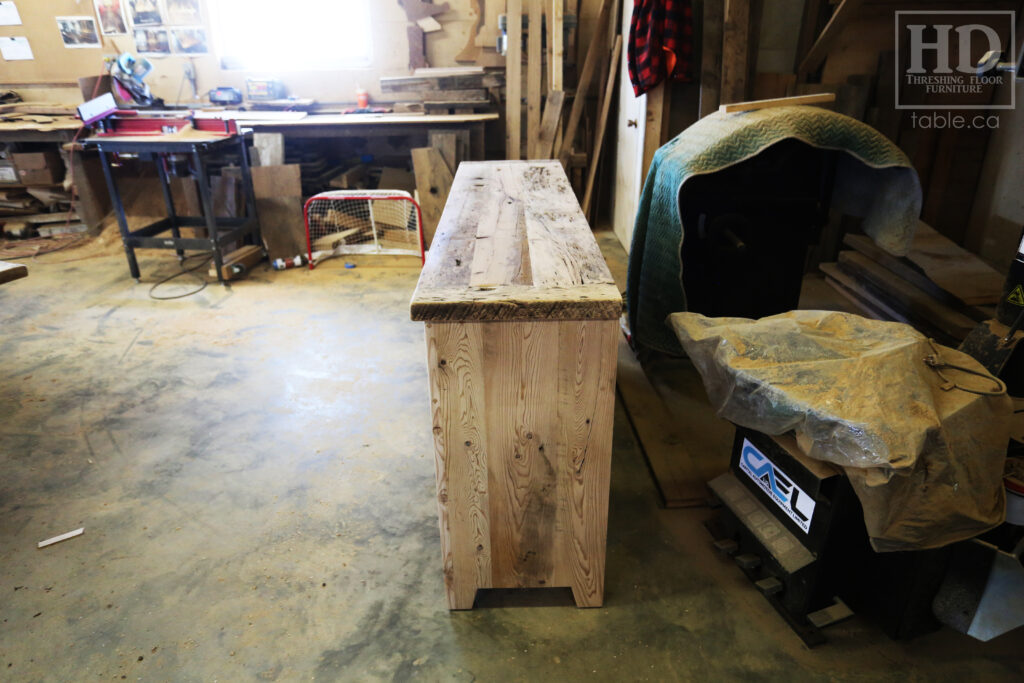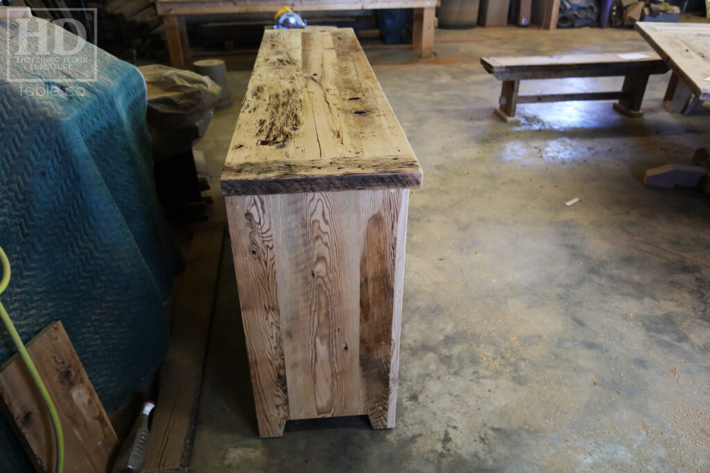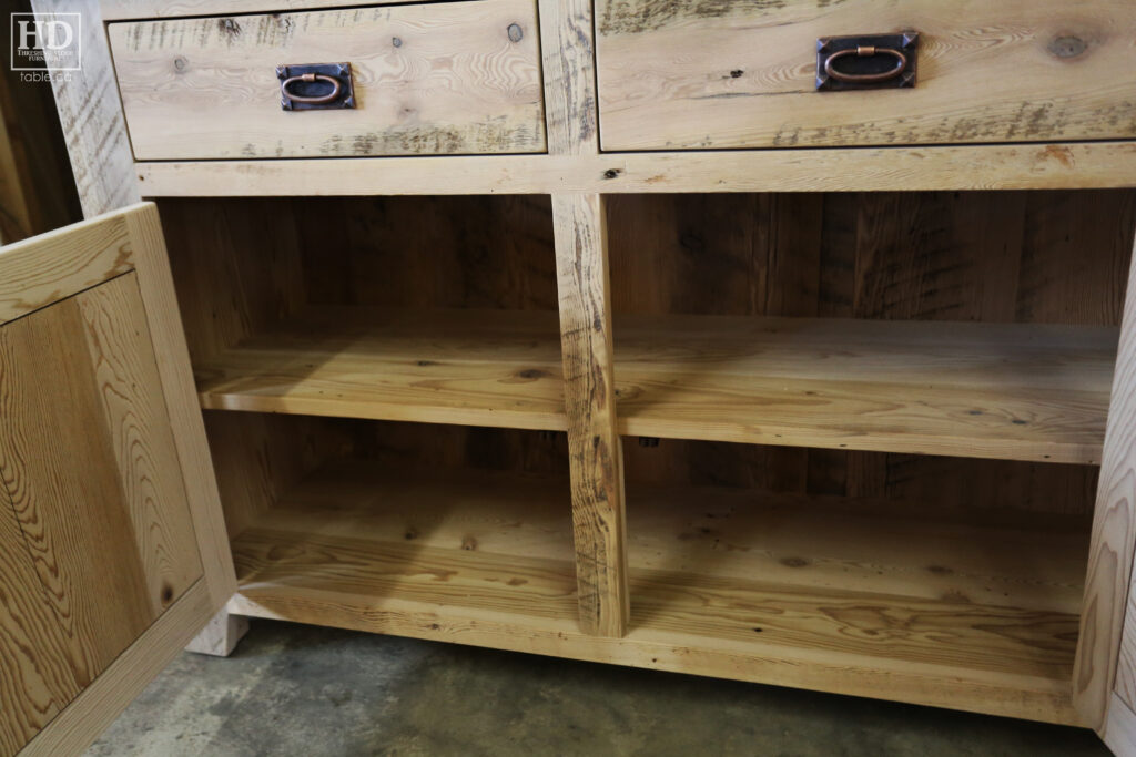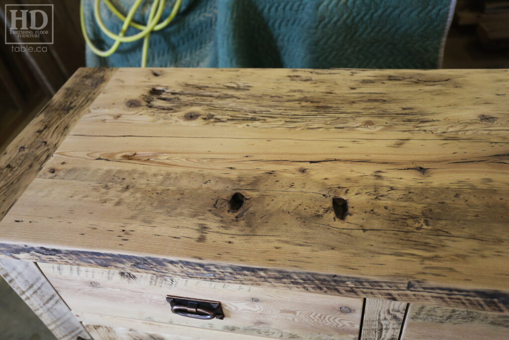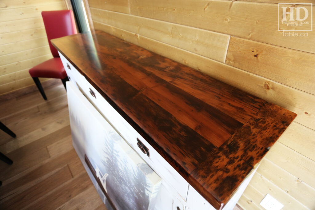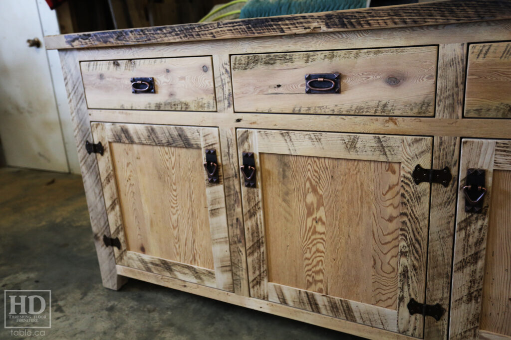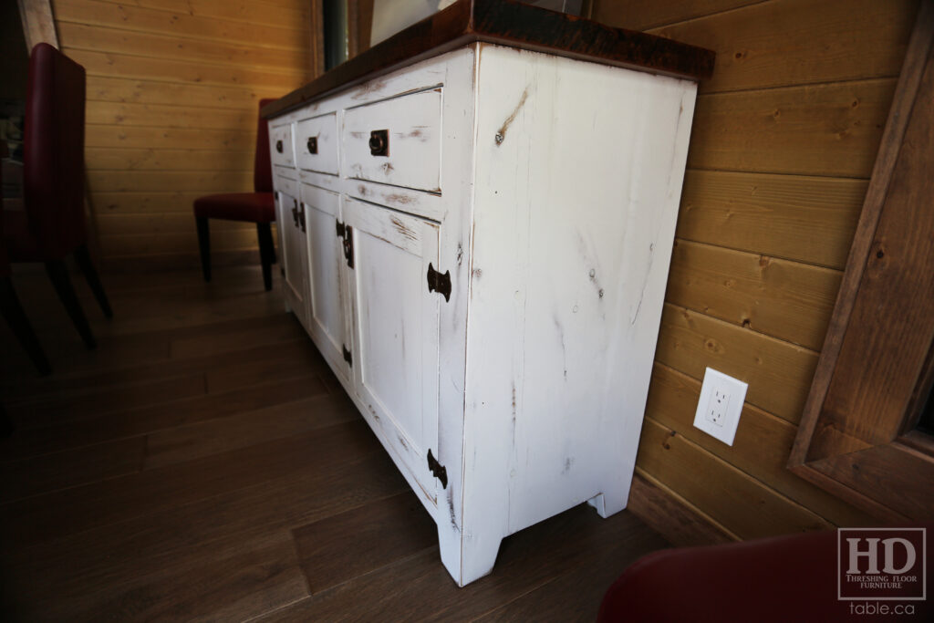 Project Summary: 6′ Ontario Barnwood Buffet we made for a Muskoka Cottage – 36″ height – 18″ deep – 3 Drawers / 3 Doors – Adjustable Shelving Inside – Reclaimed Old Growth Hemlock Threshing Floor + Grainery Board Construction – Original edges + distressing kept – White Painted with Sandthroughs Option Base – Mission Cast Brass Lee Valley Hardware – Premium epoxy + satin polyurethane finish – www.table.ca