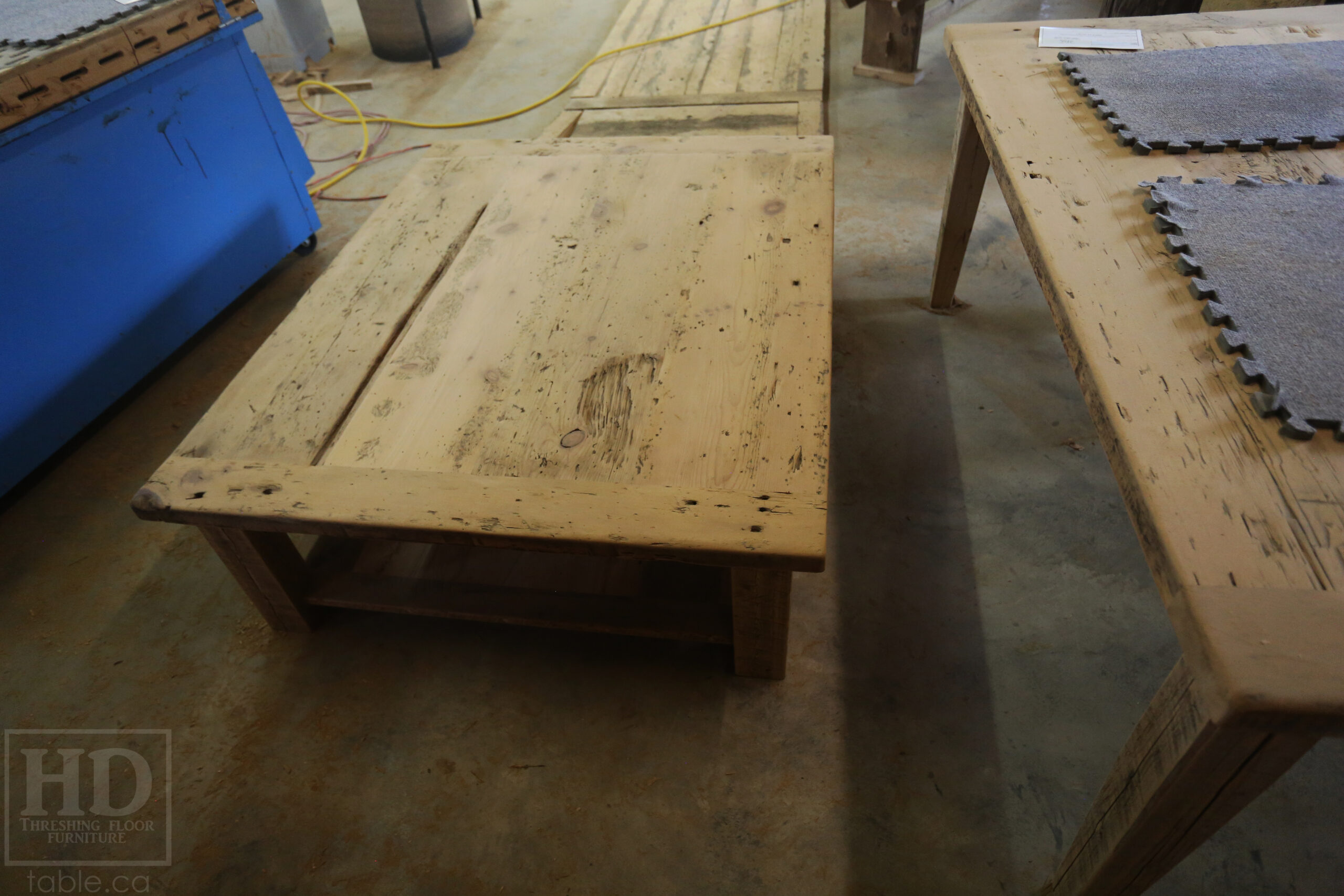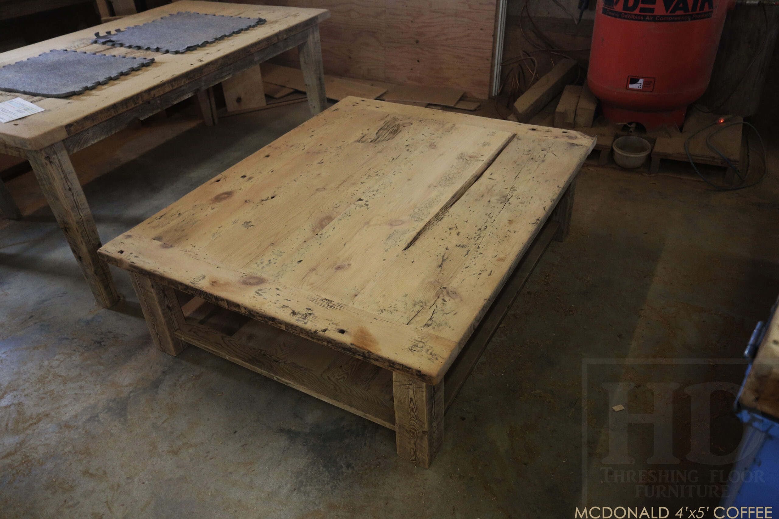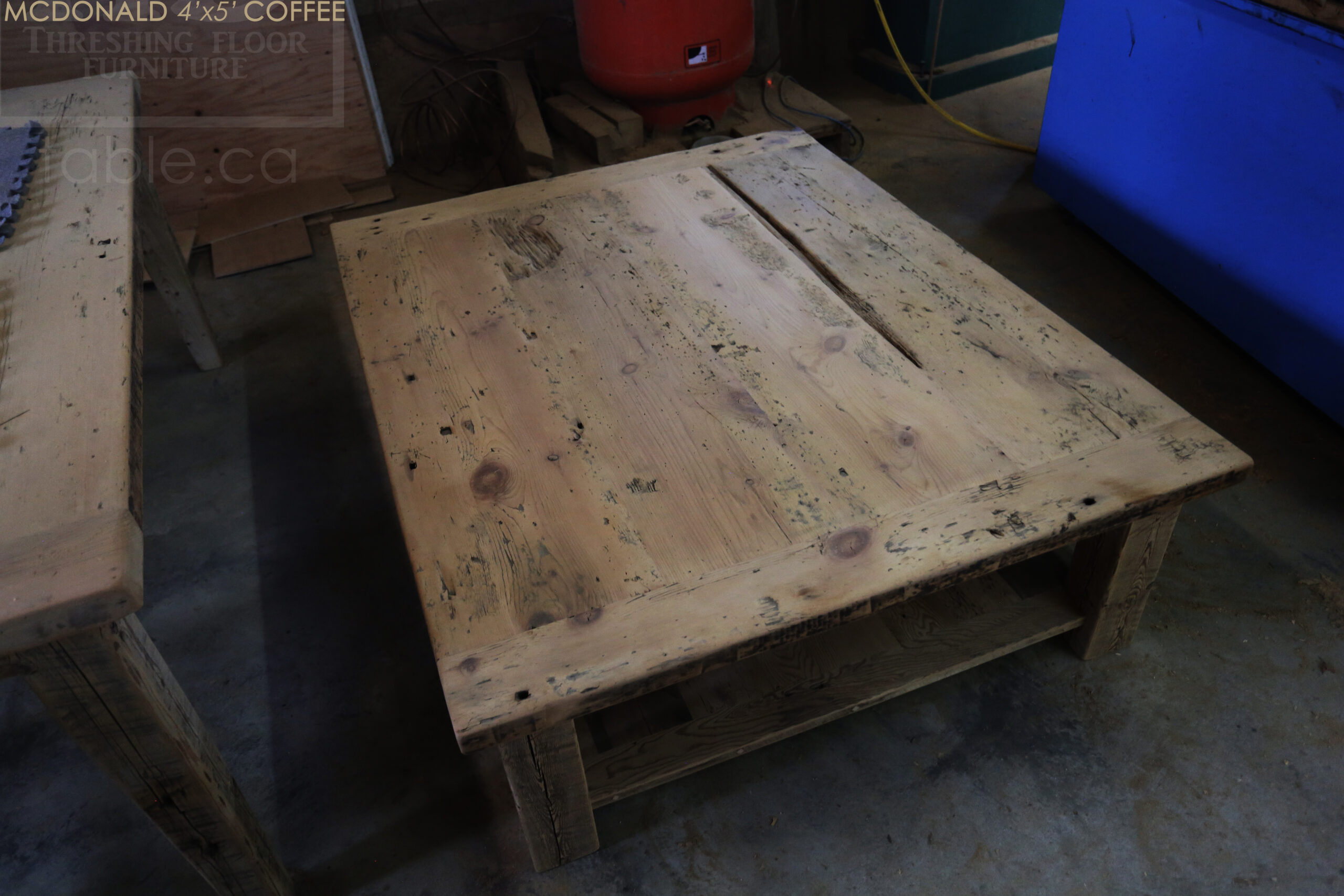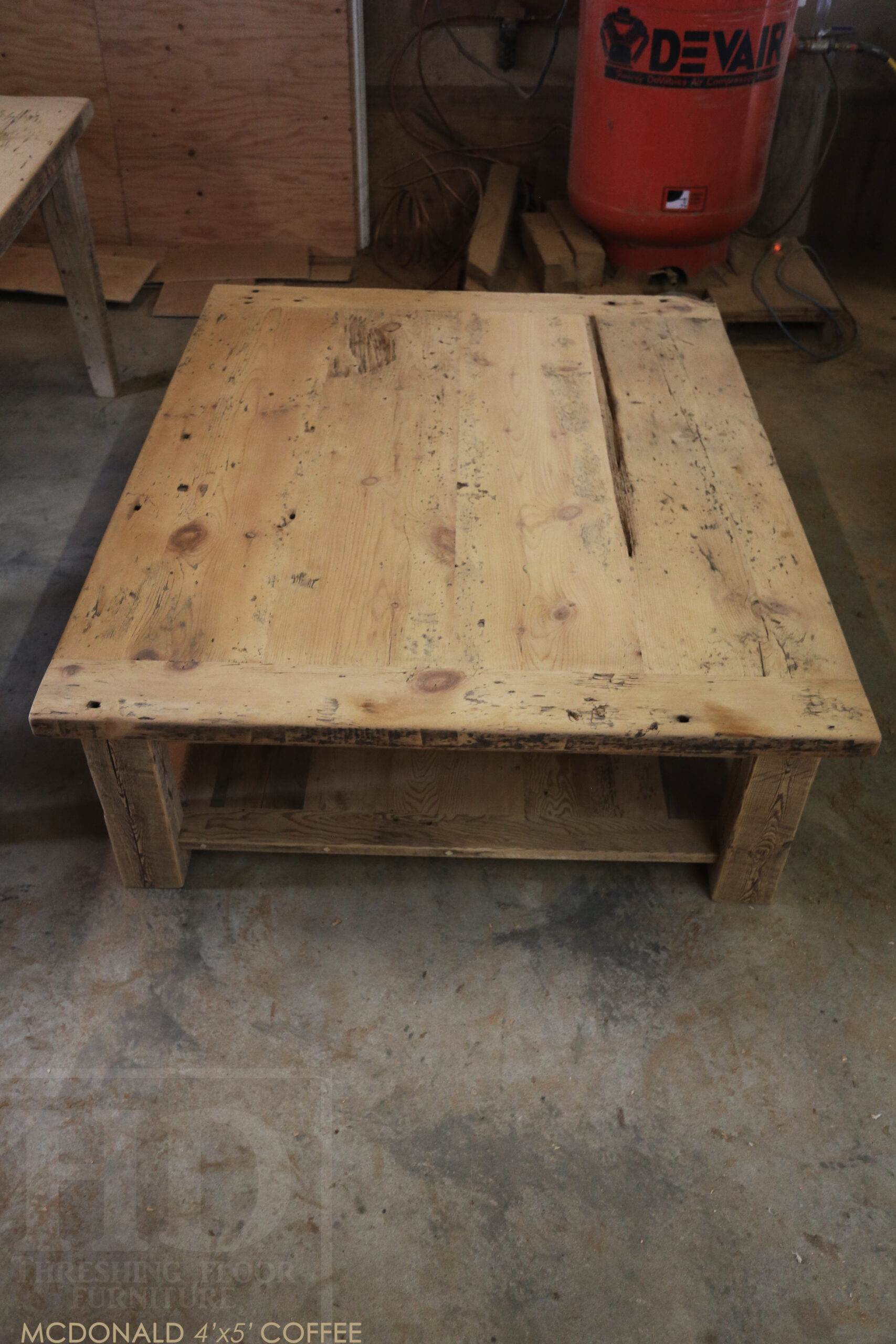 4’ x 5’ Reclaimed Ontario Barnwood Coffee Table we made for a Kincardine, Ontario home – 18†height – – Old Growth Hemlock Threshing Floor Construction – Original edges & distressing maintained – Bread Edge Board Ends – Premium epoxy + matte polyurethane finish – www.table.ca