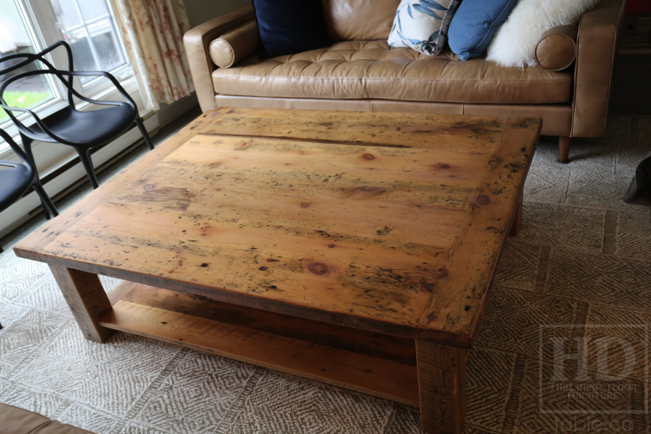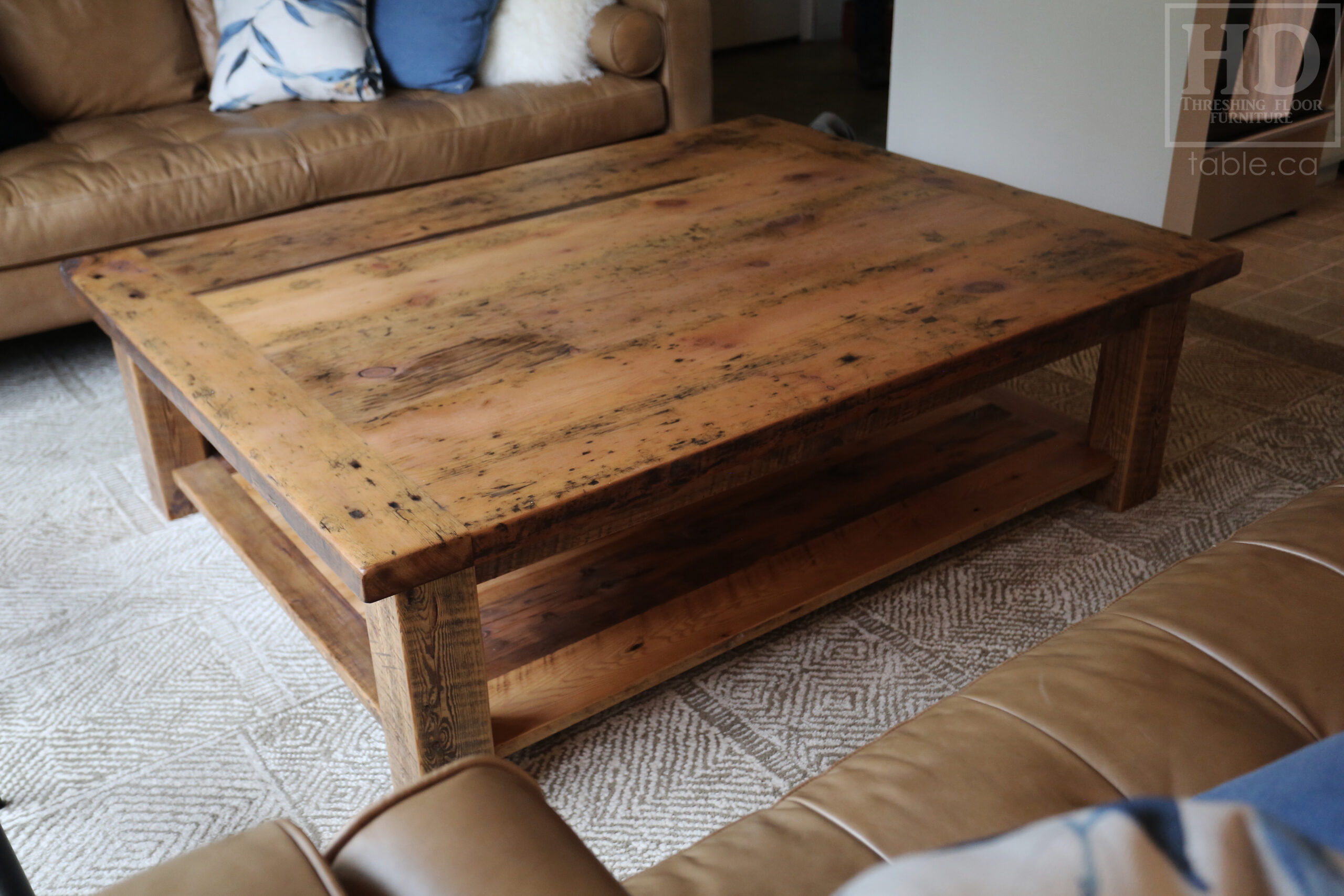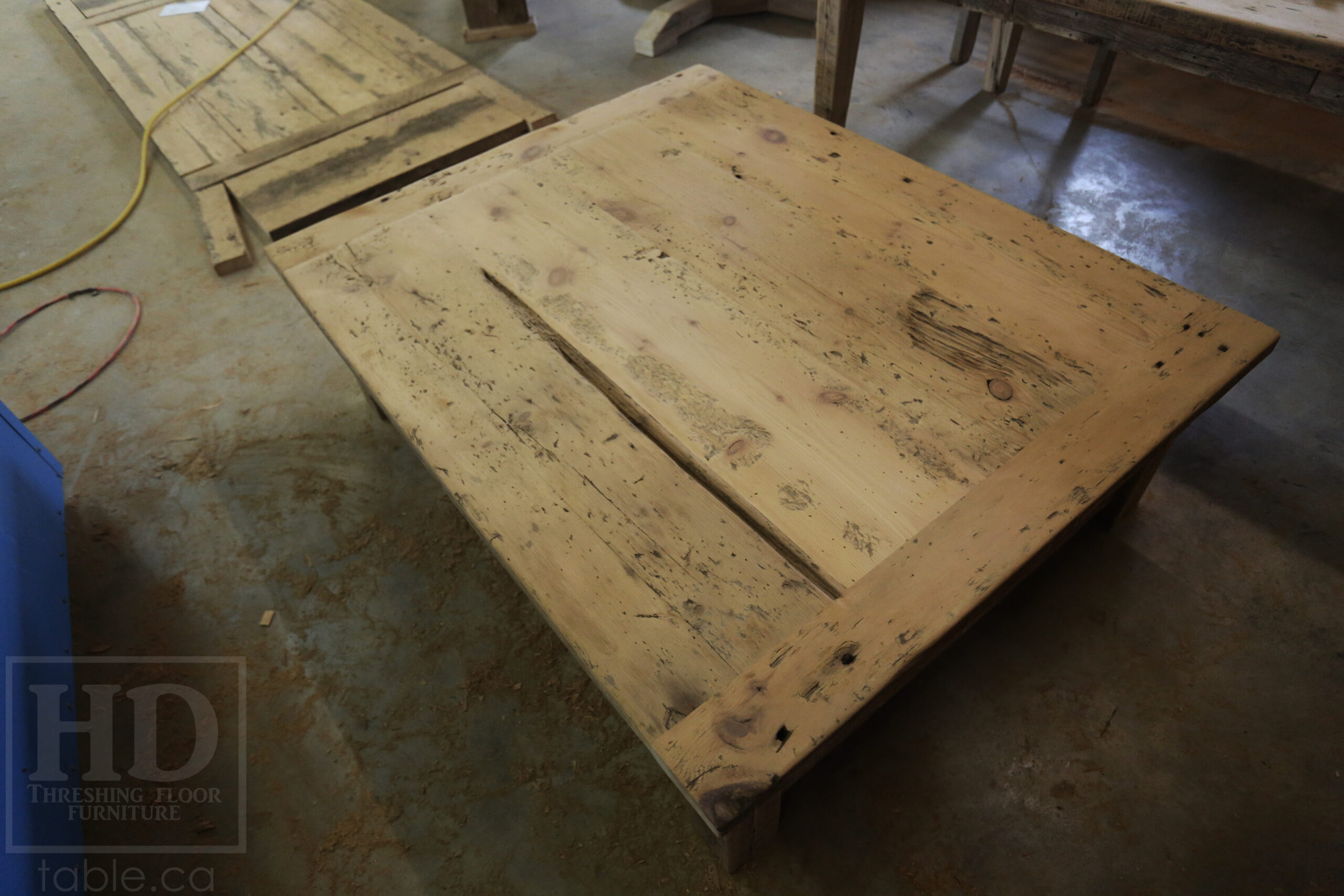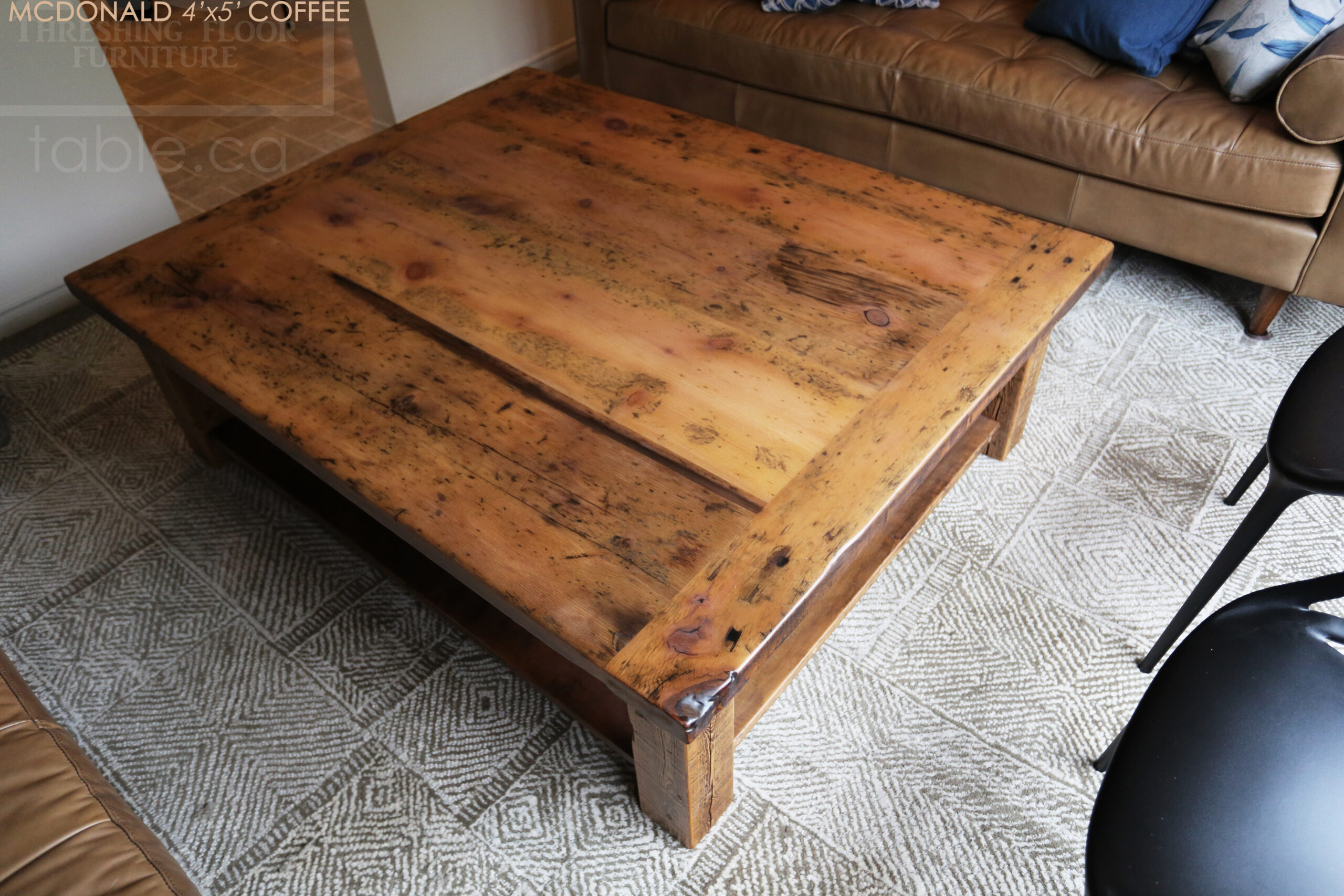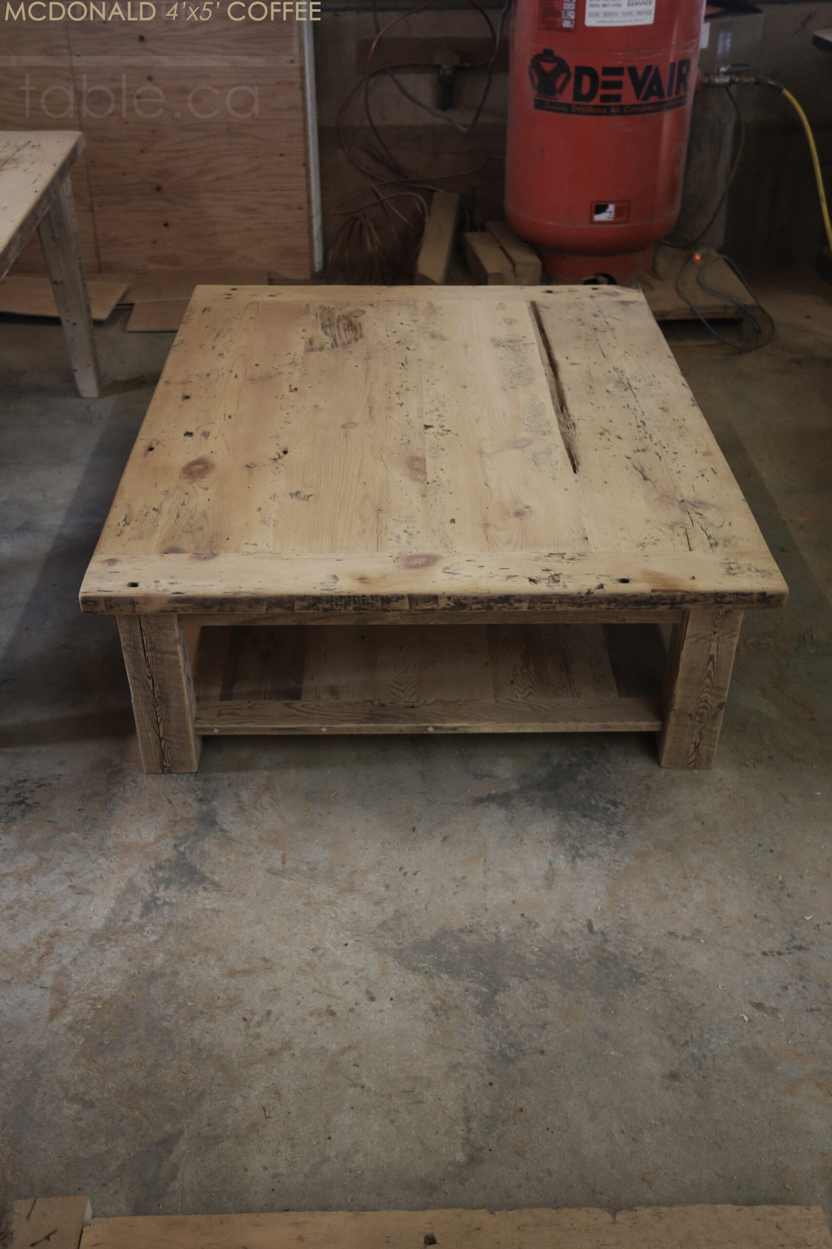 4’ x 5’ Reclaimed Ontario Barnwood Coffee Table we made for a Kincardine, Ontario home – 18†height – – Old Growth Hemlock Threshing Floor Construction – Original edges & distressing maintained – Bread Edge Board Ends – Premium epoxy + matte polyurethane finish – www.table.ca
