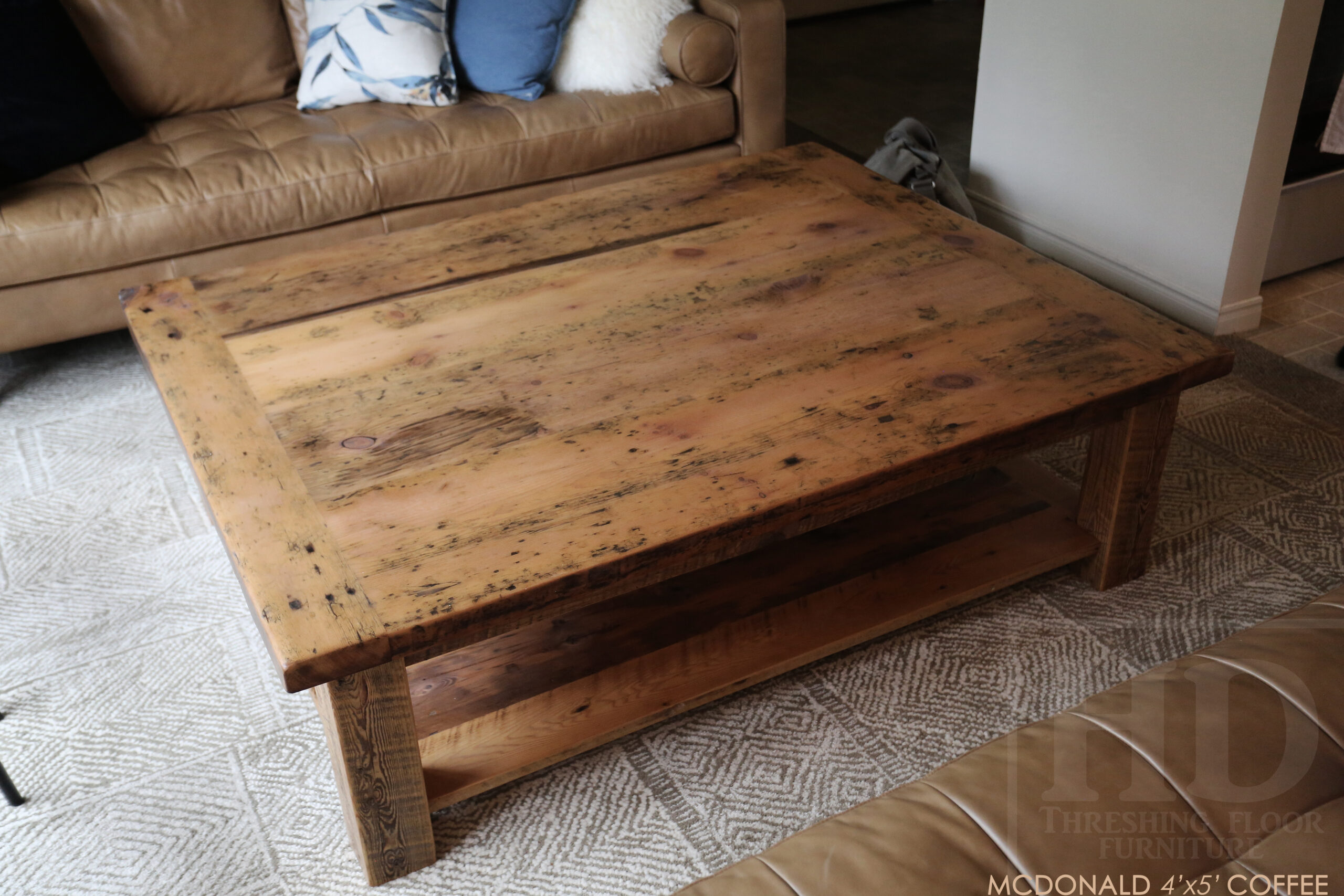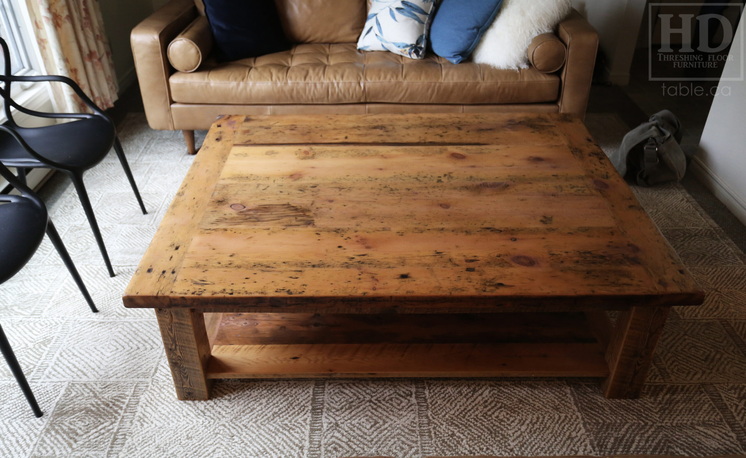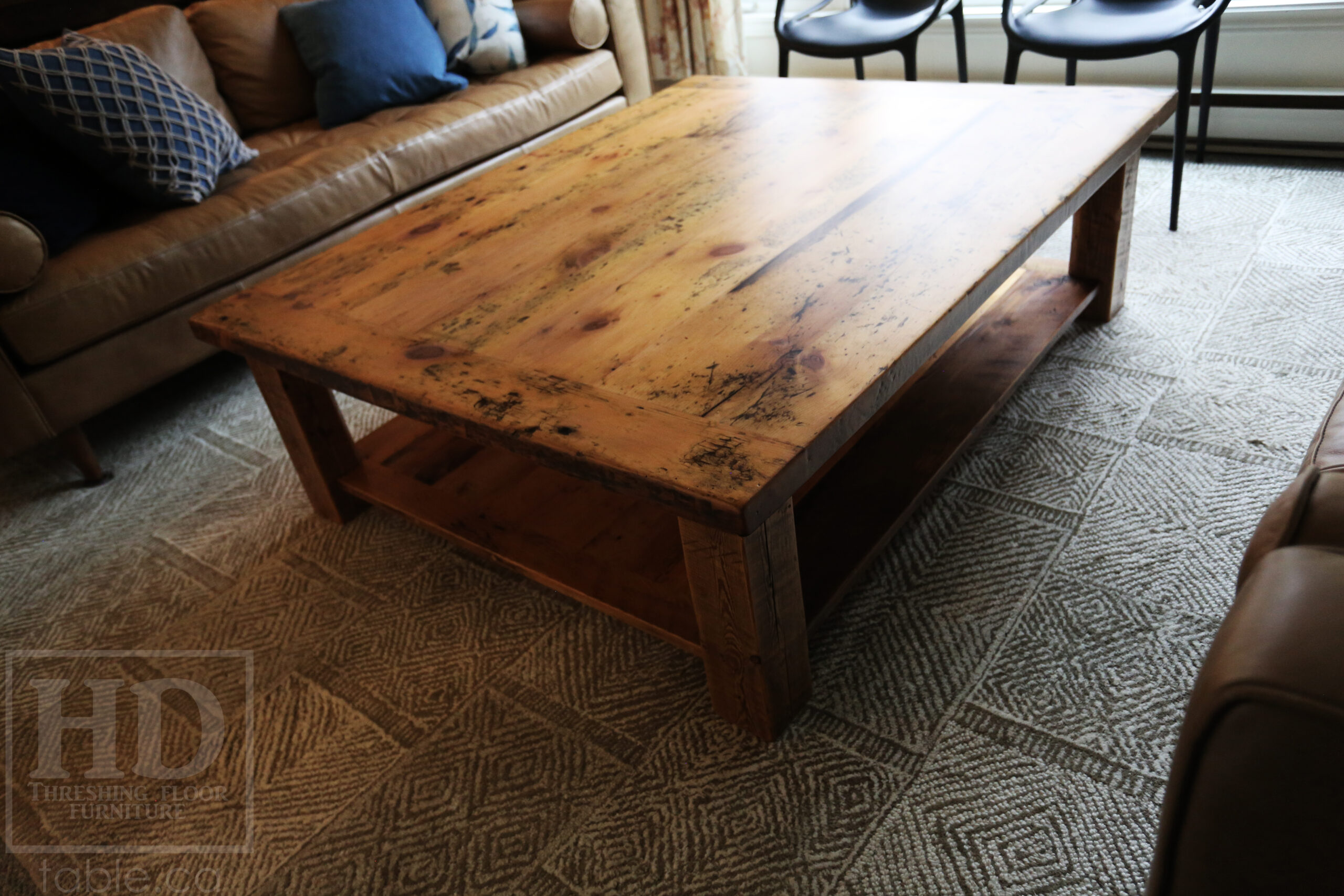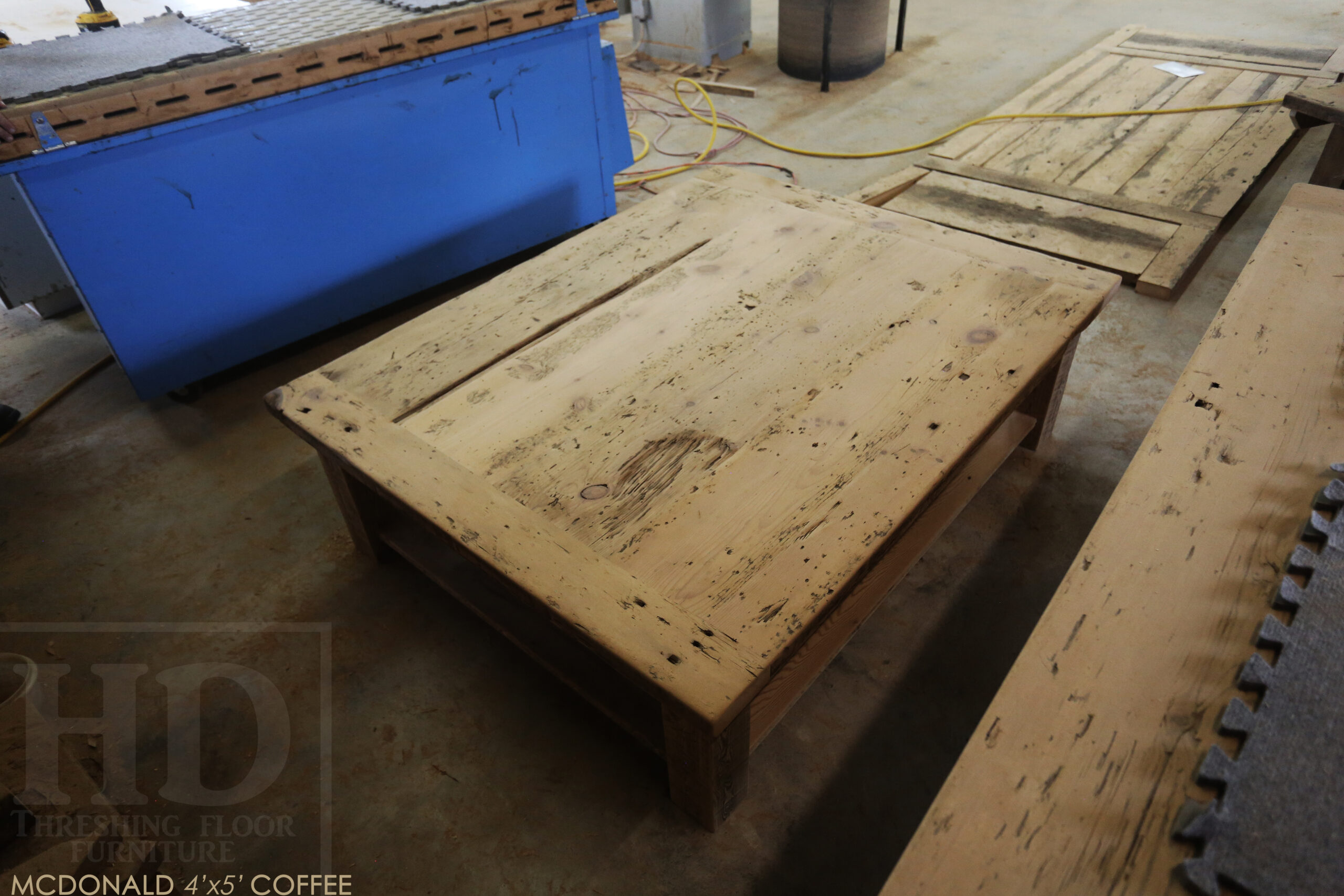 4’ x 5’ Reclaimed Ontario Barnwood Coffee Table we made for a Kincardine, Ontario home – 18†height – – Old Growth Hemlock Threshing Floor Construction – Original edges & distressing maintained – Bread Edge Board Ends – Premium epoxy + matte polyurethane finish – www.table.ca
