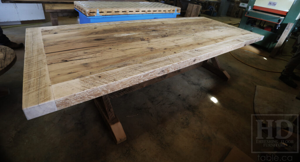 ![10’ Reclaimed Ontario Barnwood Sawbuck Table we made for an Ontario cottage – 48†wide - Old Growth Hemlock Threshing Floor Construction – Extra thick 3†Joists Top Option - Original edges & distressing maintained – Bread Edge Ends – Premium epoxy + satin polyurethane finish – Black Stain Option – [14] Wormy Maple Cottager Chairs - www.table.ca](https://www.hdthreshing.dreamhosters.com/blog/blog/wp-content/uploads/2022/04/custom-reclaimed-wood-table-6-scaled.jpg)
