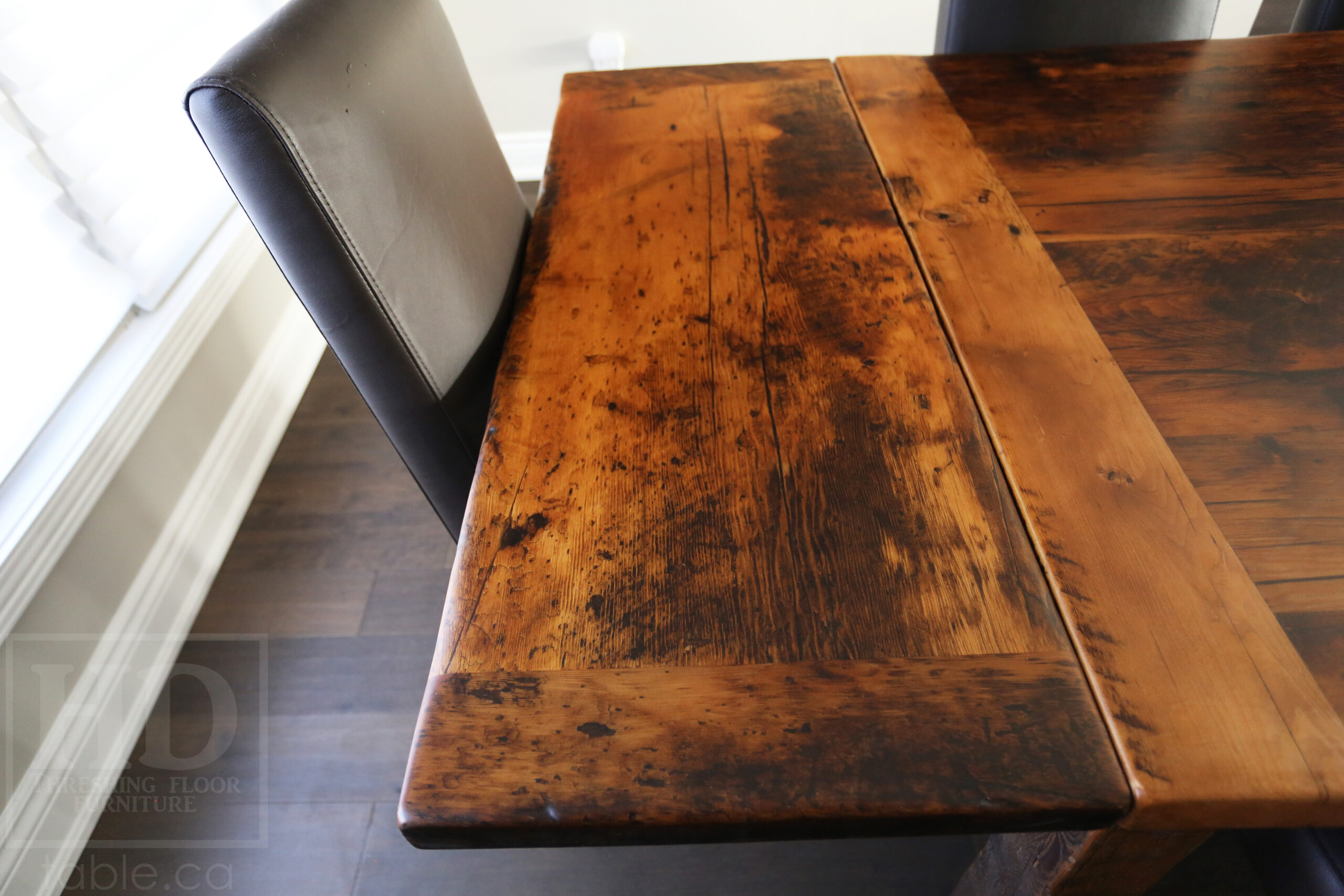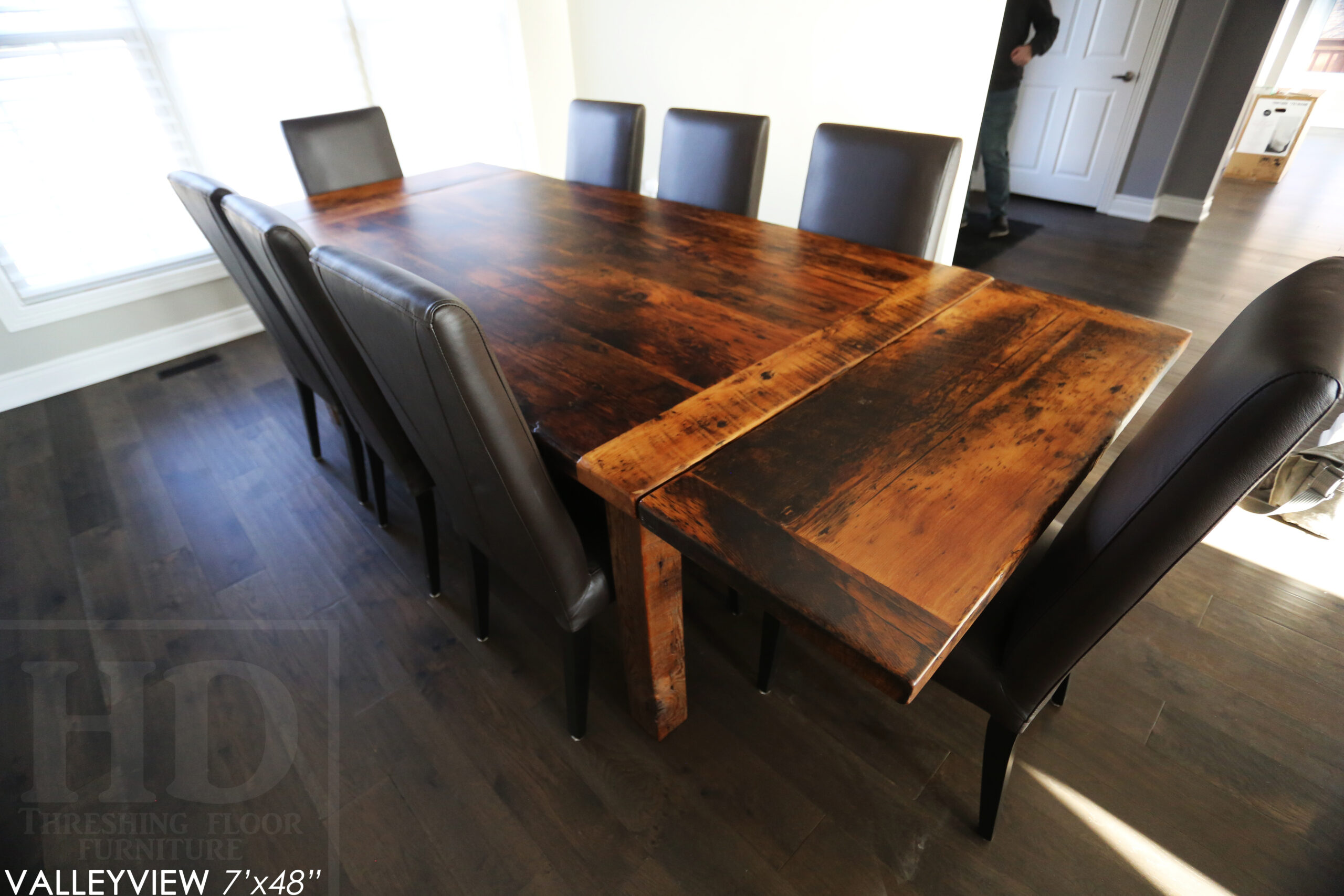 Project summary: 7’ Reclaimed Ontario Barnwood Table we made for a Milton, Ontario home – 48†wide – Harvest Base / Straight 4â€x4†Windbrace Beam Legs – Old Growth Hemlock Threshing Floor Construction – Original edges & distressing maintained – Bread Edge Board Ends – Premium epoxy + matte polyurethane finish – Two 18†Leaf Extensions – 8 Topgrain Leather Parsons Chairs / Santiago Black – www.table.ca