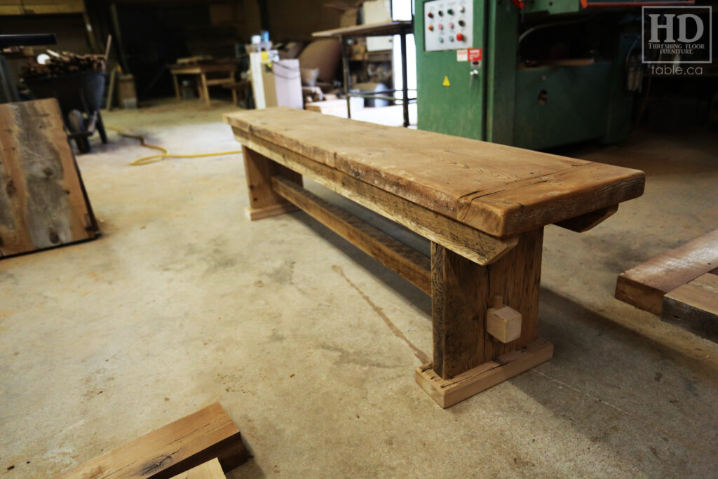 ![7' Reclaimed Ontario Barnwood Table we made for a Pickering home - 38" wide - Extra thick 3" top option - Harvest Base: Straight 4"x4" Windbrace Beam Legs [Black Painted Skirting & Legs Option] - Old Growth Hemlock Threshing Floor Construction - Original edges & distressing maintained - Premium epoxy + satin polyurethane finish - 6' [matching] Trestle Bench - Ladder Back Chairs - www.table.ca](https://www.hdthreshing.dreamhosters.com/blog/blog/wp-content/uploads/2023/08/reclaimed-wood-bench-2-1024x683.jpg)