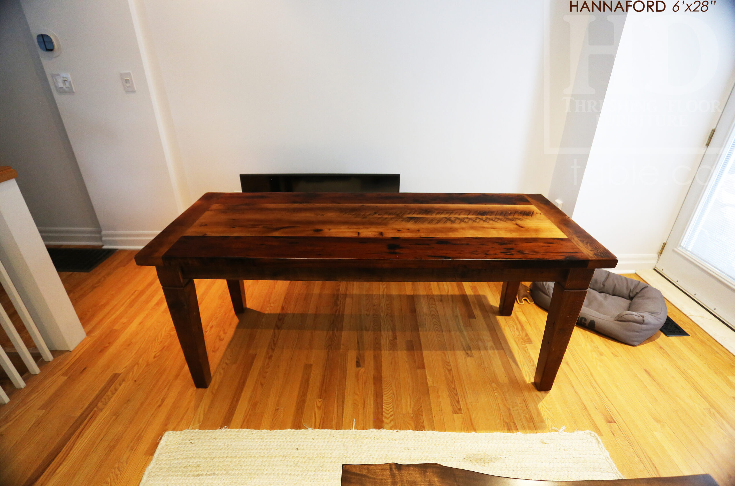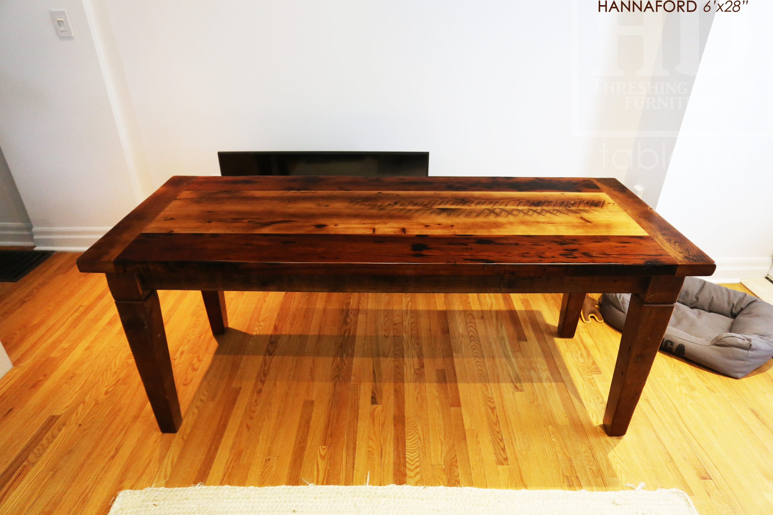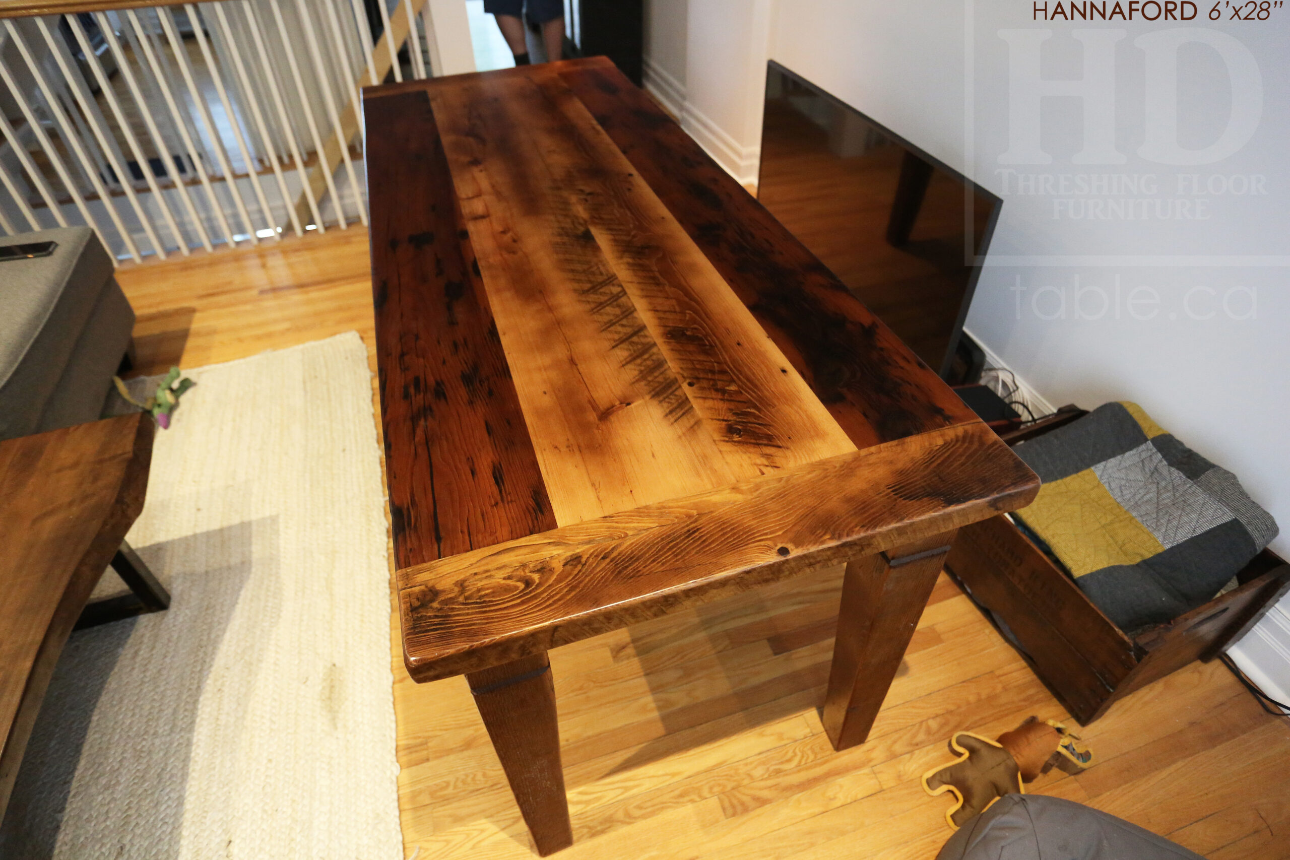 Project summary: 6’ Ontario Barnwood Harvest Table we made for a Toronto, Ontario Home – 28†wide – Harvest Base / Tapered with a Notch Windbrace Beam Legs – Old Growth Hemlock Threshing Floor Construction – Original edges & distressing maintained – Bread Edge Board Ends – Premium epoxy + satin polyurethane finish – www.table.ca