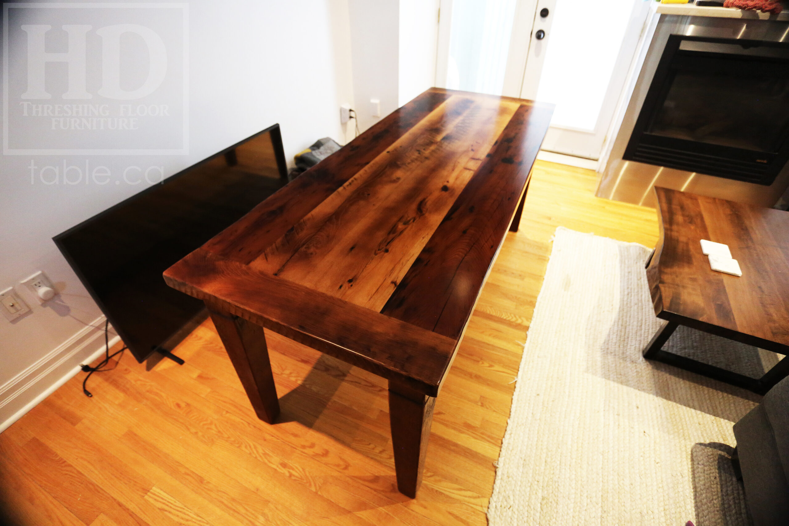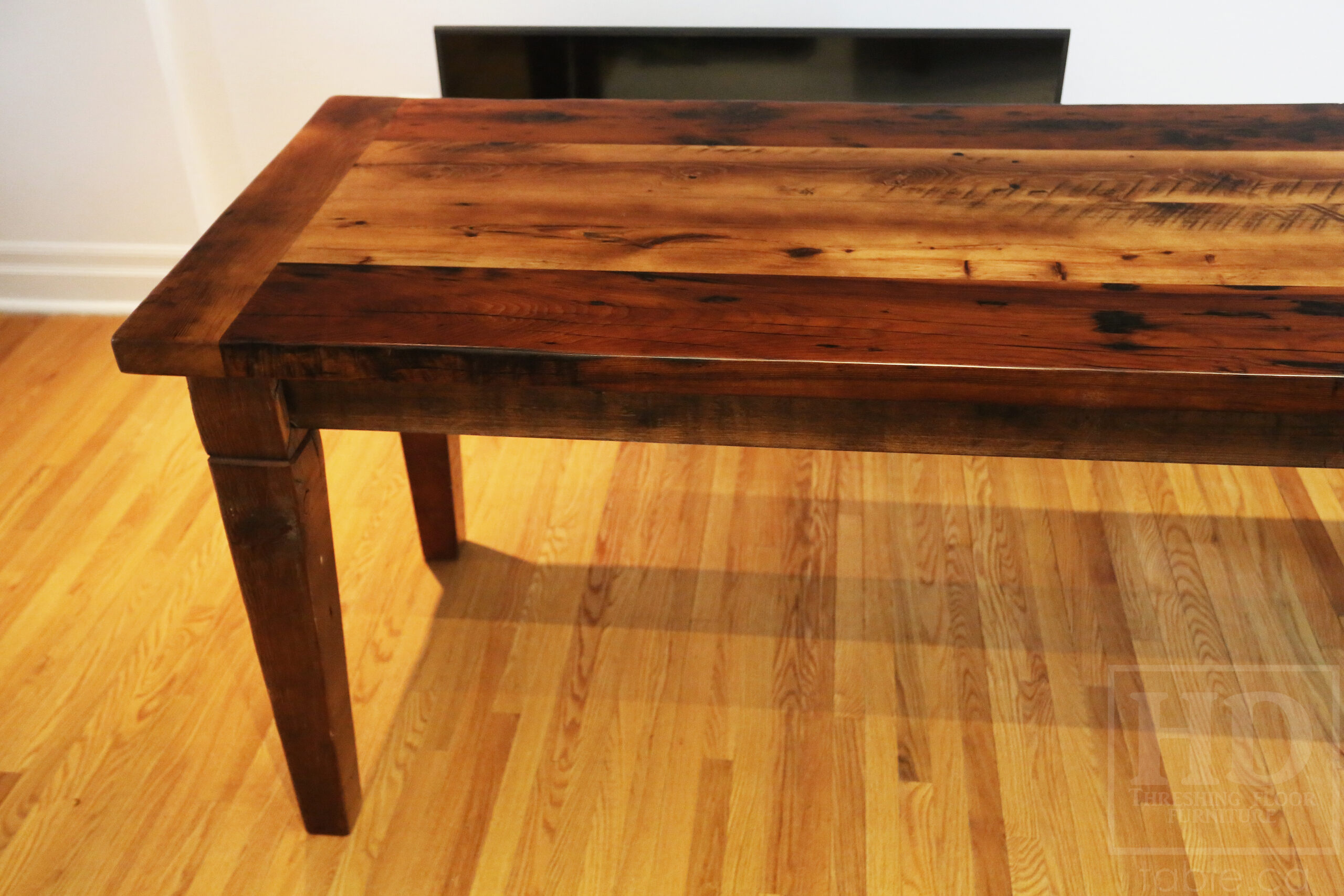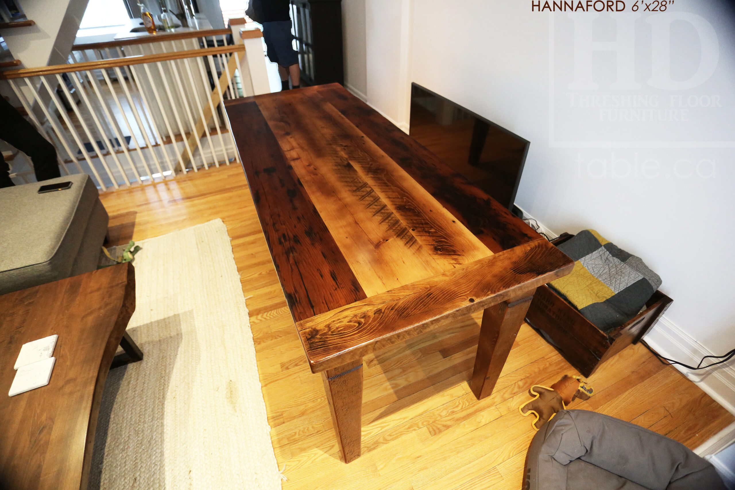 Project summary: 6’ Ontario Barnwood Harvest Table we made for a Toronto, Ontario Home – 28†wide – Harvest Base / Tapered with a Notch Windbrace Beam Legs – Old Growth Hemlock Threshing Floor Construction – Original edges & distressing maintained – Bread Edge Board Ends – Premium epoxy + satin polyurethane finish – www.table.ca
