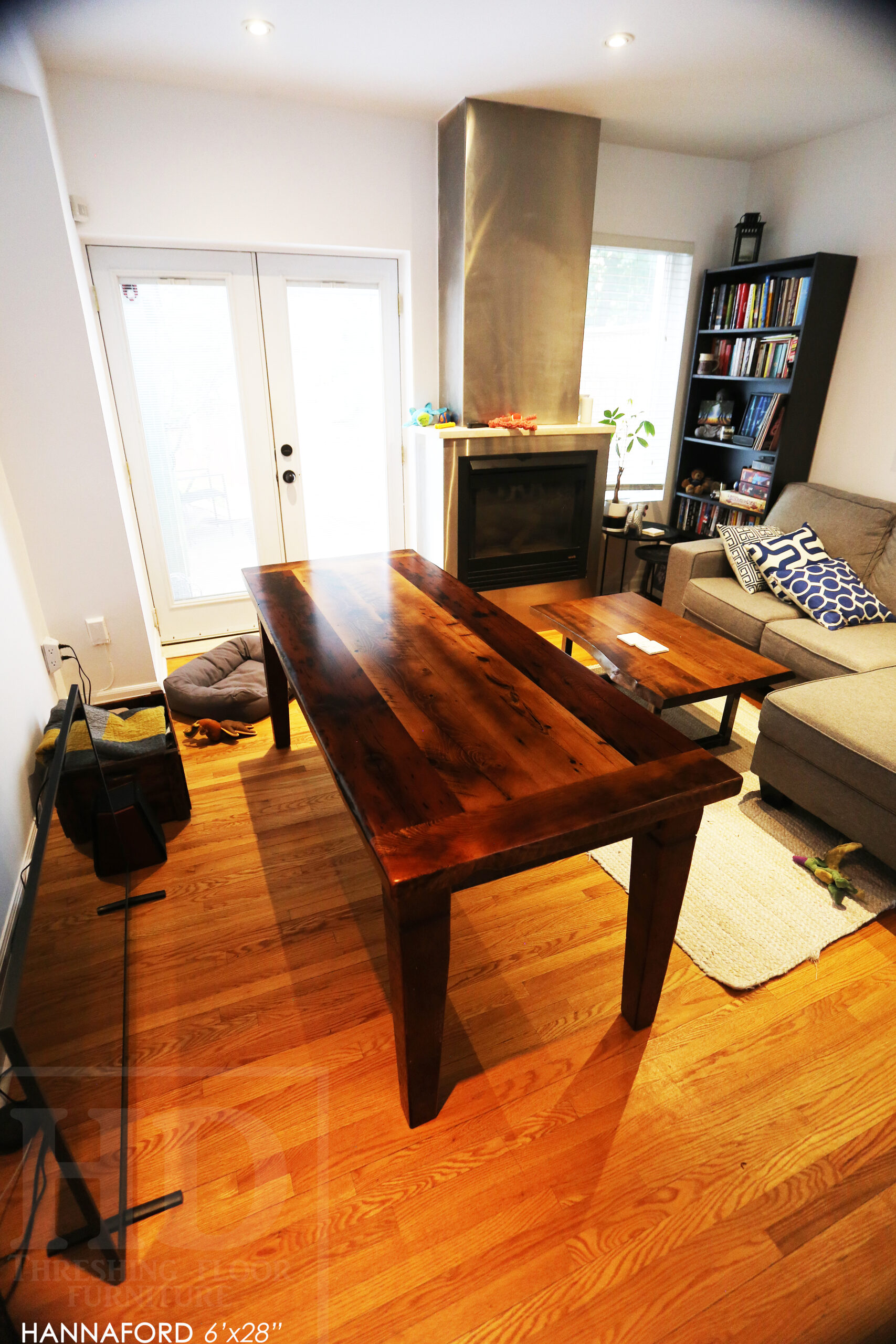 Our reclaimed wood harvest tables are custom built from scratch. Therefore, you can do any width. 42″ is most typical but for tighter spaces a narrower width may be more appropriate. Check out this Ontario barnwood hemlock table we made for a Toronto customer: