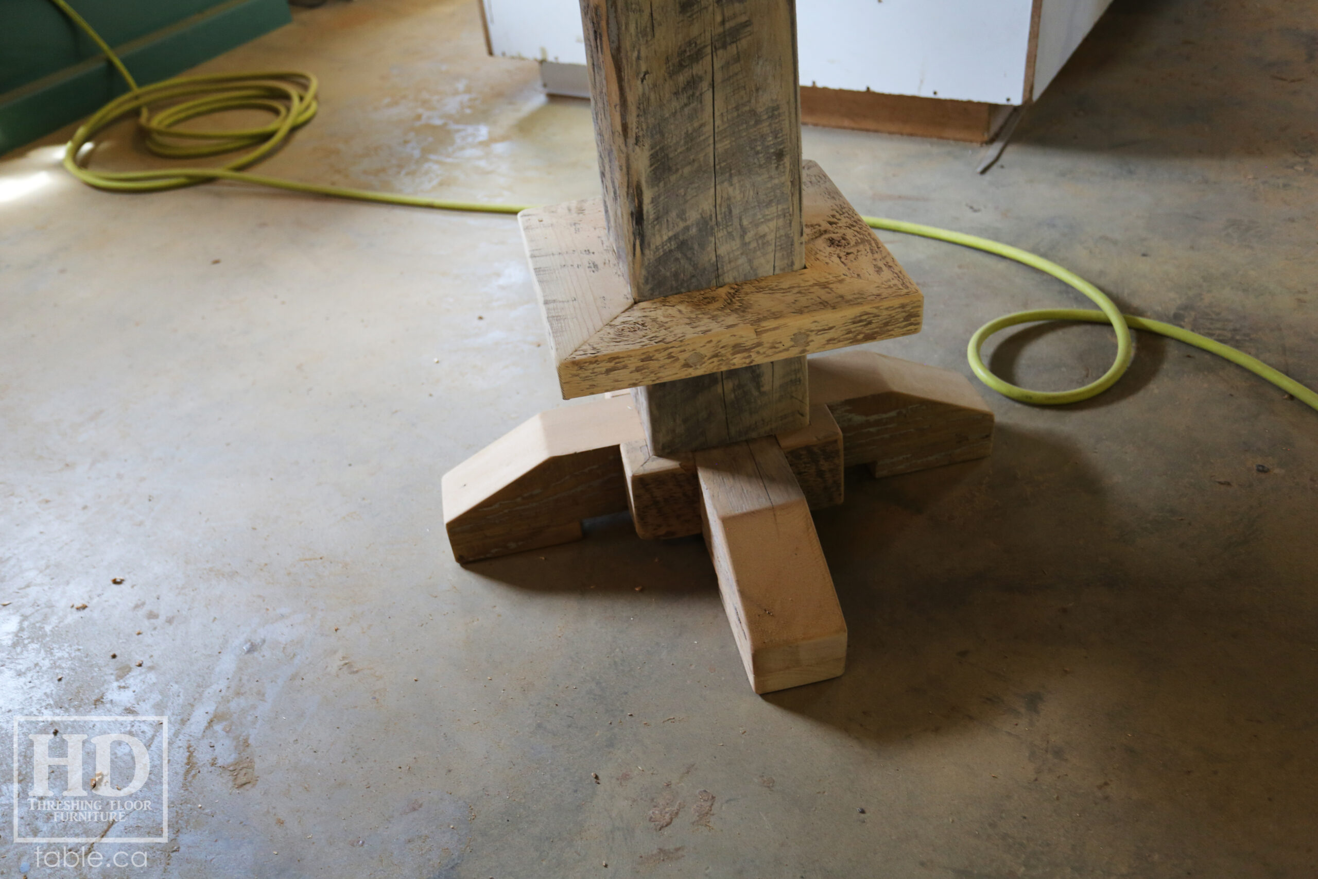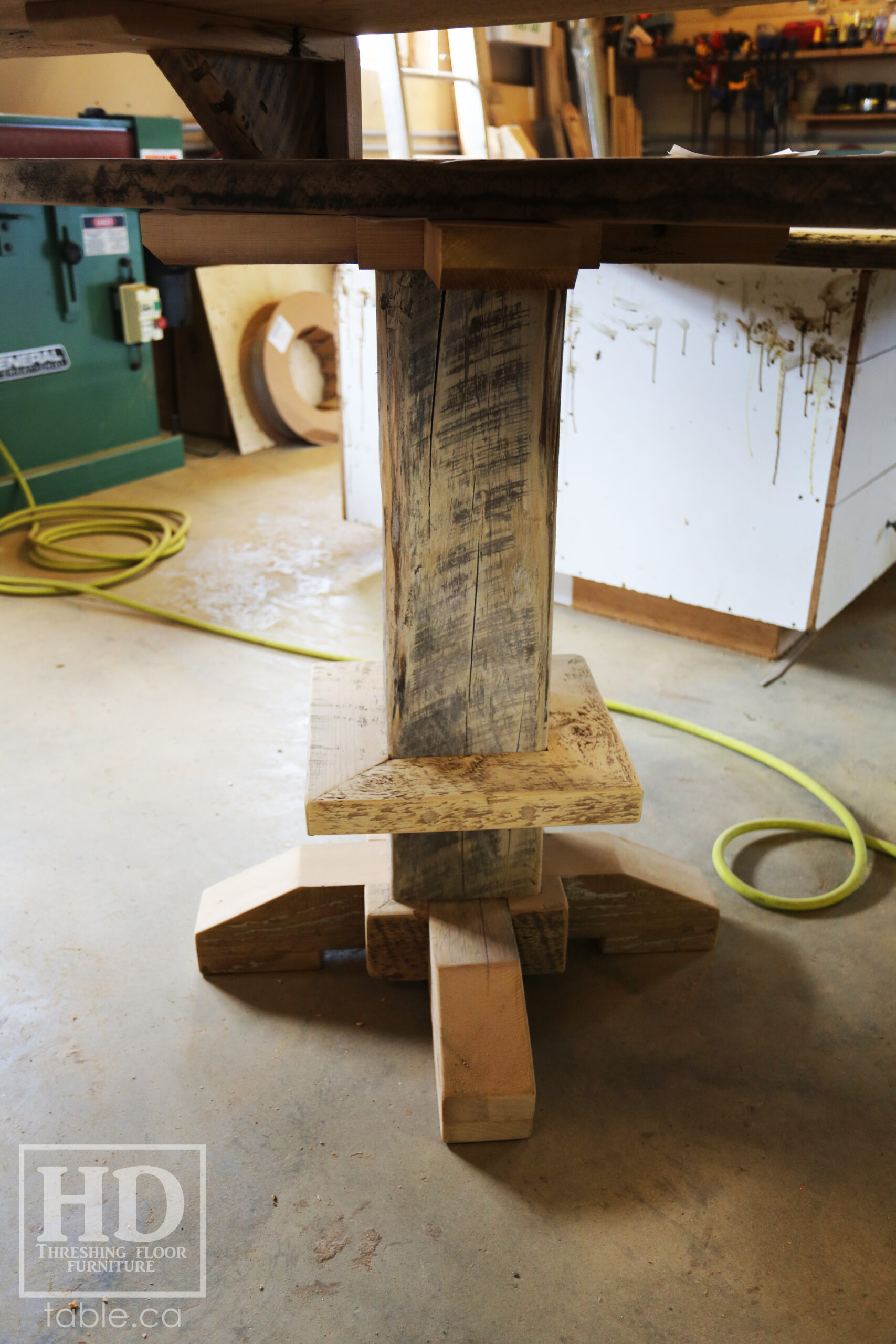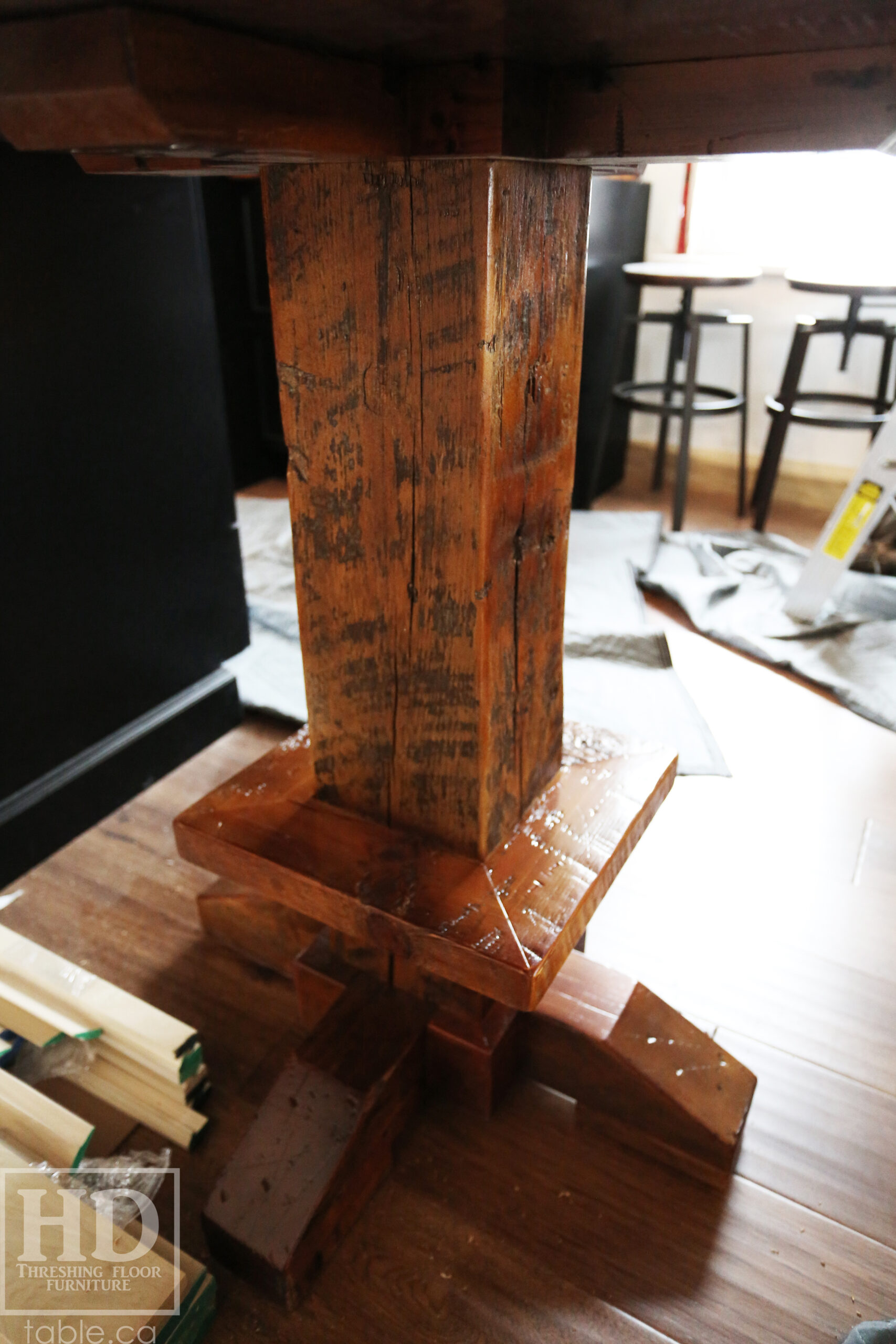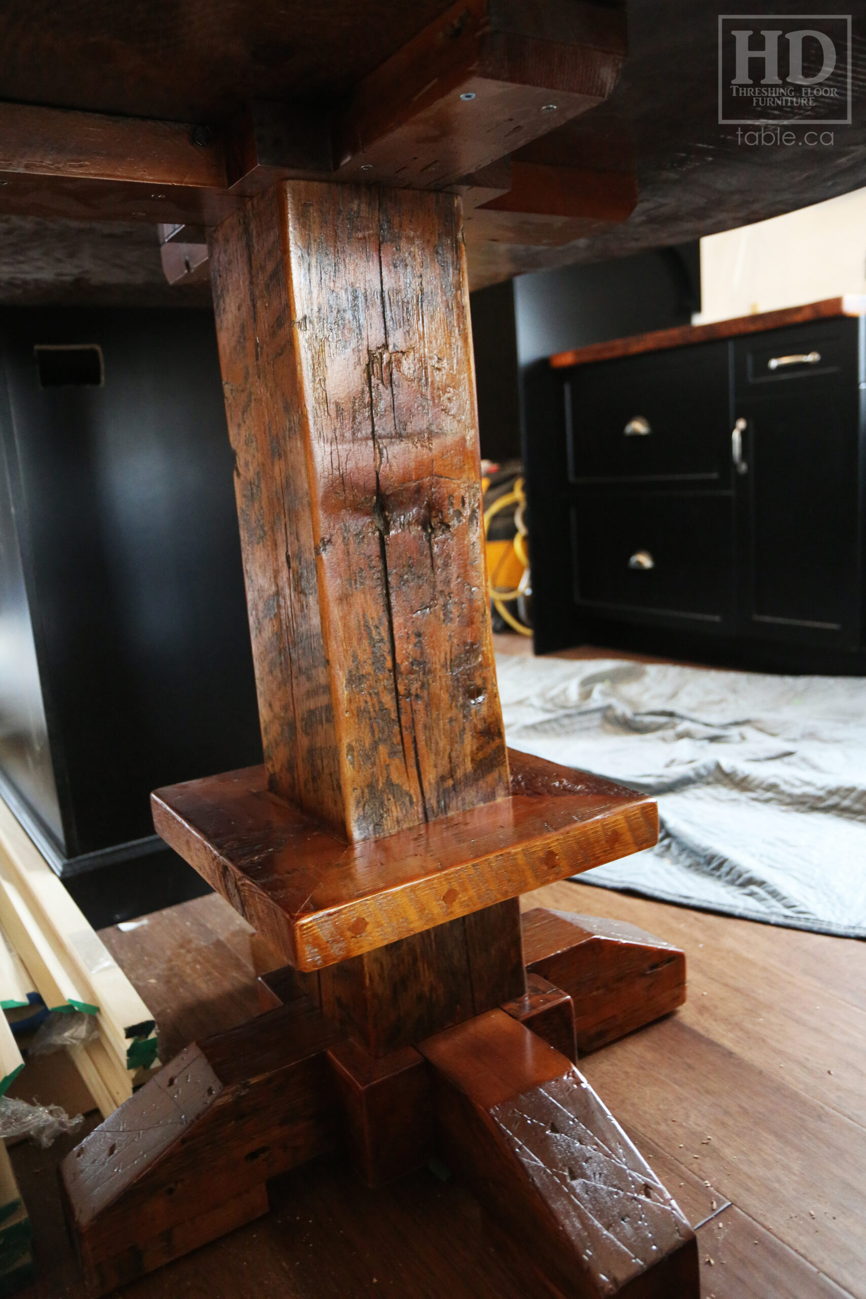 Project Summary: Ontario Barnwood Island Top + Post we made for a Fort Erie, Ontario home – Hand-Hewn Post Pedestal at End [to extend island size] – Reclaimed Hemlock Threshing Floor Construction – Original edges & distressing maintained – Premium epoxy + satin polyurethane finish – www.table.ca