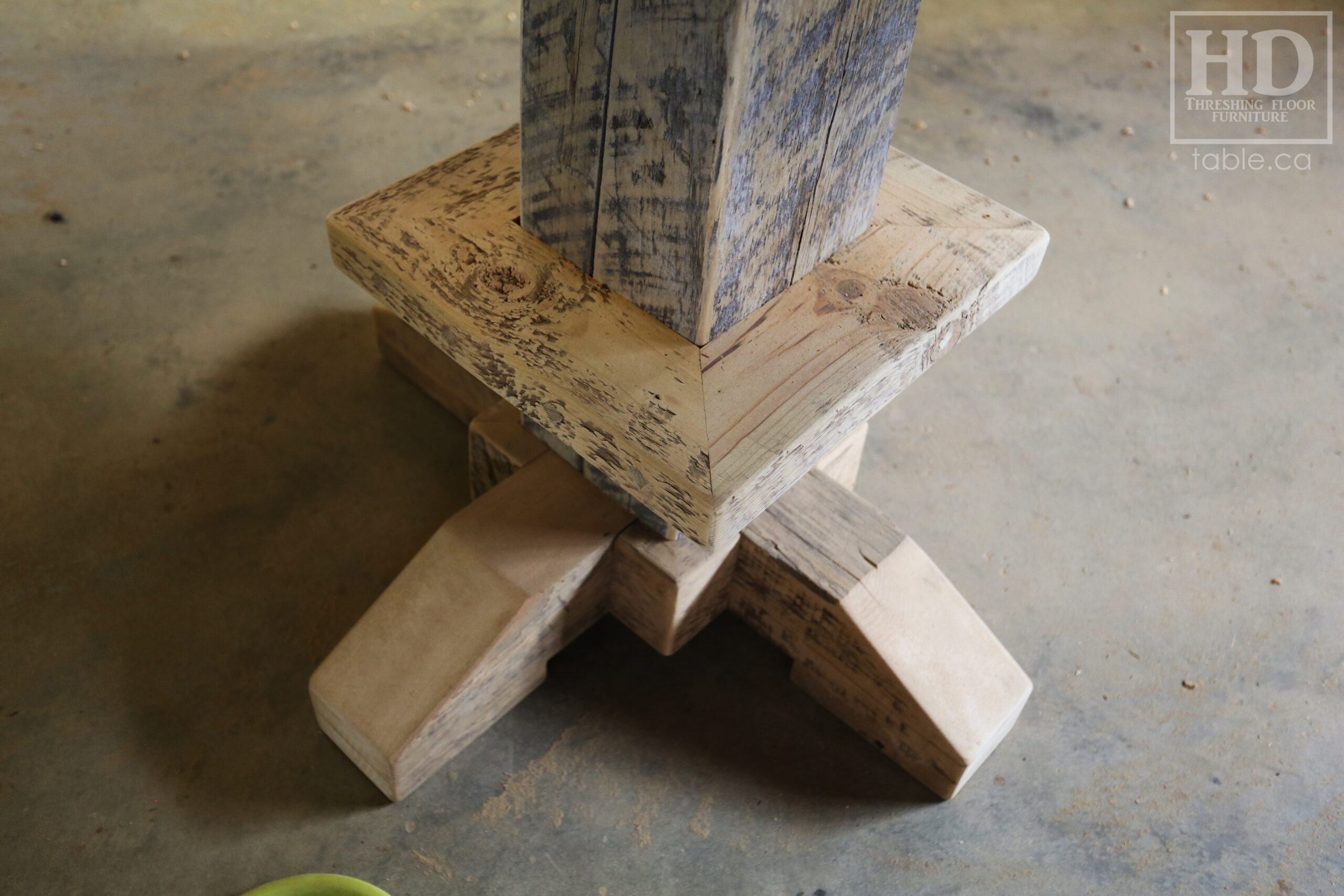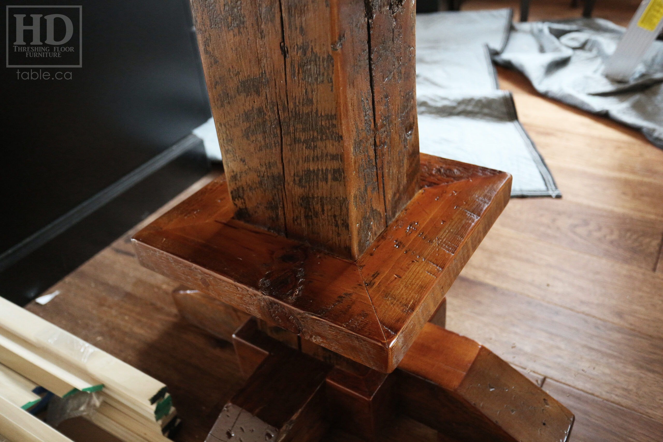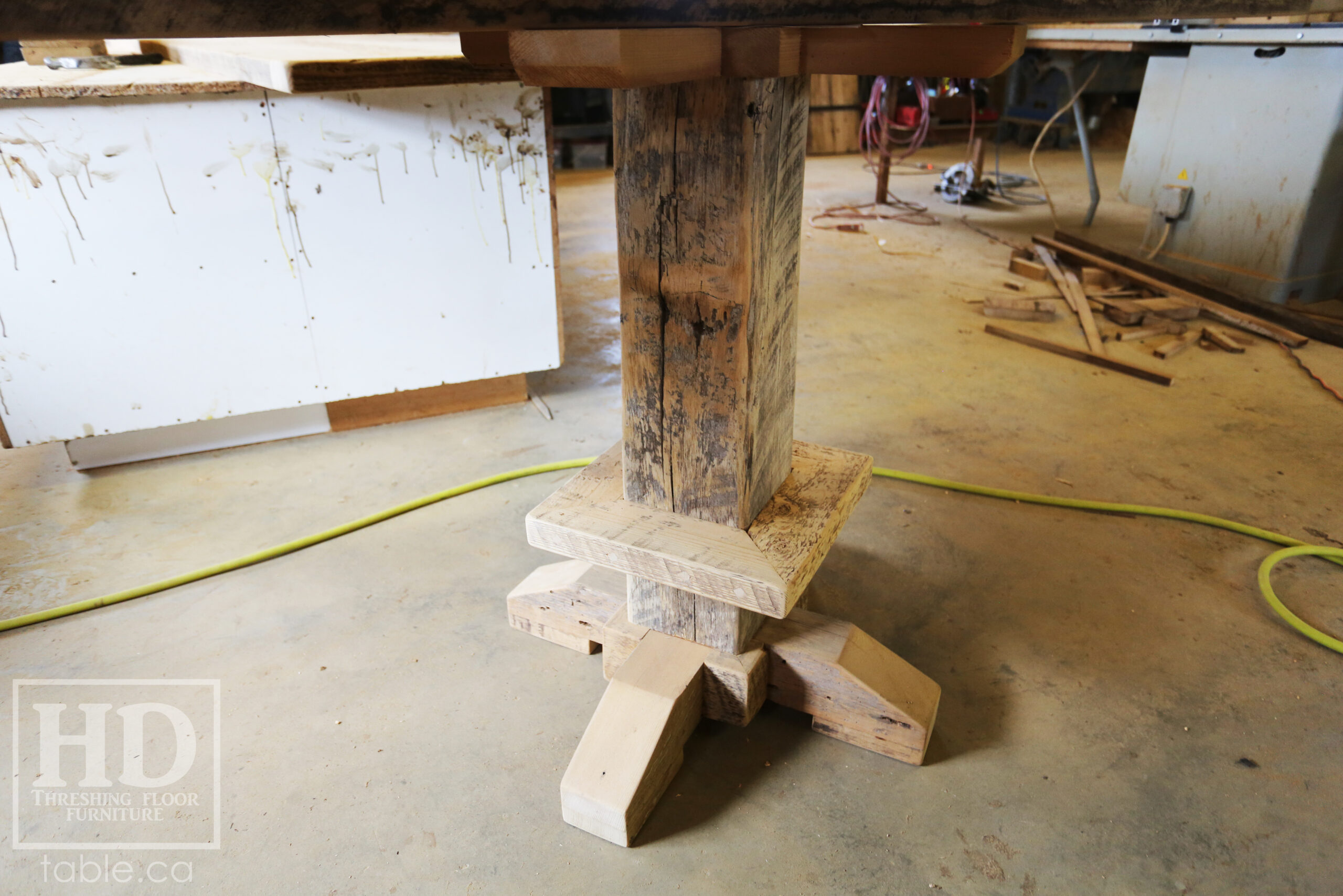Project Summary: Ontario Barnwood Island Top + Post we made for a Fort Erie, Ontario home – Hand-Hewn Post Pedestal at End [to extend island size] – Reclaimed Hemlock Threshing Floor Construction – Original edges & distressing maintained – Premium epoxy + satin polyurethane finish – www.table.ca