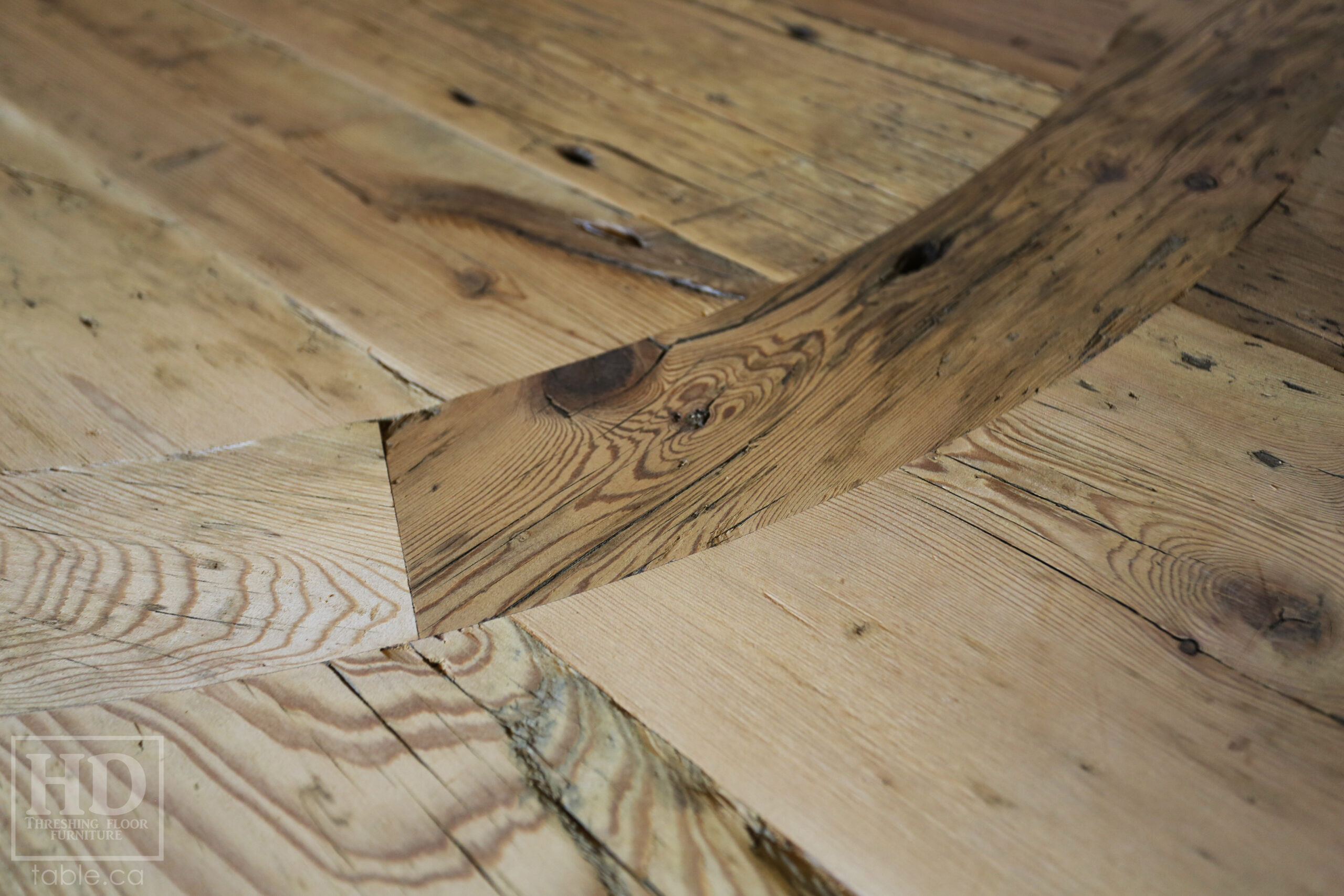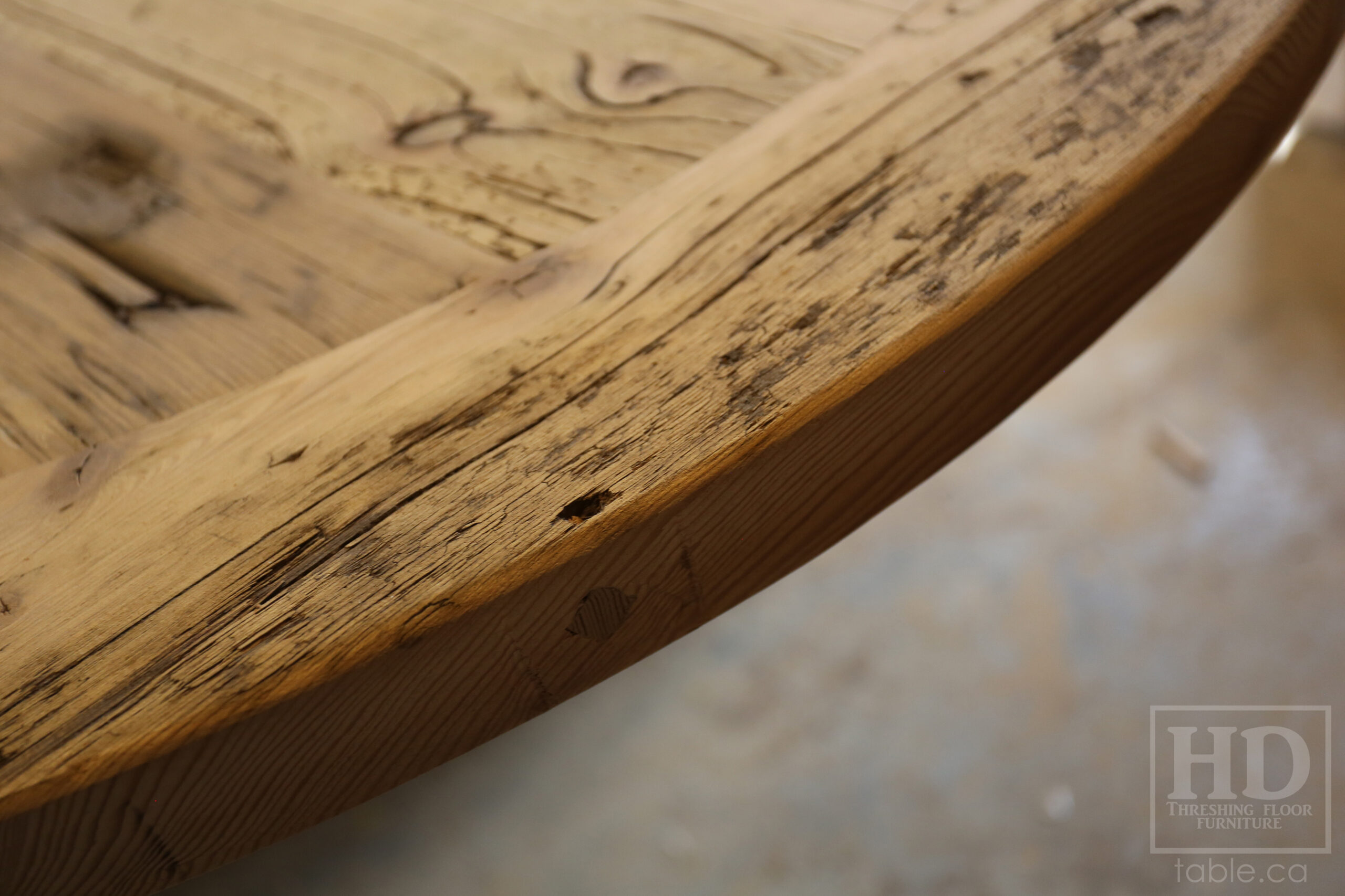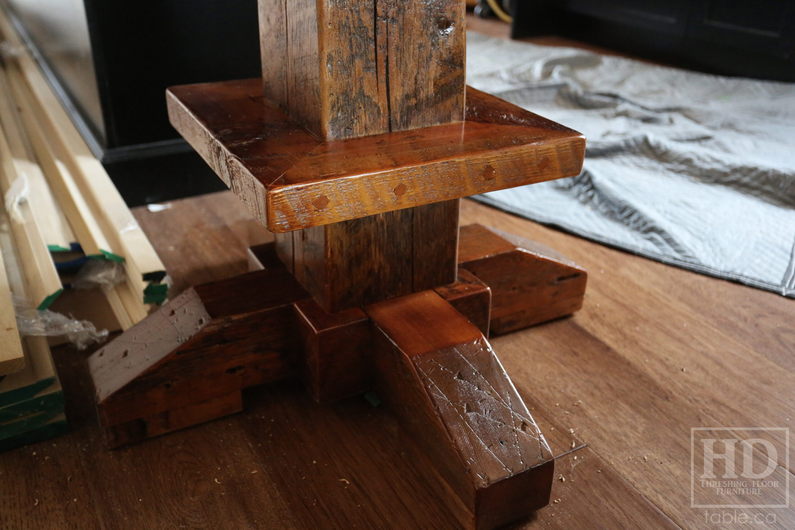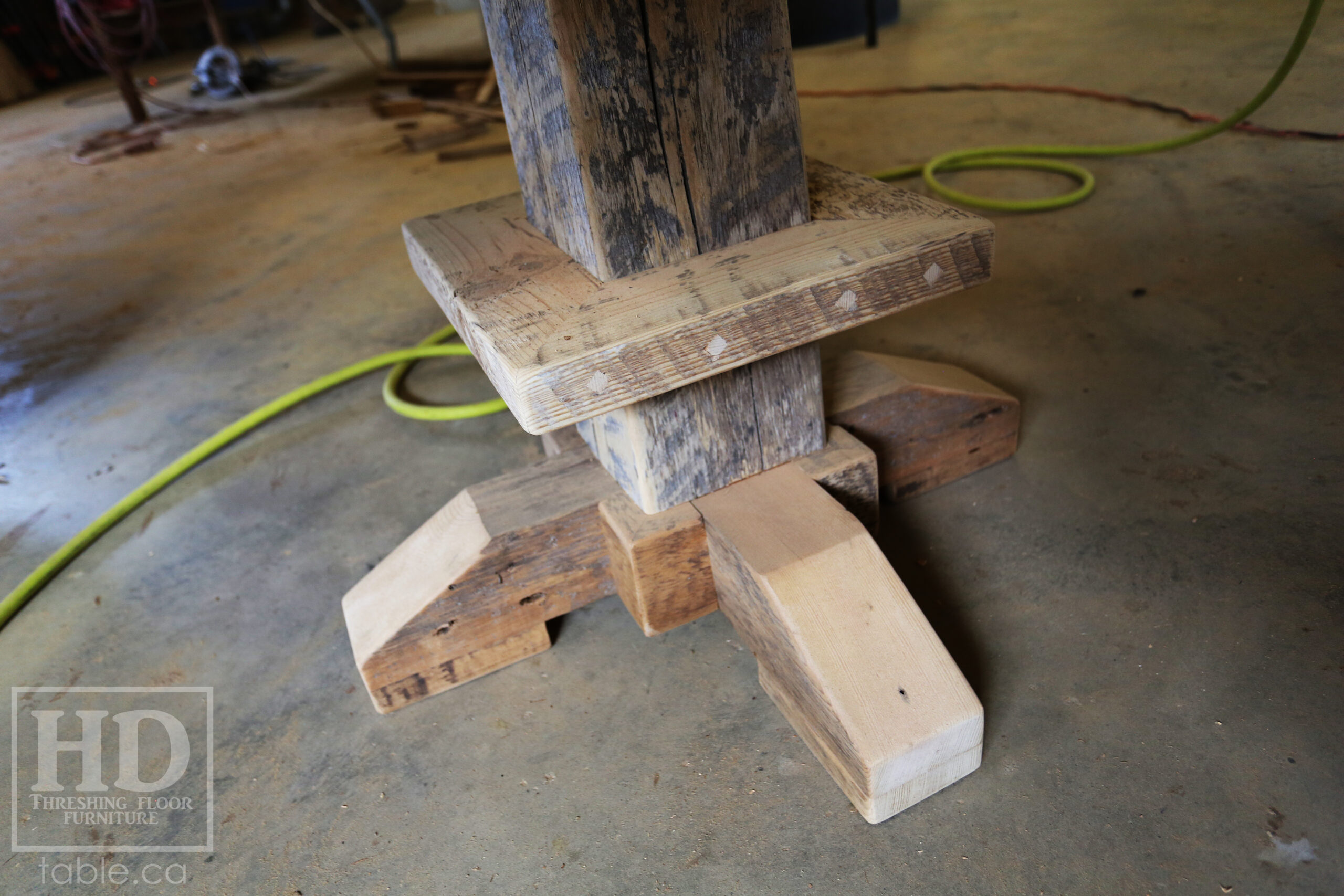 Project Summary: Ontario Barnwood Island Top + Post we made for a Fort Erie, Ontario home – Hand-Hewn Post Pedestal at End [to extend island size] – Reclaimed Hemlock Threshing Floor Construction – Original edges & distressing maintained – Premium epoxy + satin polyurethane finish – www.table.ca