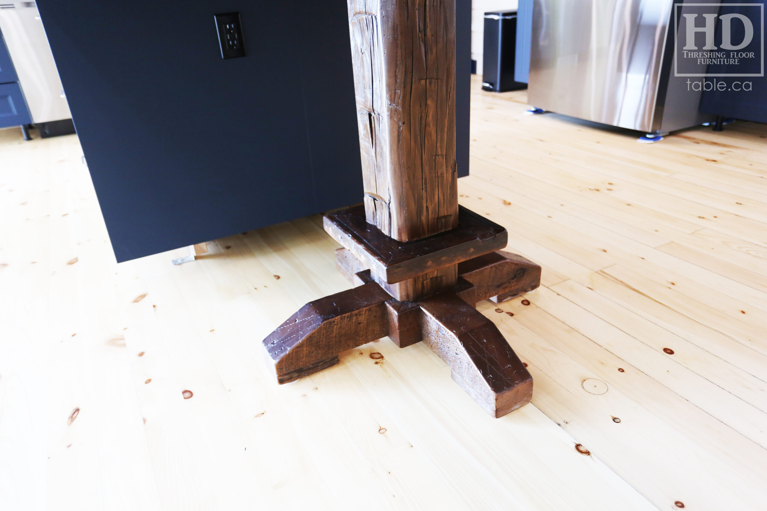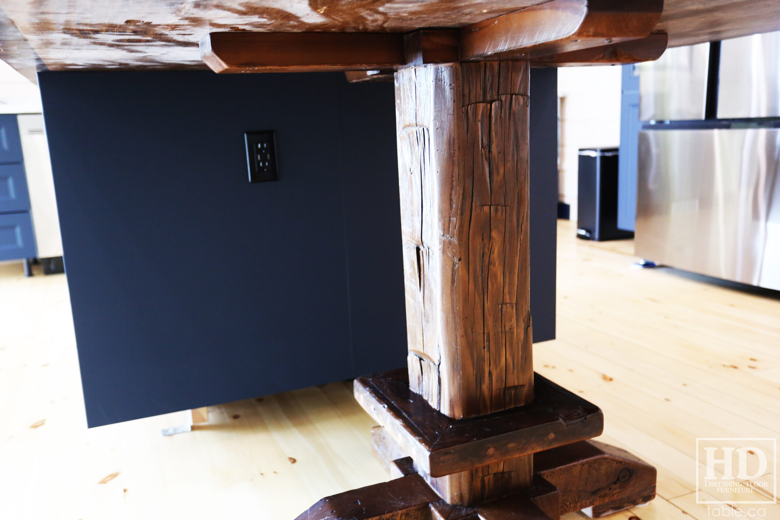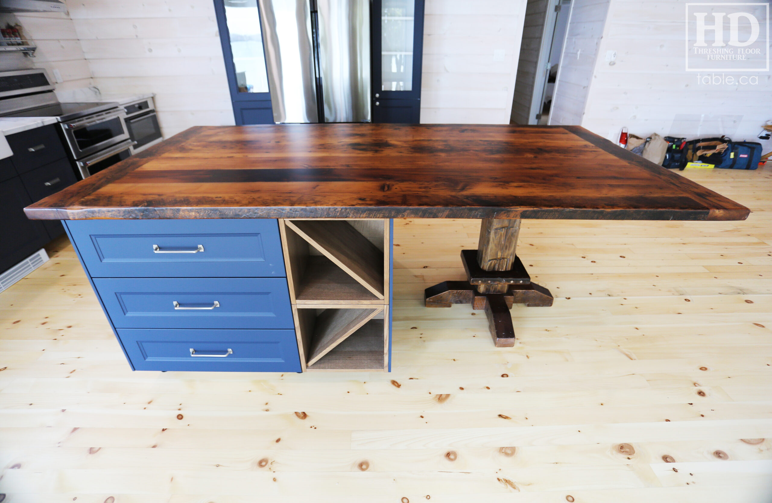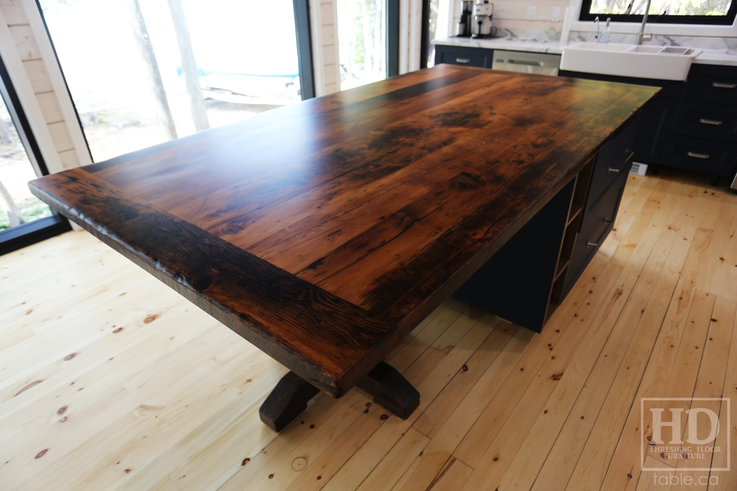 Project details: 98″ Ontario Barnwood Island Top & post we made for a Wiarton, Ontario Home – 52″ wide – 34″ height – Hand-Hewn Post at End to Extend Island Top – 2″ Hemlock Threshing Floor Construction – Original barnwood edges & distressing maintained – Premium epoxy + matte polyurethane finish – www.table.ca
