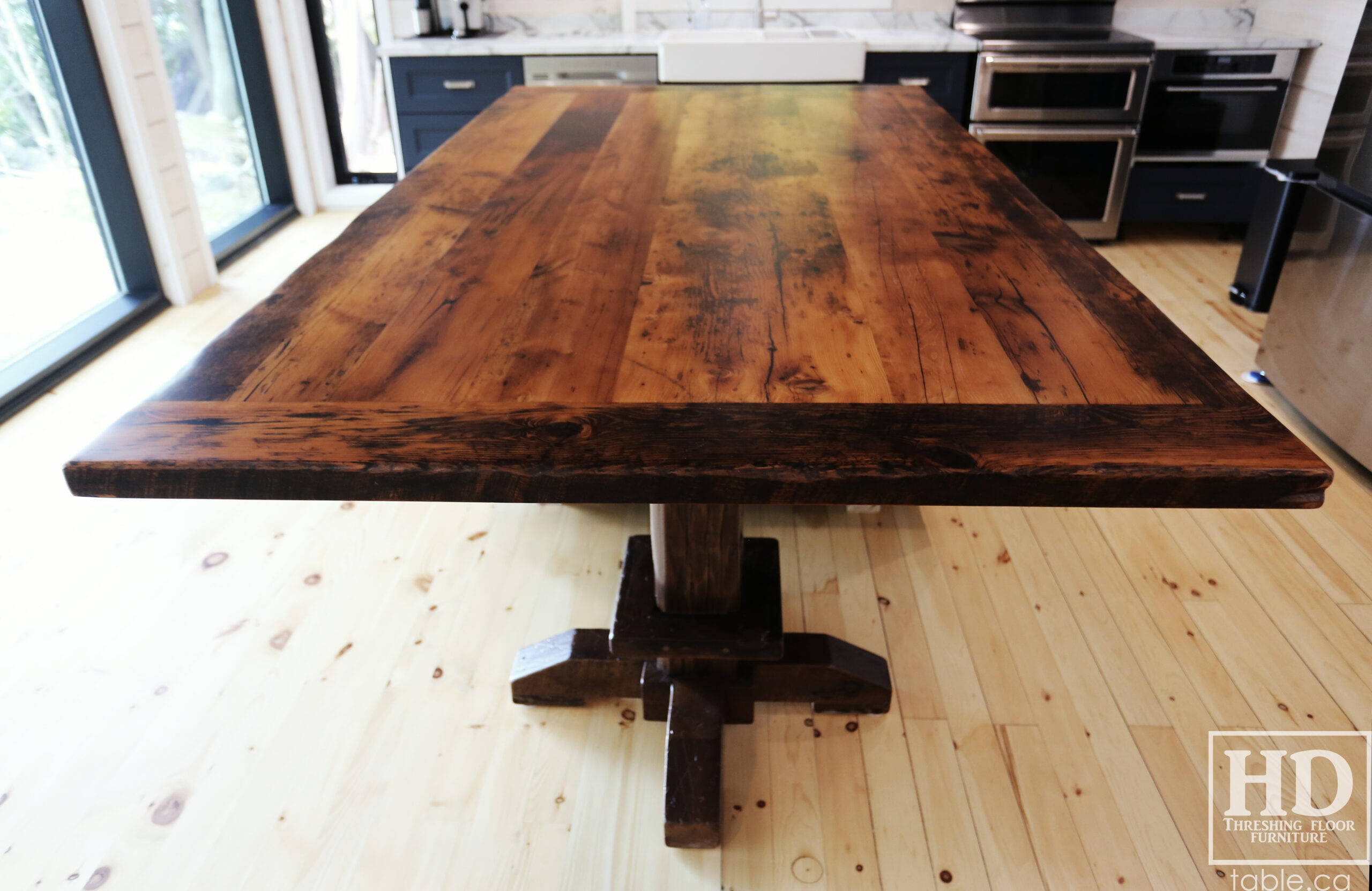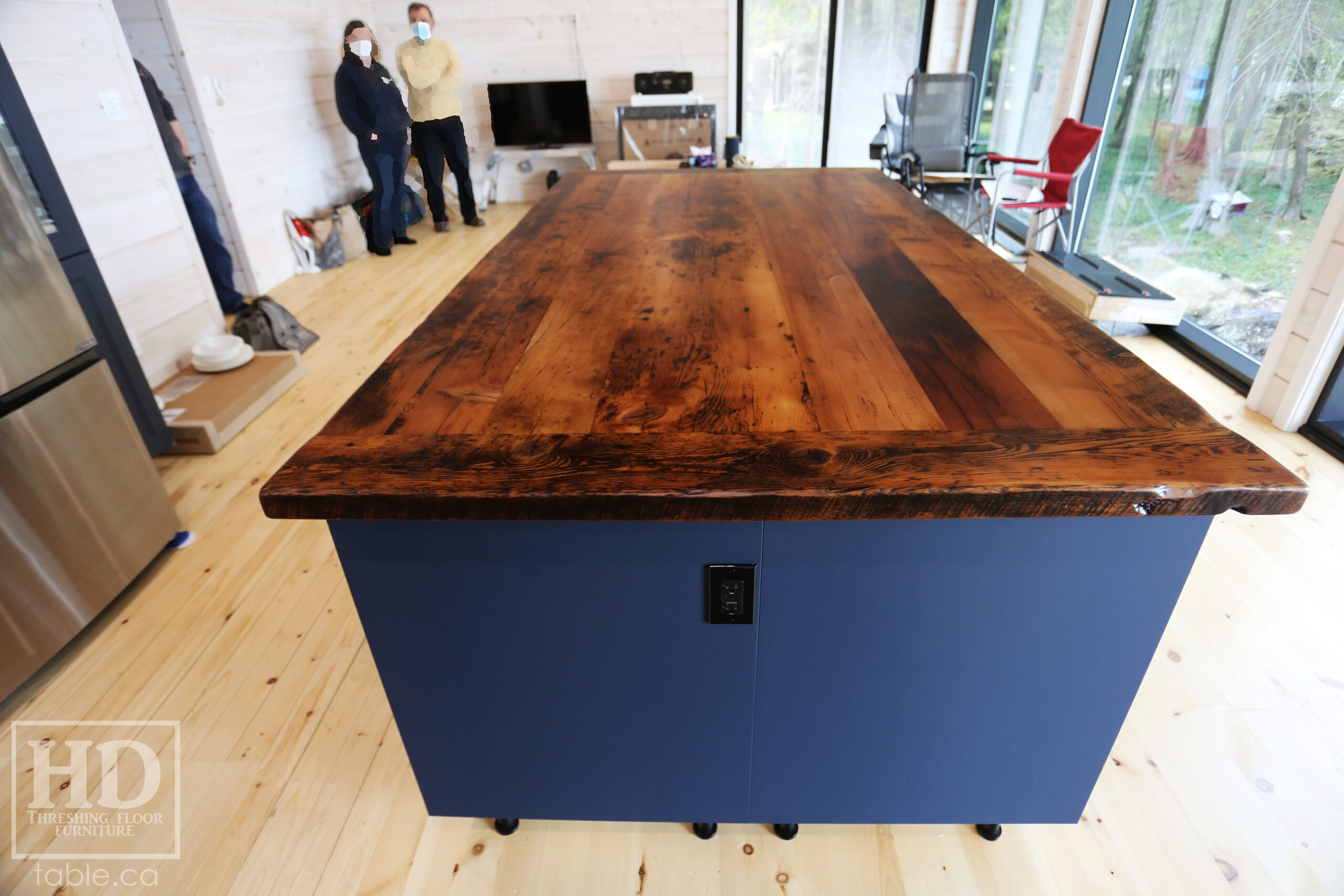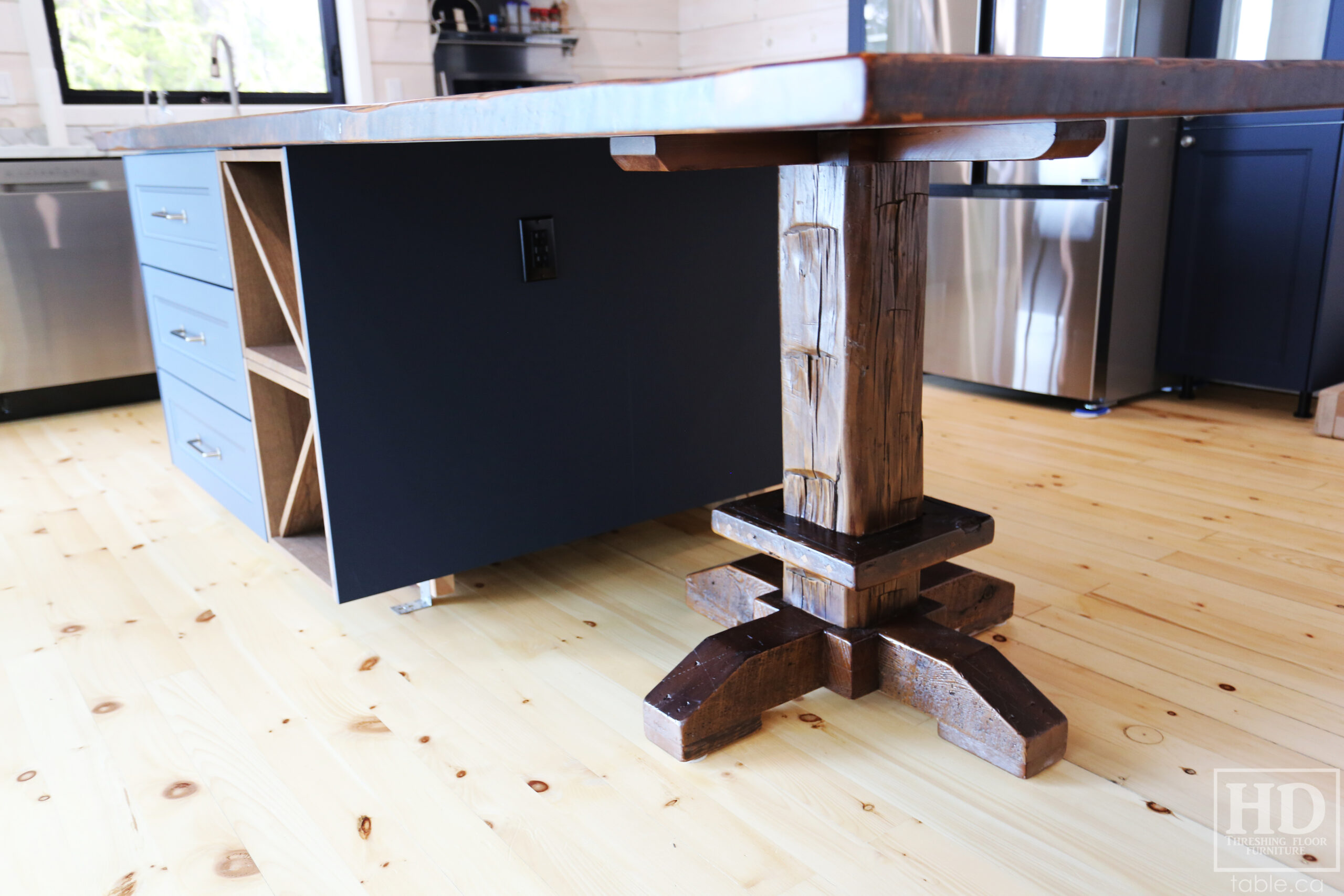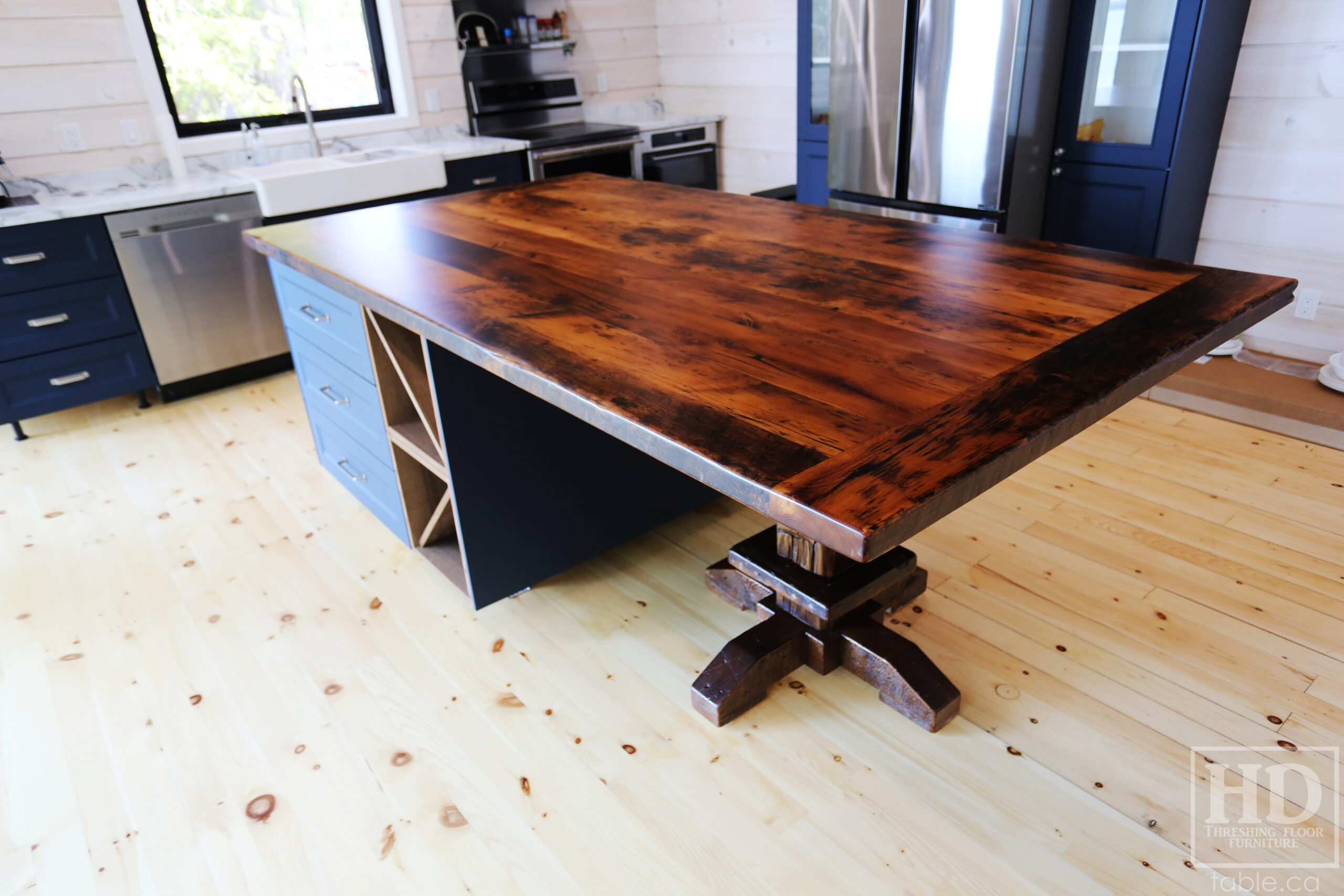 Project details: 98″ Ontario Barnwood Island Top & post we made for a Wiarton, Ontario Home – 52″ wide – 34″ height – Hand-Hewn Post at End to Extend Island Top – 2″ Hemlock Threshing Floor Construction – Original barnwood edges & distressing maintained – Premium epoxy + matte polyurethane finish – www.table.ca