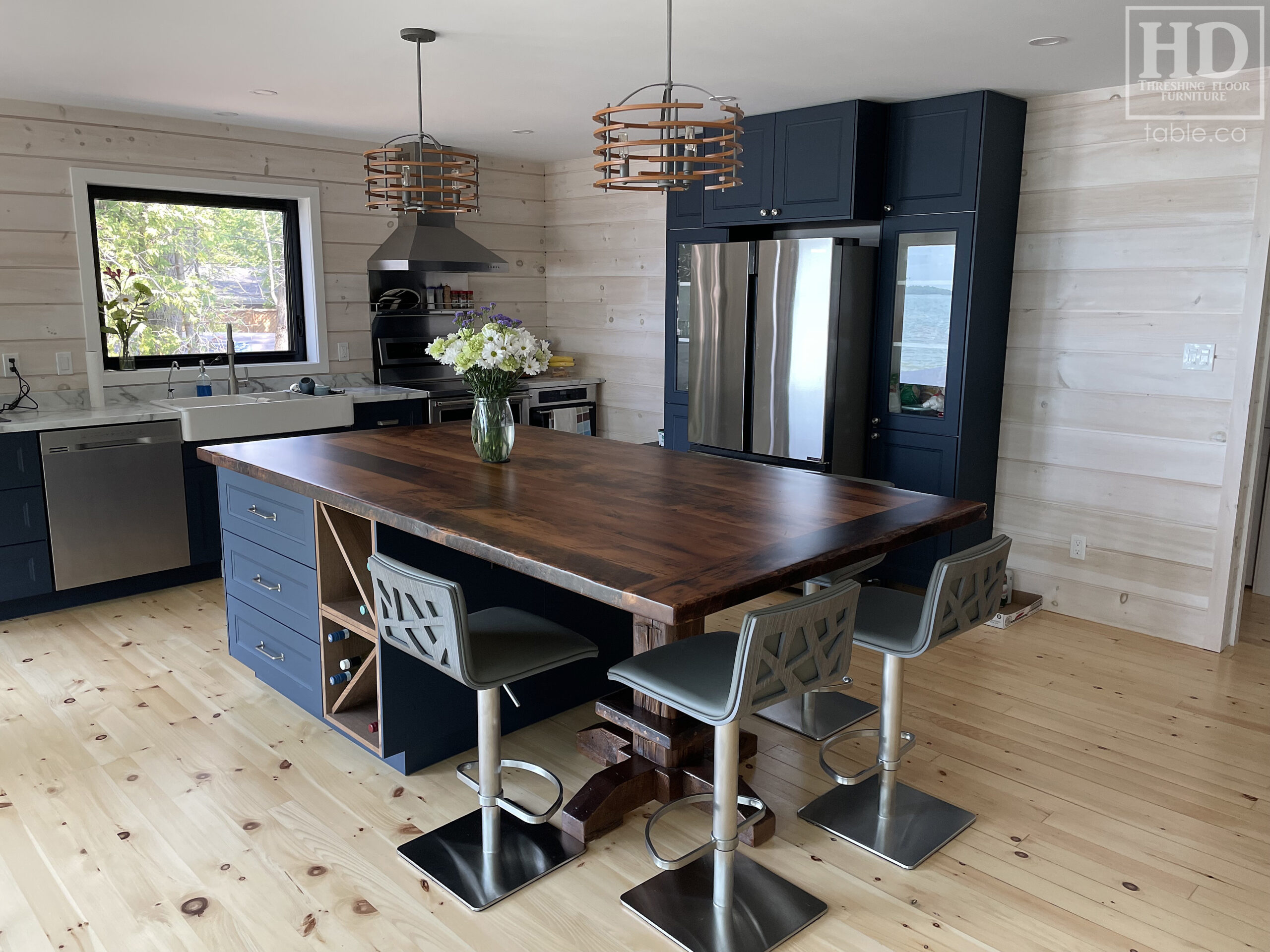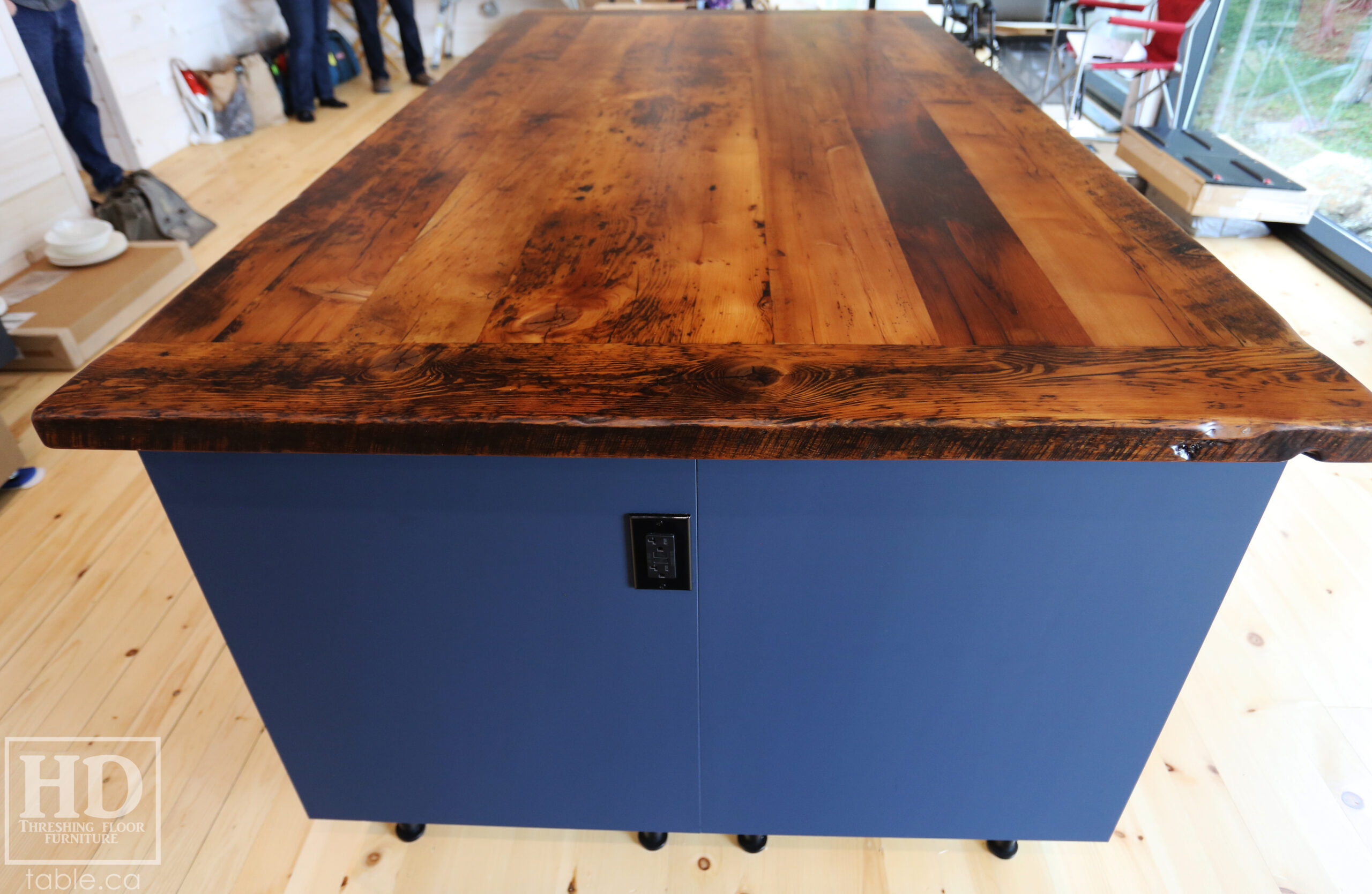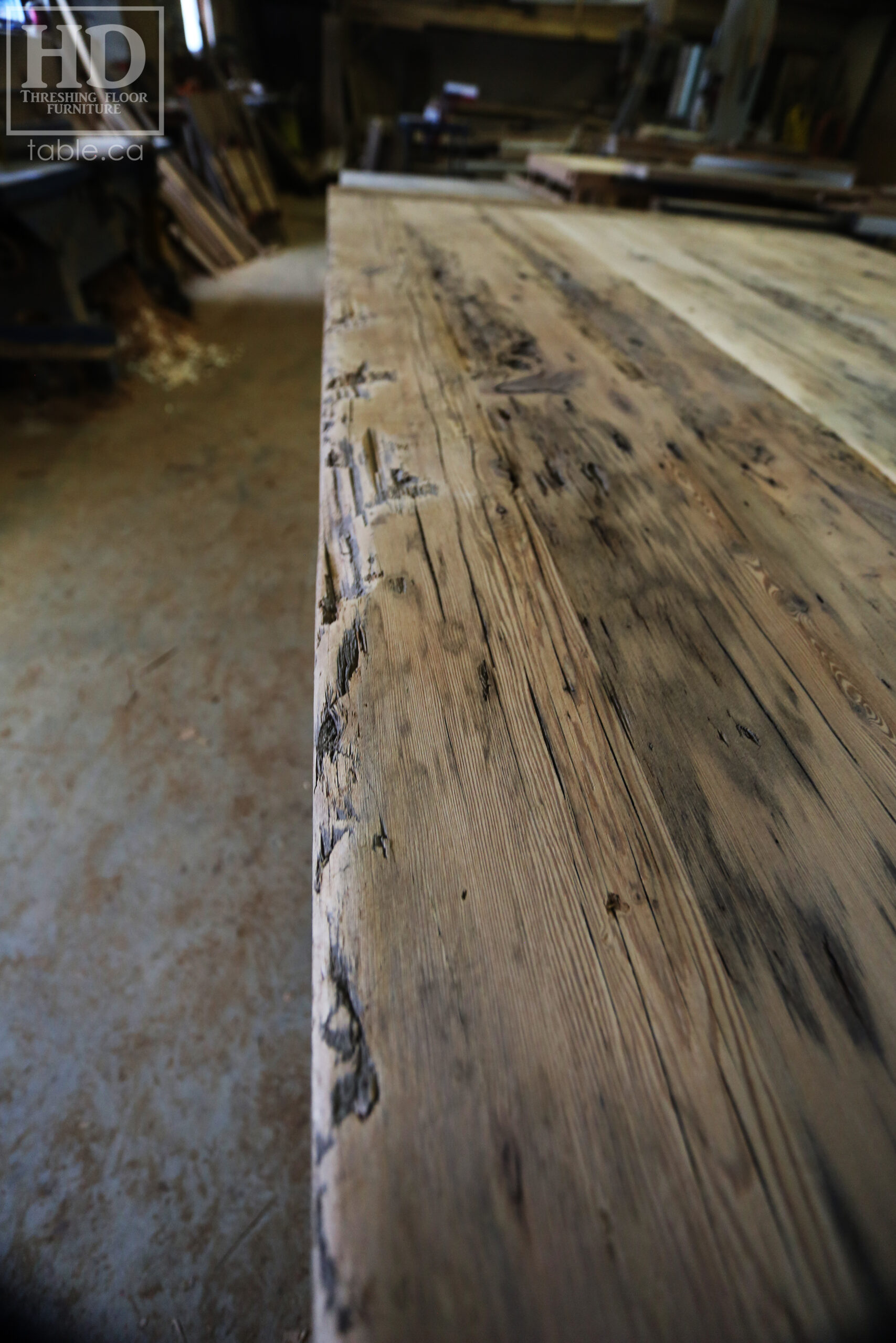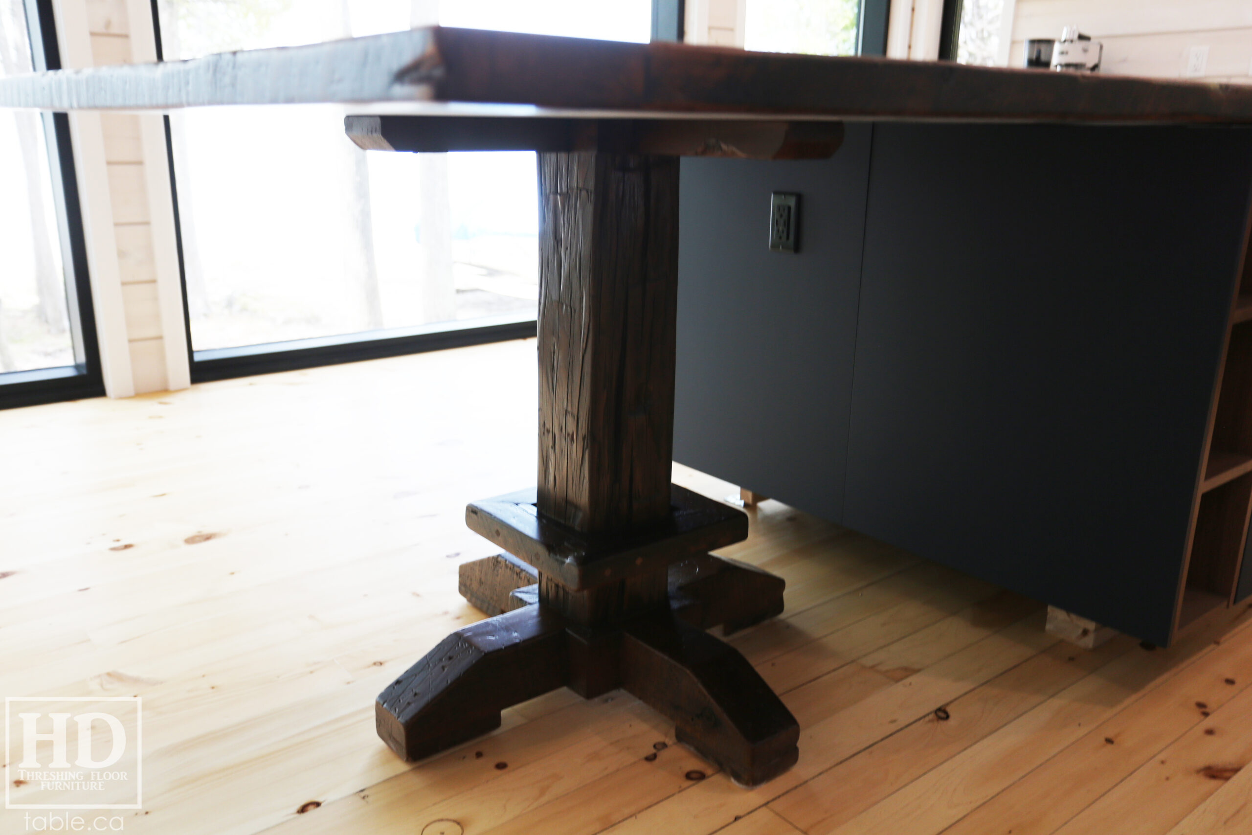 Project details: 98″ Ontario Barnwood Island Top & post we made for a Wiarton, Ontario Home – 52″ wide – 34″ height – Hand-Hewn Post at End to Extend Island Top – 2″ Hemlock Threshing Floor Construction – Original barnwood edges & distressing maintained – Premium epoxy + matte polyurethane finish – www.table.ca