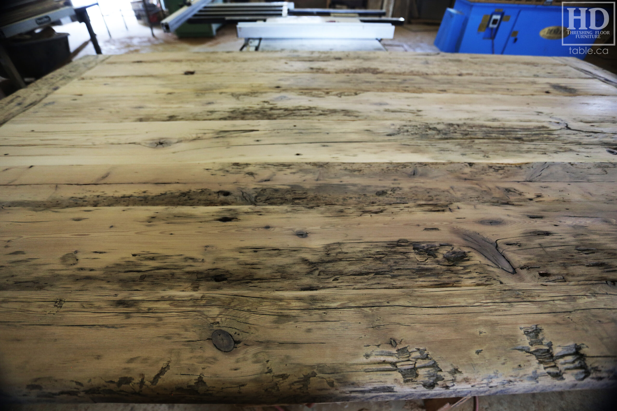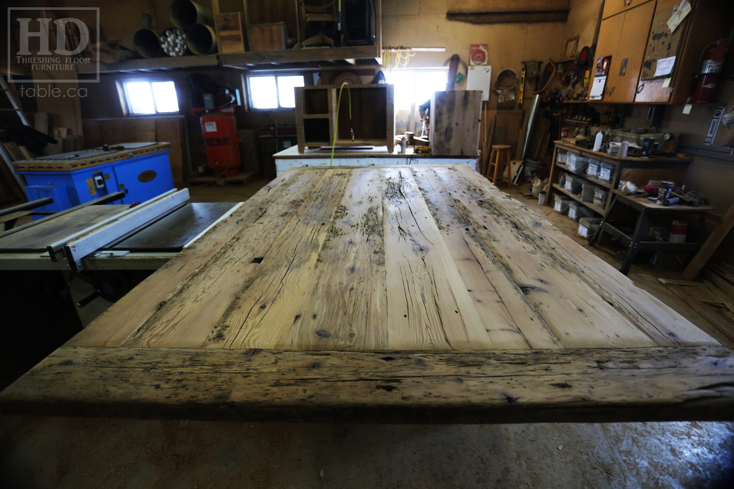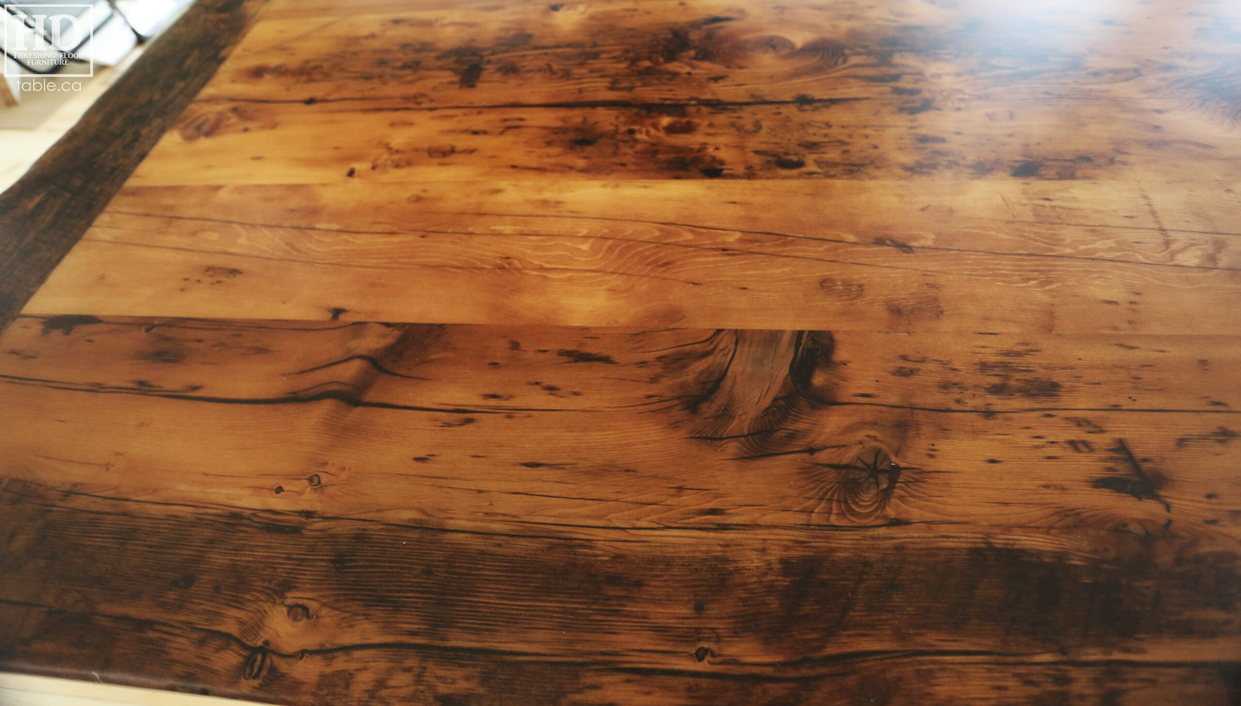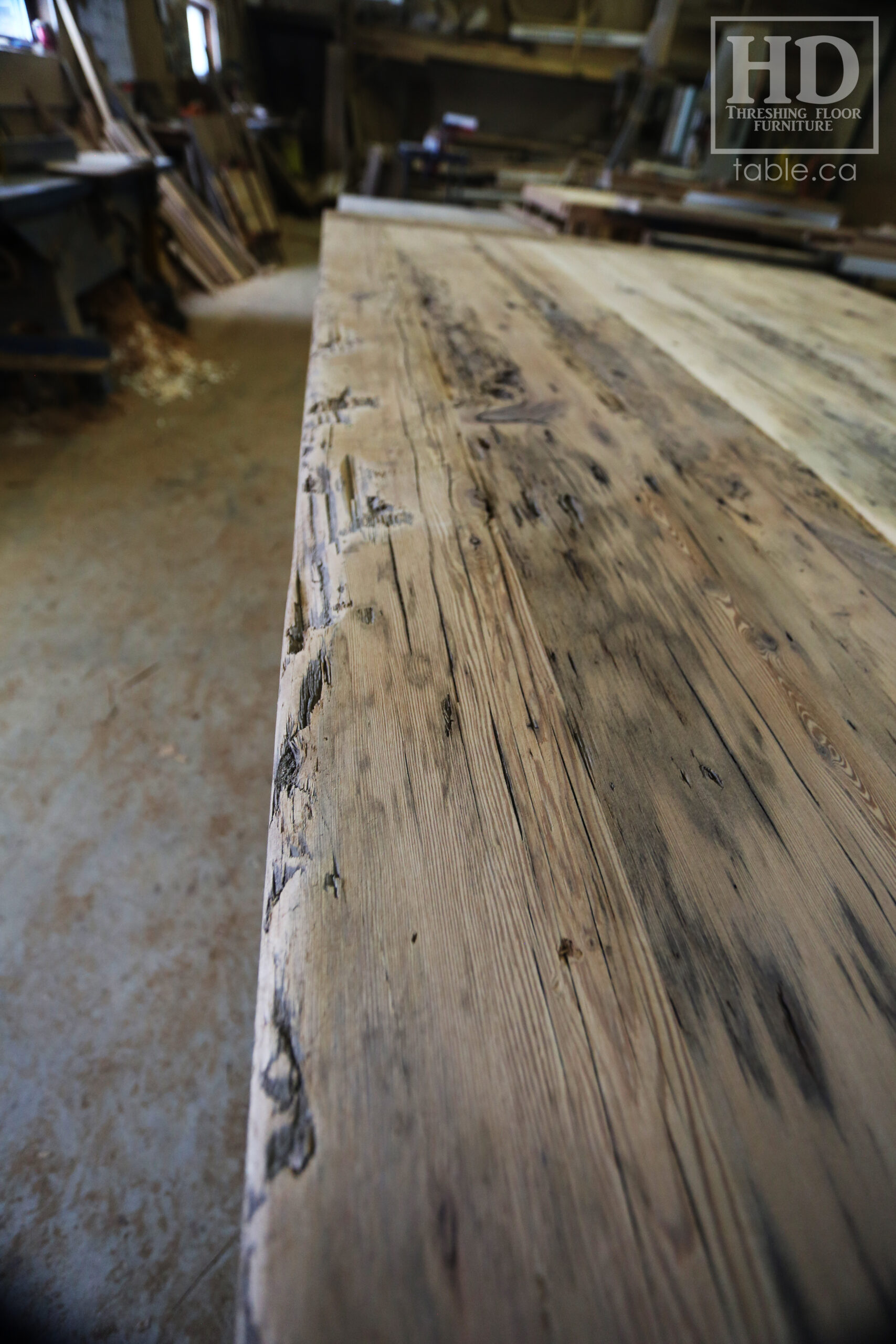 Project details: 98″ Ontario Barnwood Island Top & post we made for a Wiarton, Ontario Home – 52″ wide – 34″ height – Hand-Hewn Post at End to Extend Island Top – 2″ Hemlock Threshing Floor Construction – Original barnwood edges & distressing maintained – Premium epoxy + matte polyurethane finish – www.table.ca