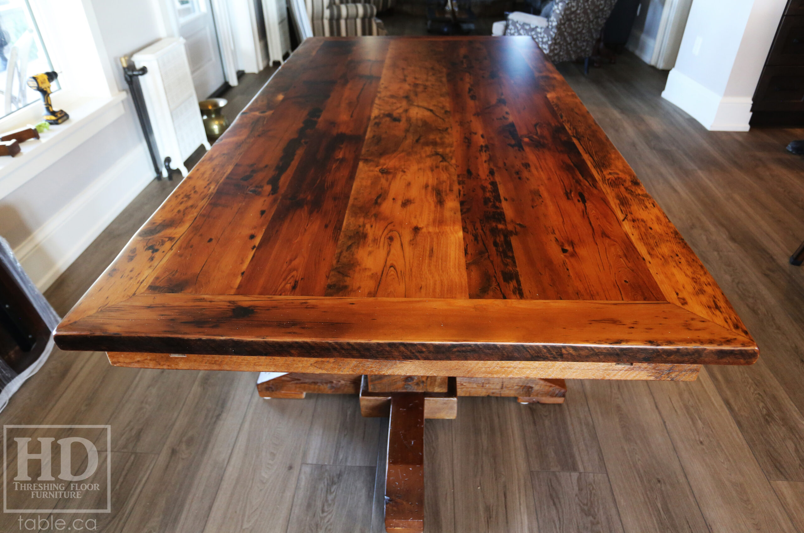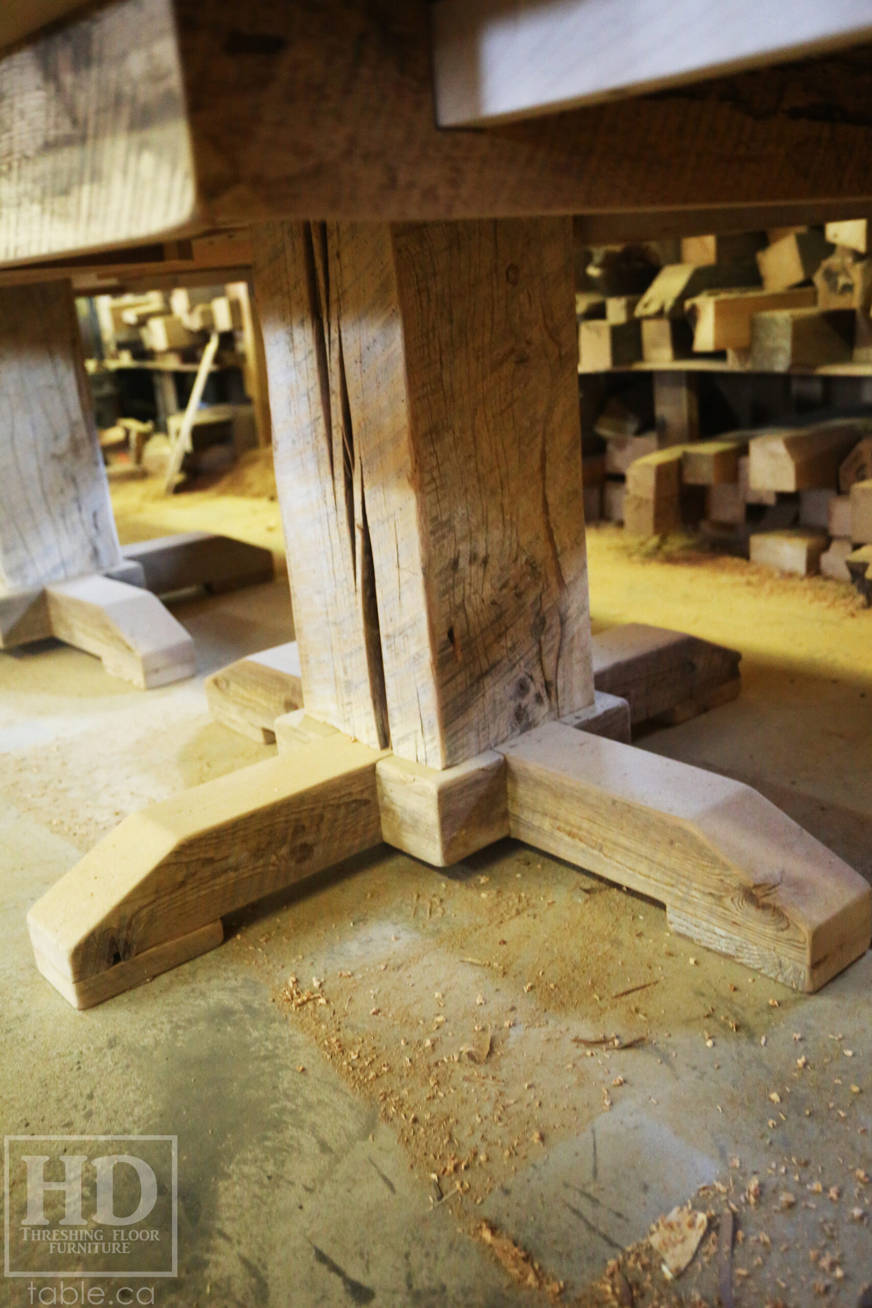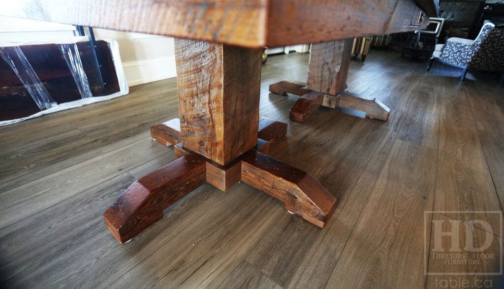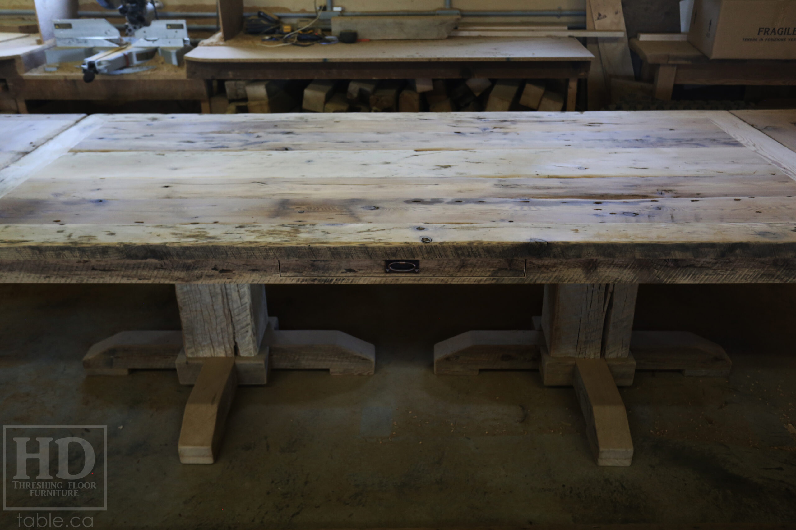 Many assume you can only have skirting on a harvest table [4 leg style]. While it’s true most often only harvest tables have the skirting [given the legs are generally bolted into the skirting], we can do skirting on post styles as well. Most often this is done to add drawers. The Beamsville reclaimed wood pedestal table project was a classic example of this: