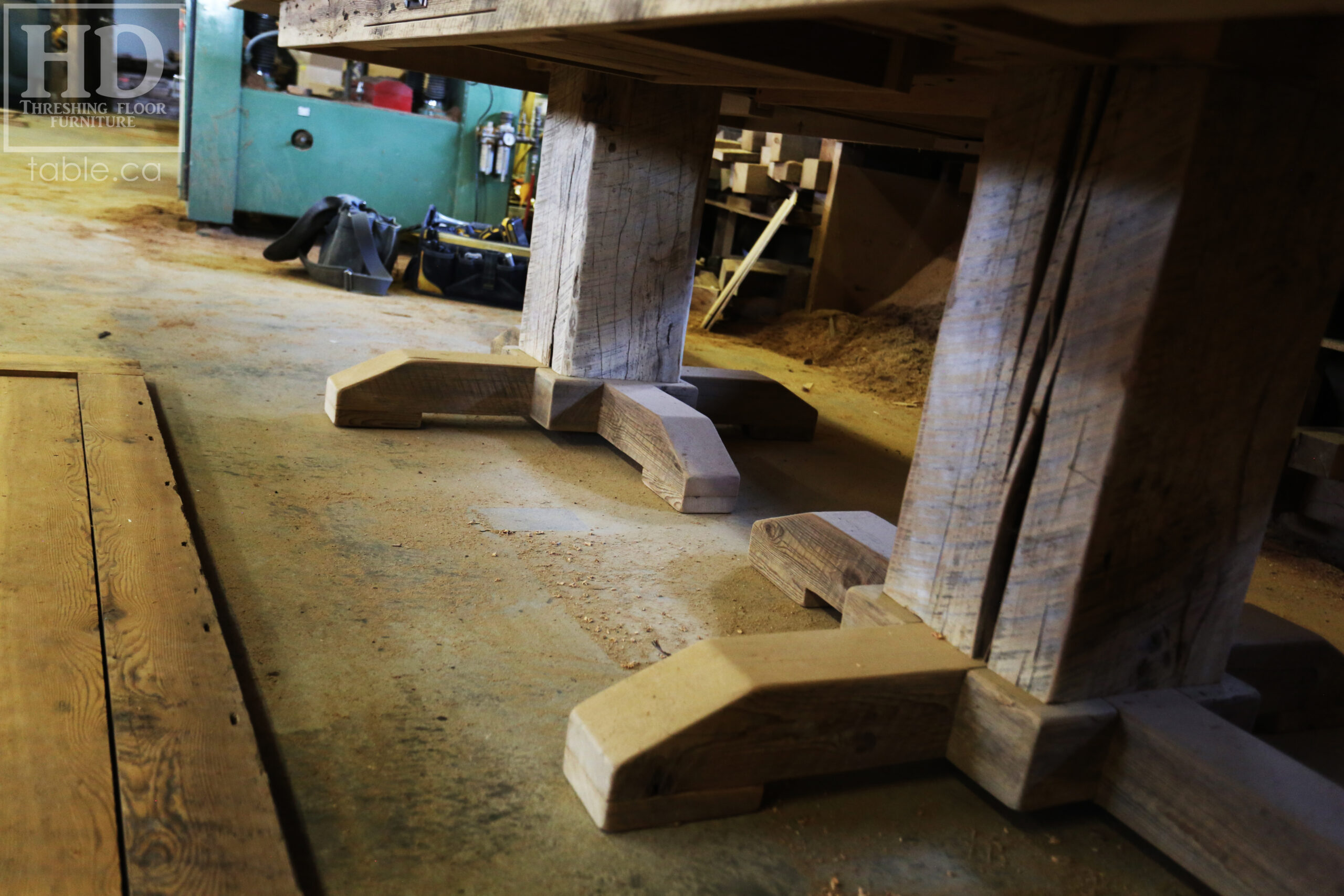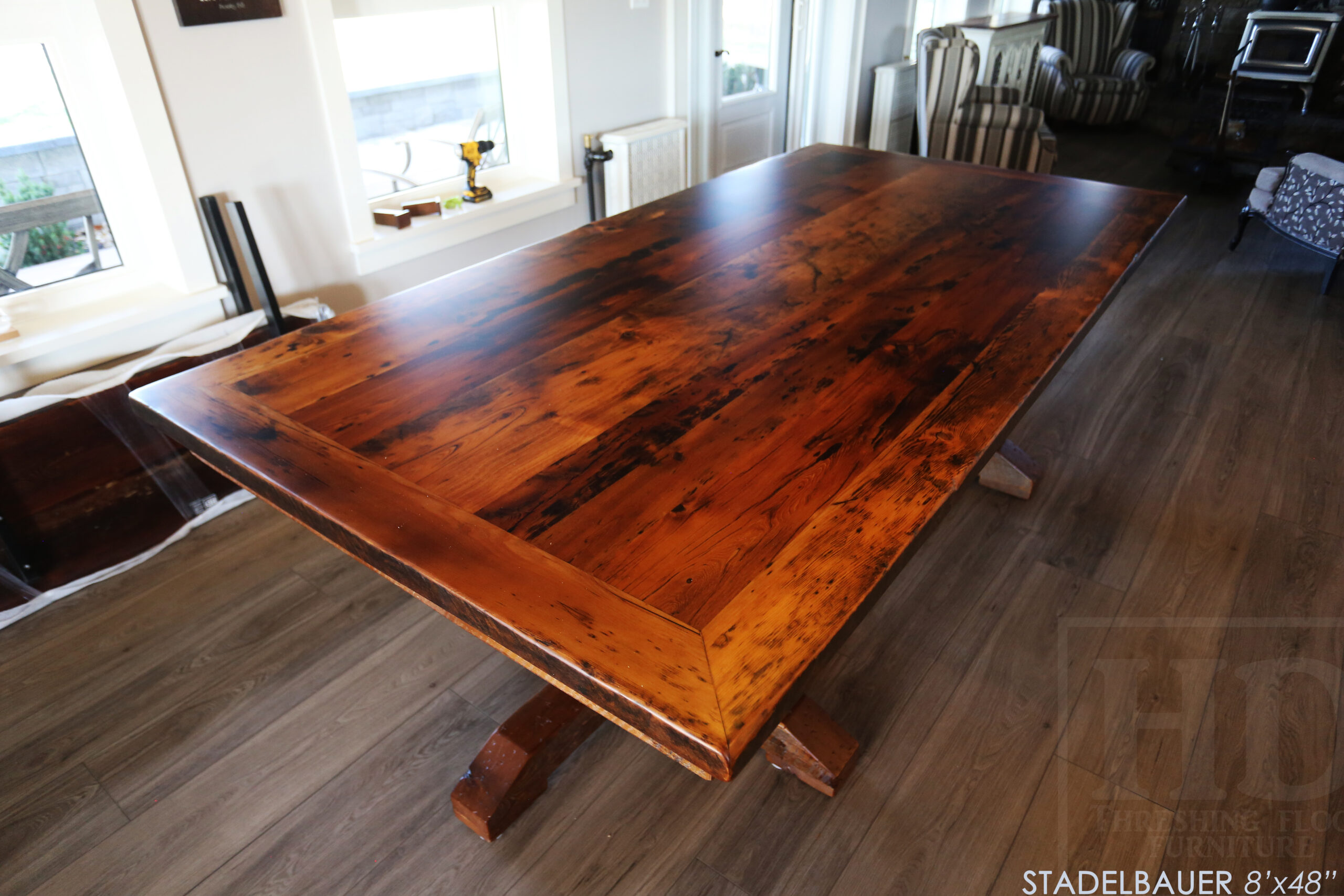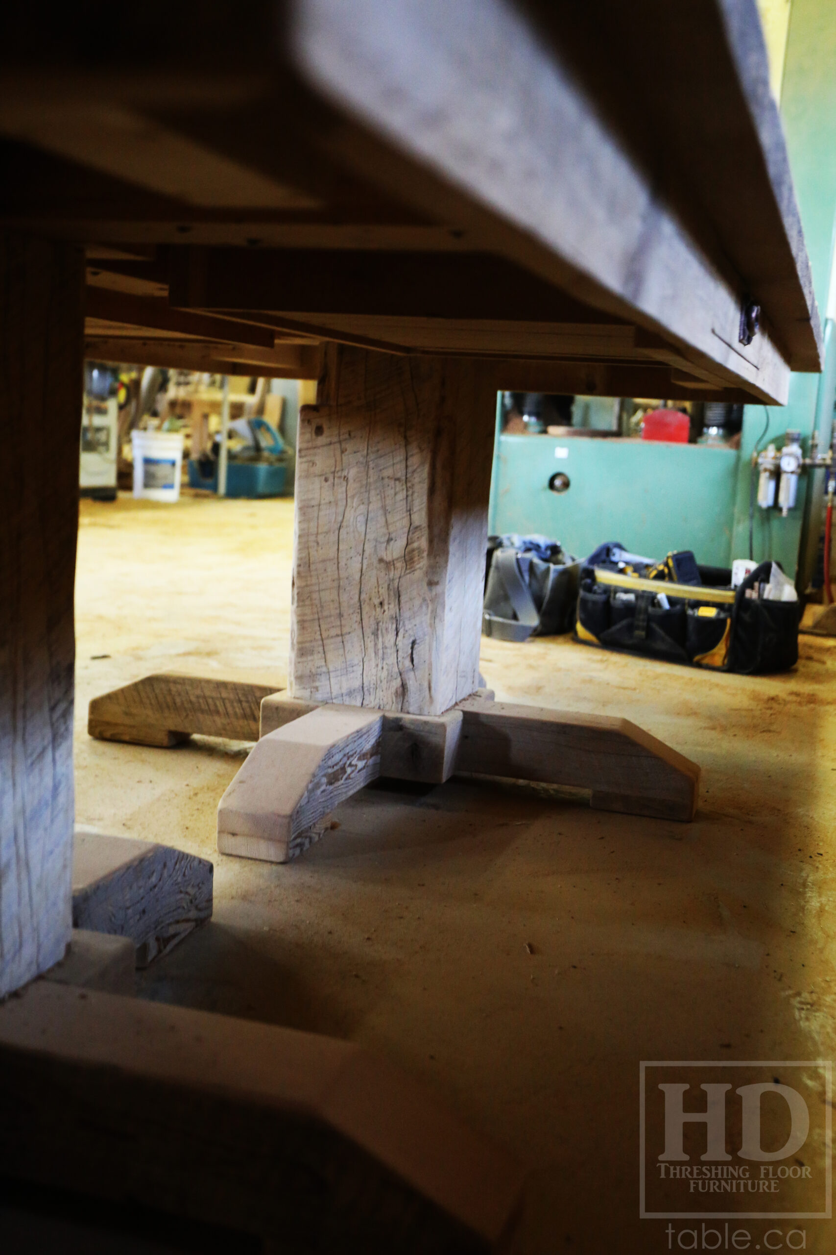 Many assume you can only have skirting on a harvest table [4 leg style]. While it’s true most often only harvest tables have the skirting [given the legs are generally bolted into the skirting], we can do skirting on post styles as well. Most often this is done to add drawers. The Beamsville reclaimed wood pedestal table project was a classic example of this: