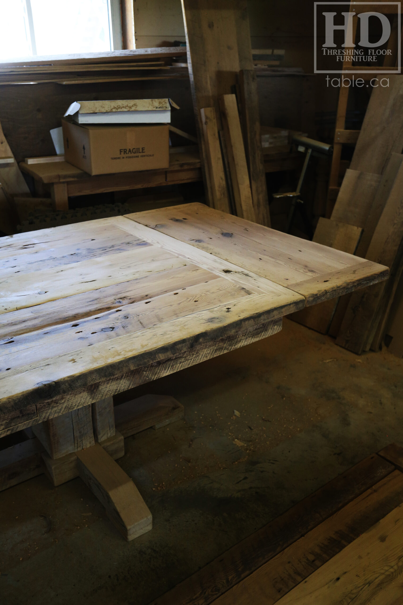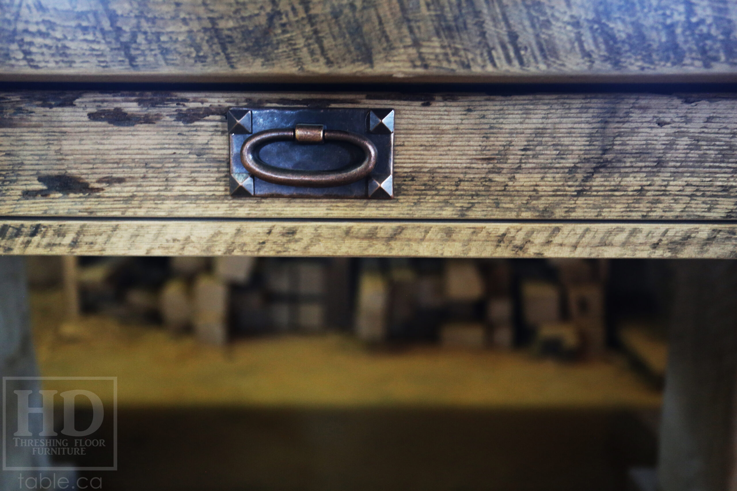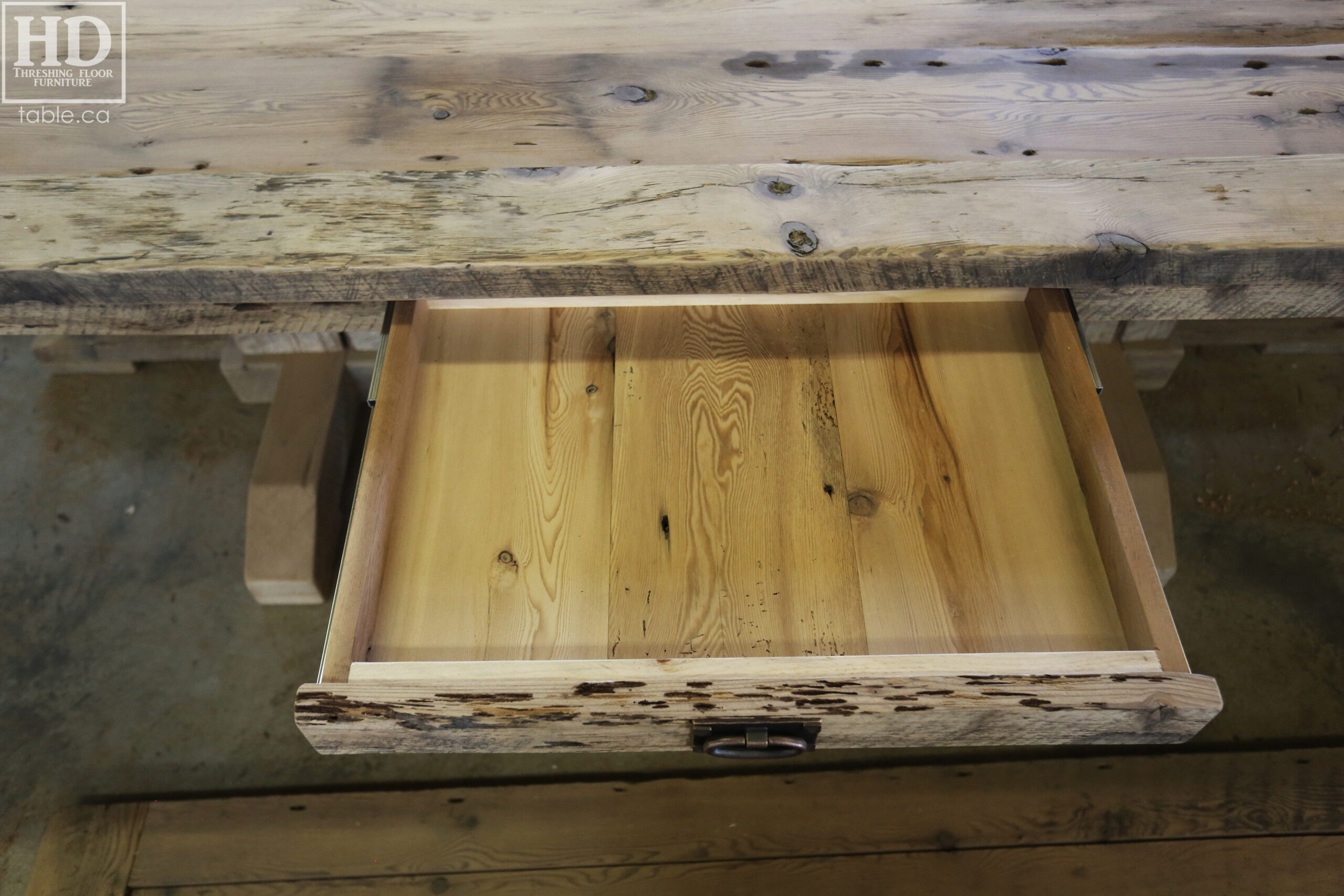 Project summary: 8’ Reclaimed Ontario Barnwood Table we made for a Beamsville, Ontario home – 48†wide – Hand Hewn Pedestals Base – Old Growth Hemlock Threshing Floor Construction – Original edges & distressing maintained – Bread Edge Ends – Premium epoxy + matte polyurethane finish – [2] 18†leaf extensions – [2] Drawers – Lee Valley Hardware Cast Brass Handle – www.table.ca