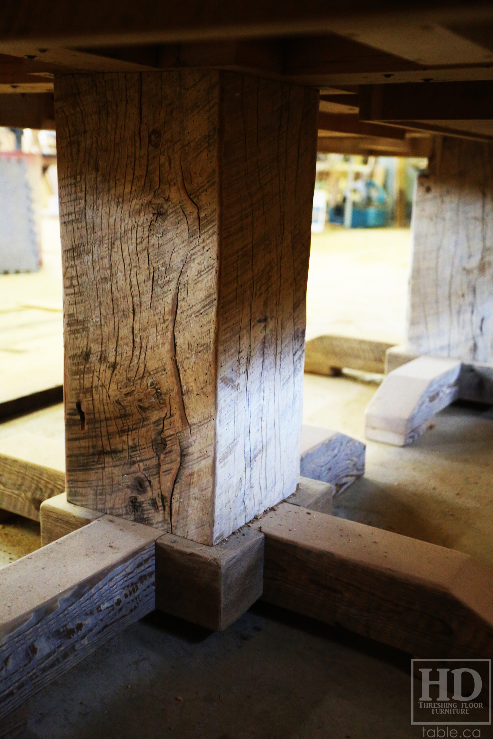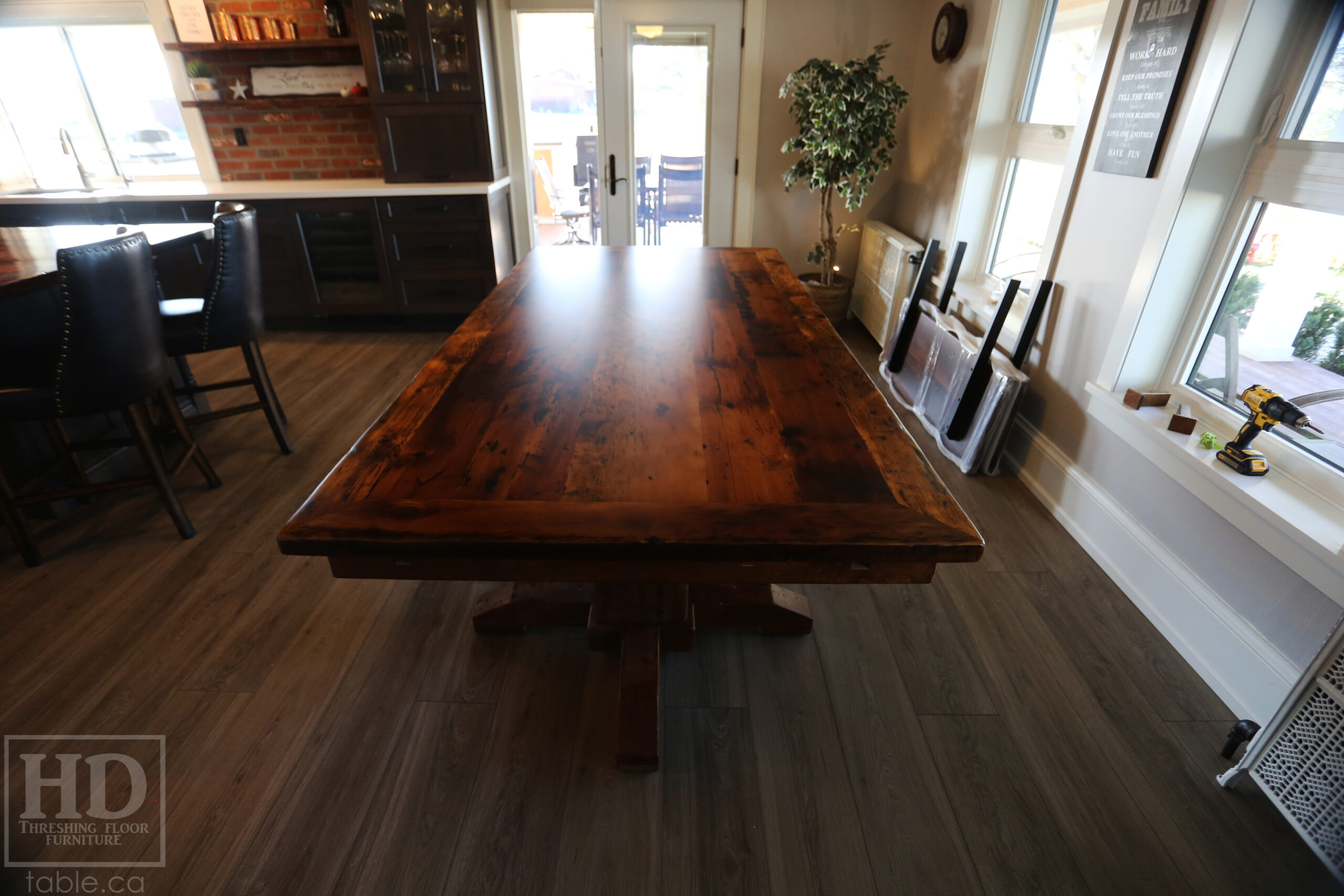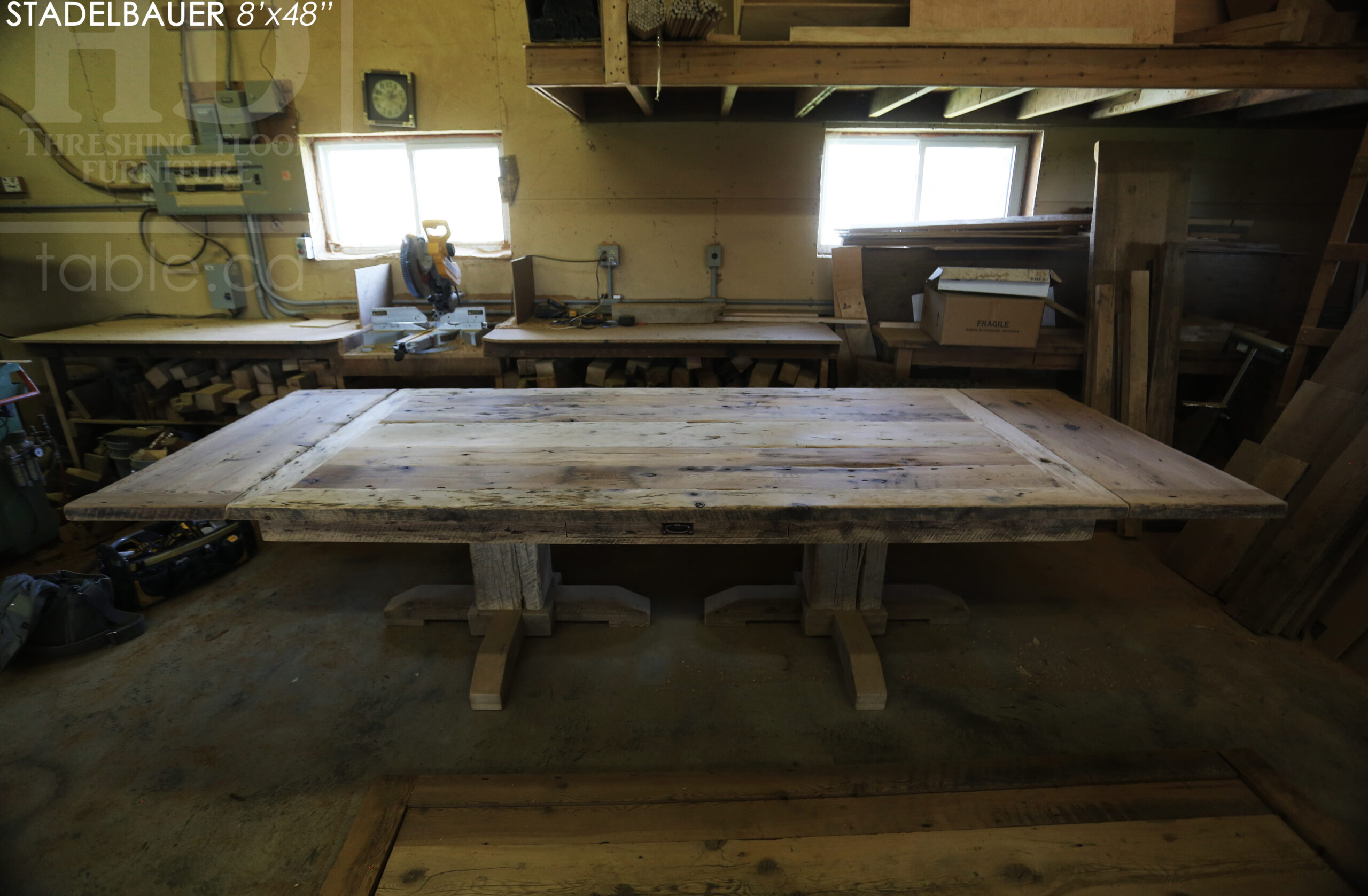 Project summary: 8’ Reclaimed Ontario Barnwood Table we made for a Beamsville, Ontario home – 48†wide – Hand Hewn Pedestals Base – Old Growth Hemlock Threshing Floor Construction – Original edges & distressing maintained – Bread Edge Ends – Premium epoxy + matte polyurethane finish – [2] 18†leaf extensions – [2] Drawers – Lee Valley Hardware Cast Brass Handle – www.table.ca