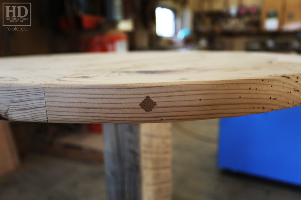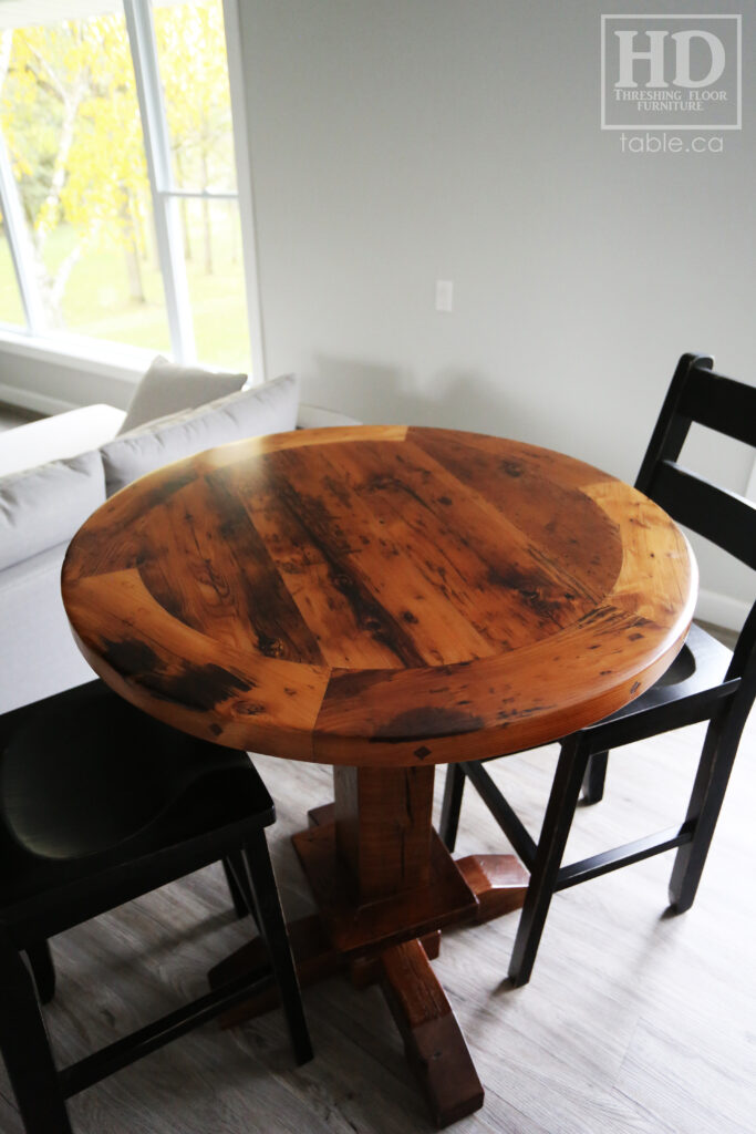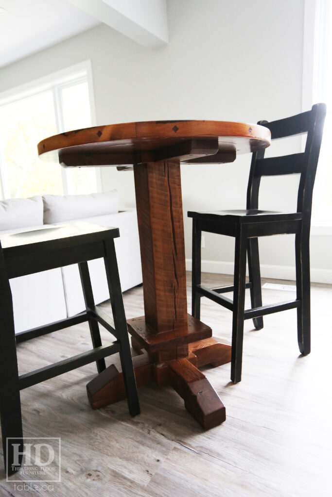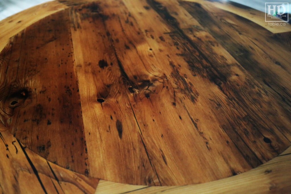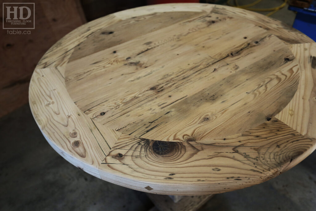 Project Summary: 36″ Recaimed Ontario Barnwood Round we made for a Mount Forest, Ontario Home – 42″ [Bar] Height / Foot Rest – Hemlock Threshing Floor Construction – Original edges & distressing maintained – Premium epoxy + satin polyurethane finish – www.table.ca