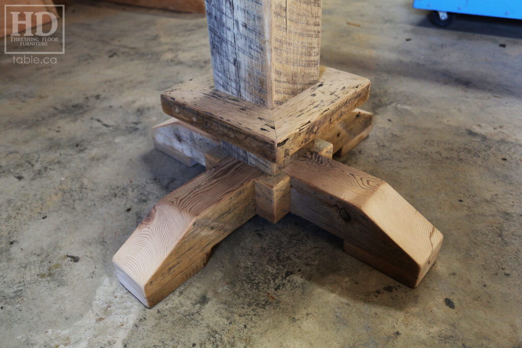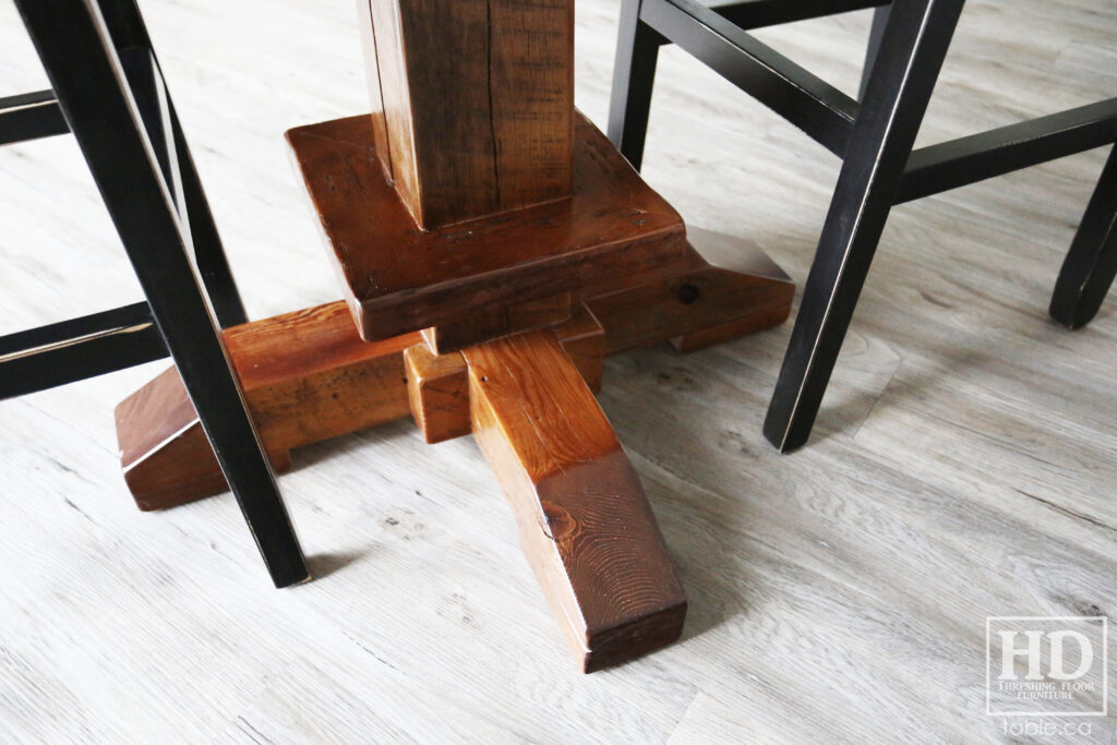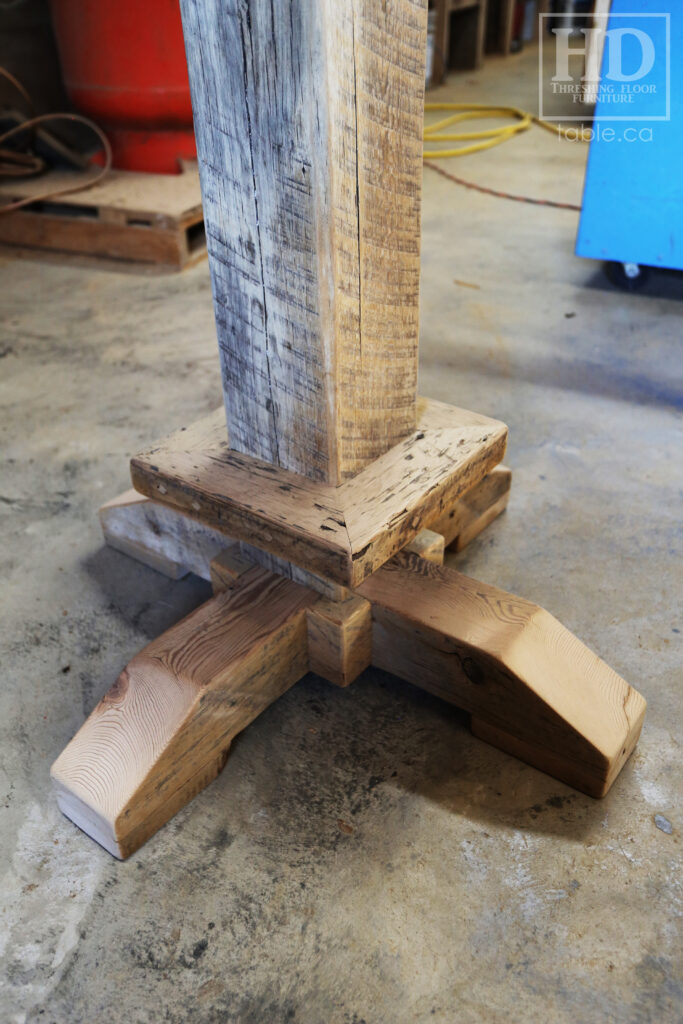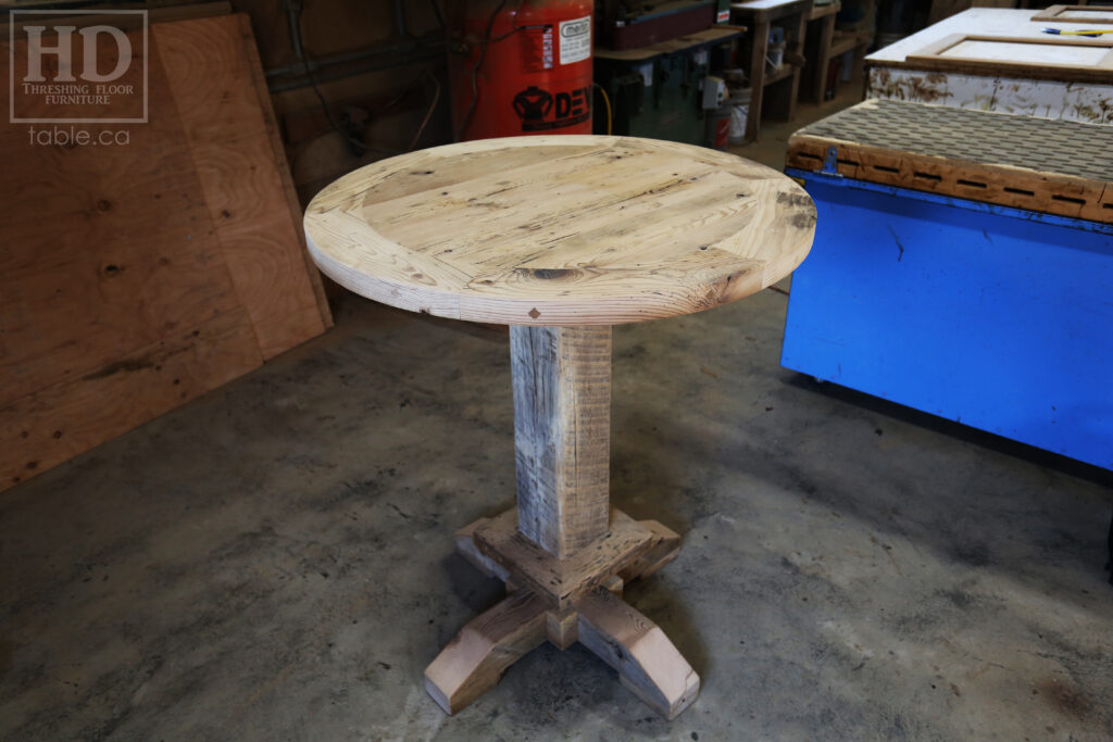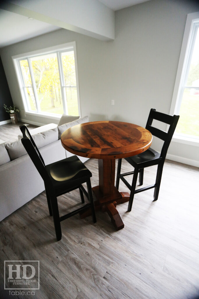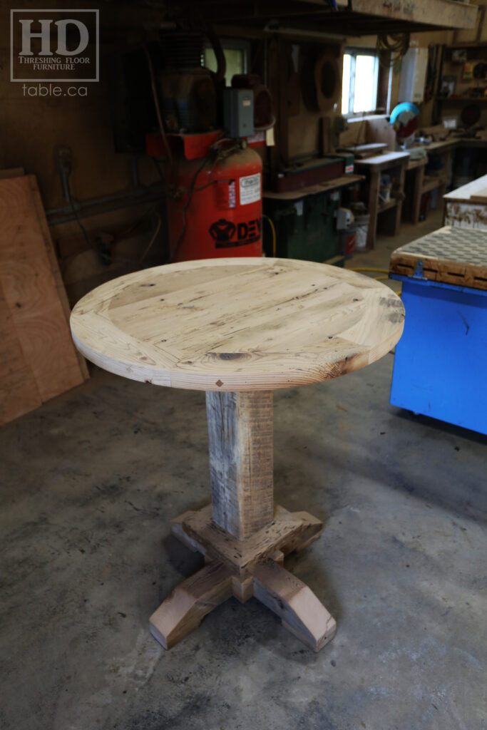 Project Summary: 36″ Recaimed Ontario Barnwood Round we made for a Mount Forest, Ontario Home – 42″ [Bar] Height / Foot Rest – Hemlock Threshing Floor Construction – Original edges & distressing maintained – Premium epoxy + satin polyurethane finish – www.table.ca