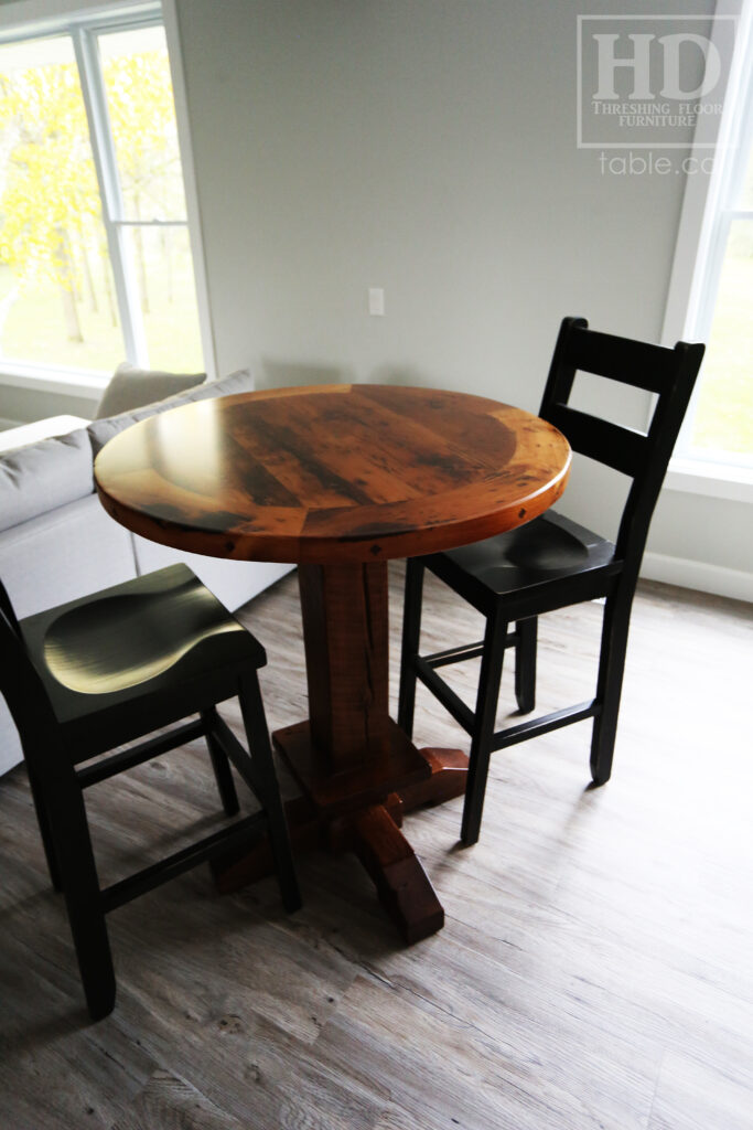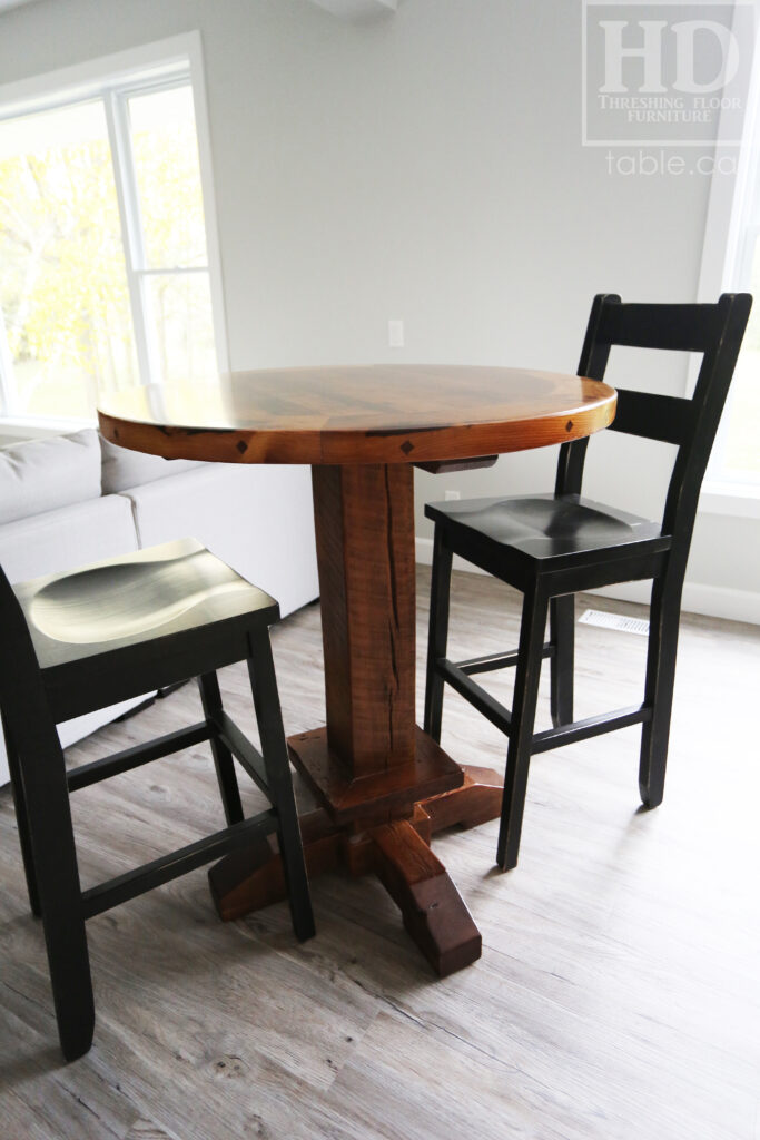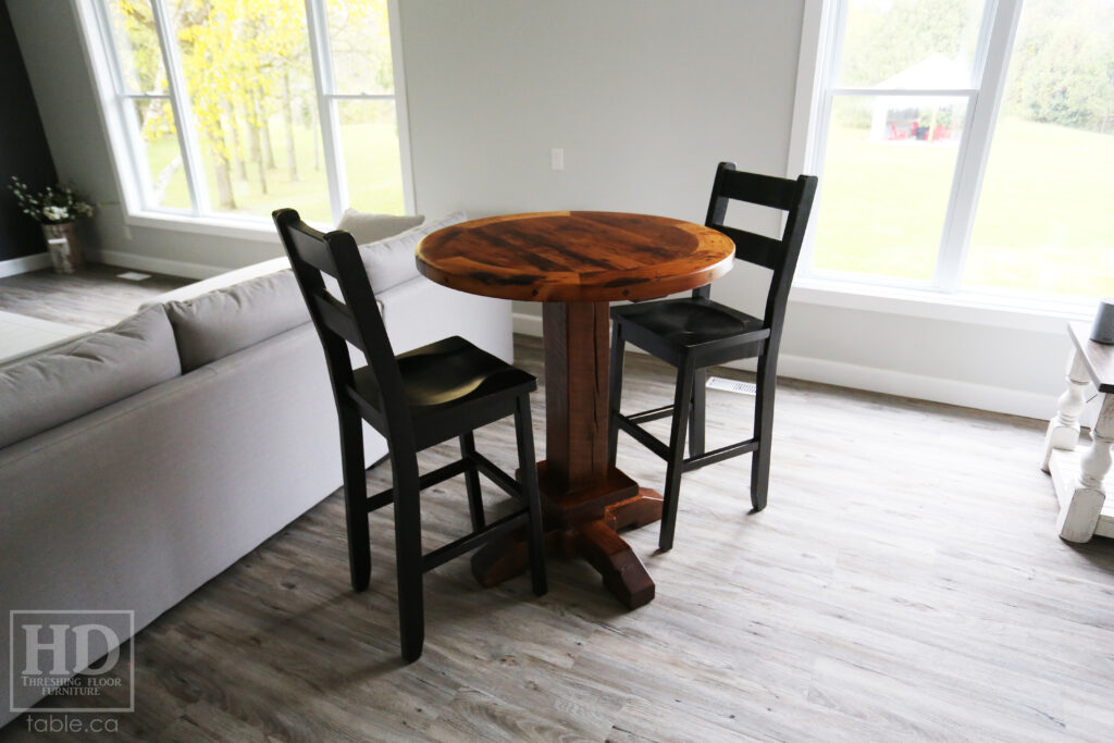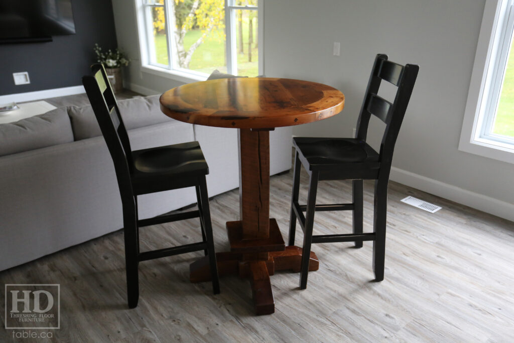 All our custom tables can be custom built to any height. The most common is 30″, 36″ [counter] or 42″ bar. Check out this reclaimed wood round table + wormy maple Ladder back chairs we delivered to Mount Forest last week: