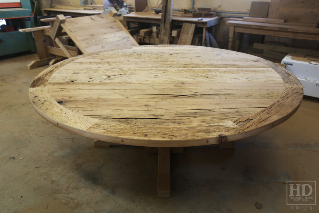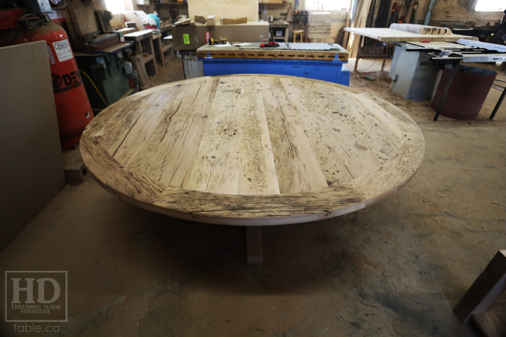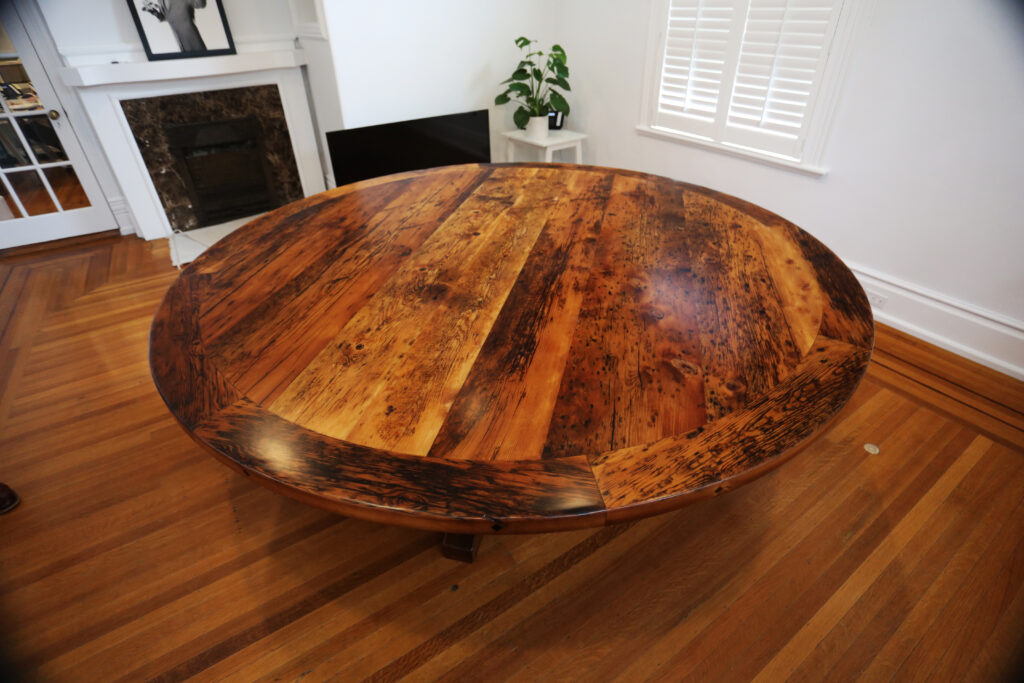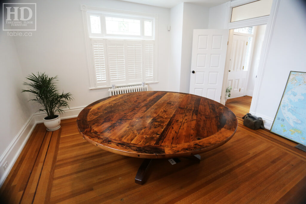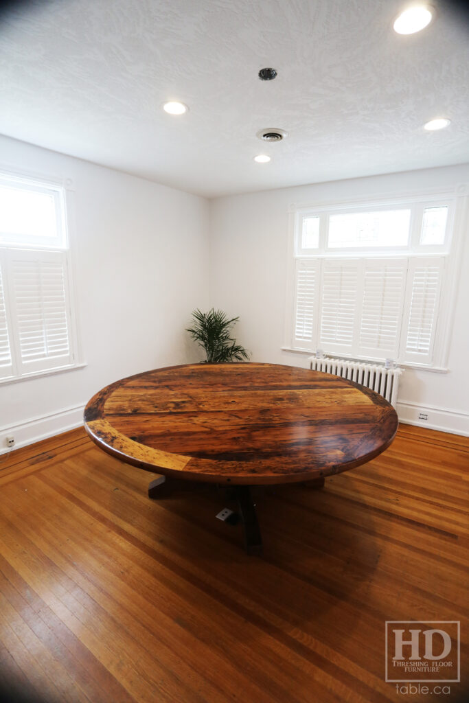 We custom build reclaimed wood round table from old Ontario barnwood to any size. Check out this large 84″ round reclaimed wood table we recently made for a Dundas office: